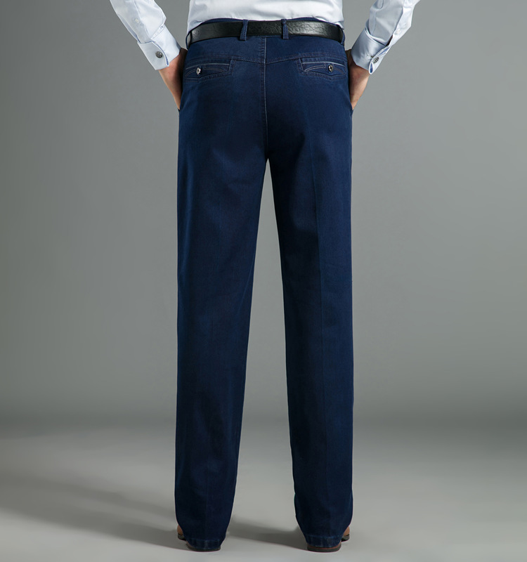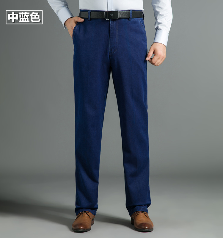 가을과 겨울 두꺼운 중년 청바지 남성용 탄성 하이 웨이스트 딥 가랑이 스트레이트 느슨한 아빠 캐주얼 롱 팬츠