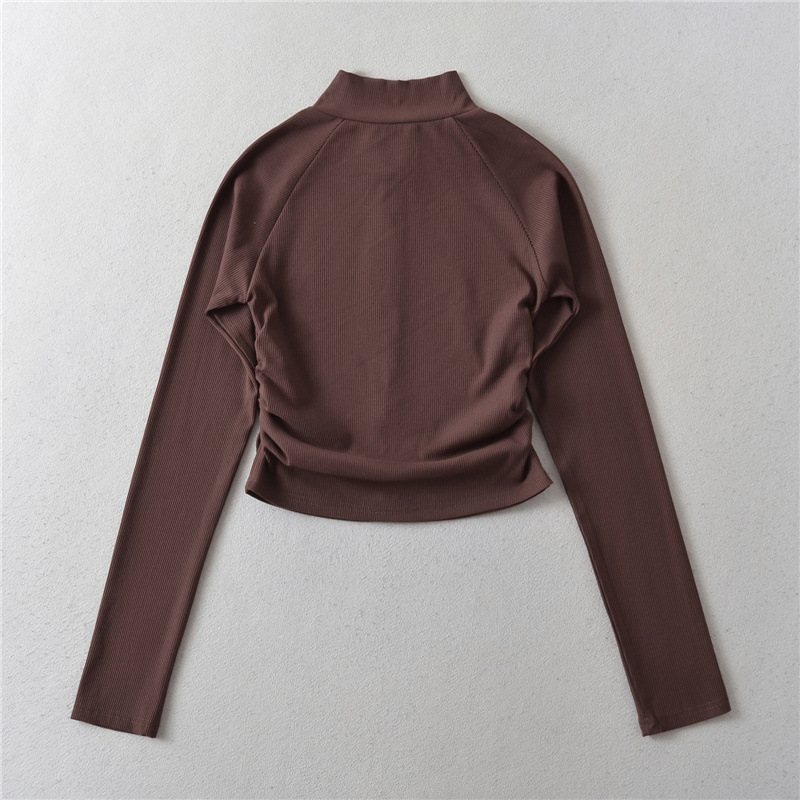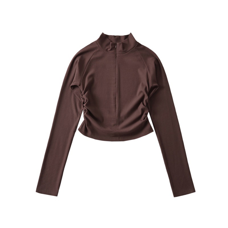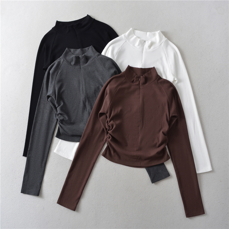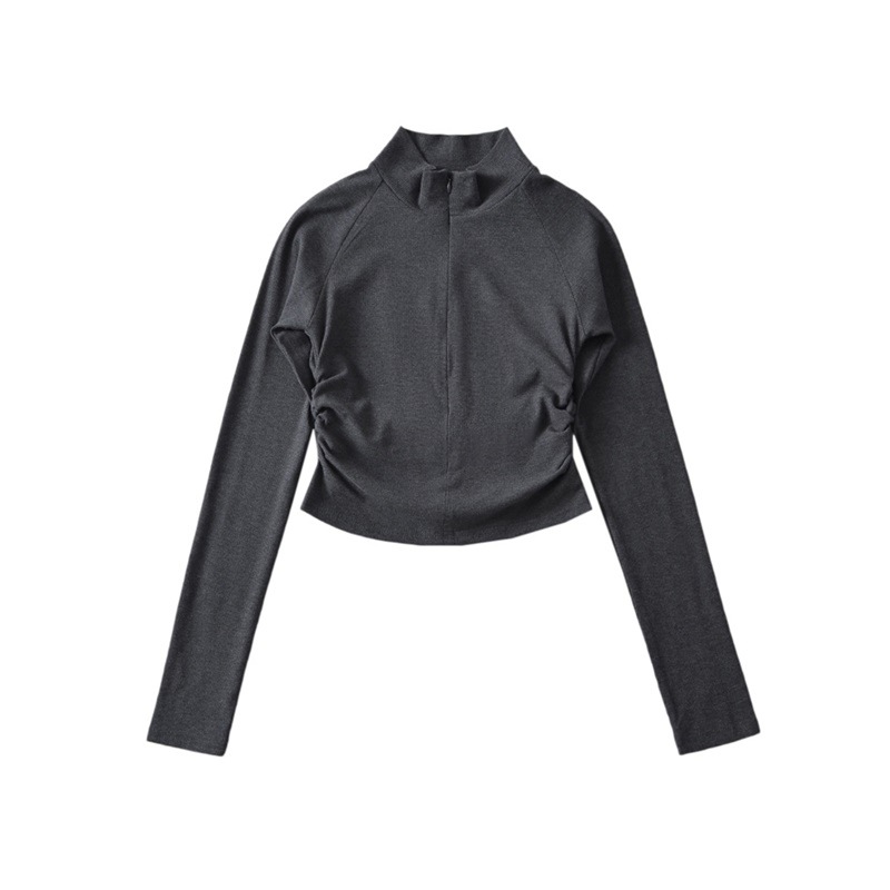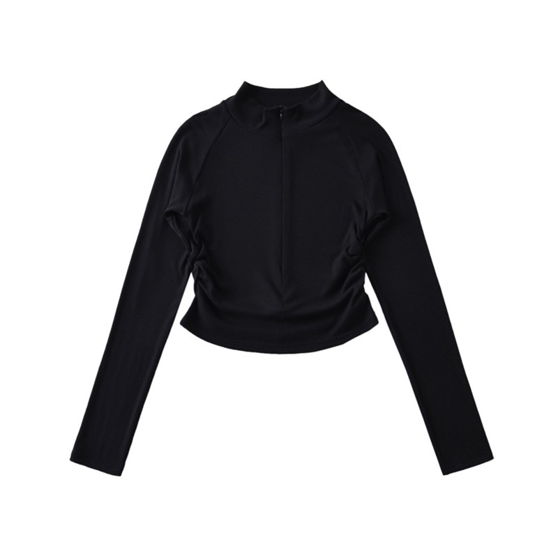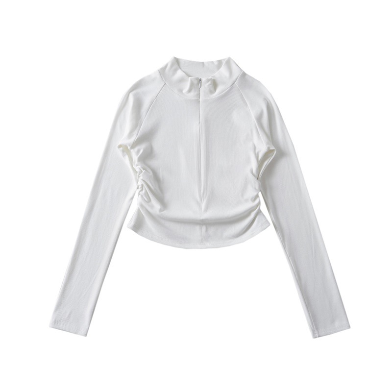 순수한 욕망 스타일 세로 칼라 지퍼 사이드 플리츠 짧은 긴팔 티셔츠 가을 새로운 슬림 핏 스파이스 걸 하의 여성용 탑
