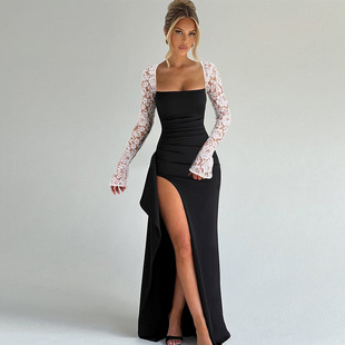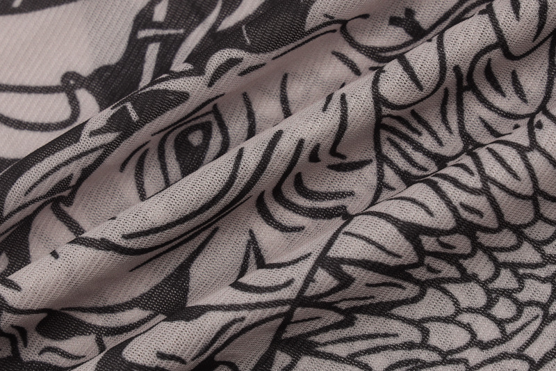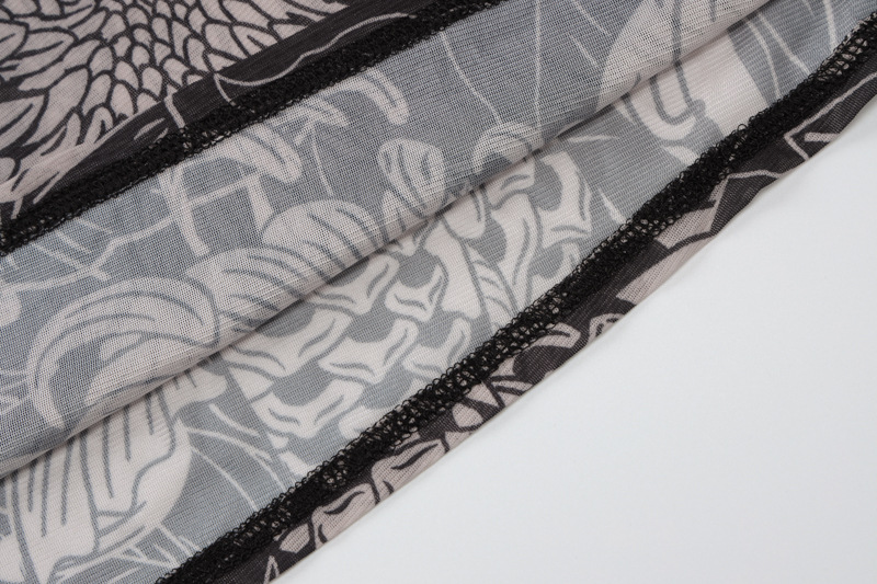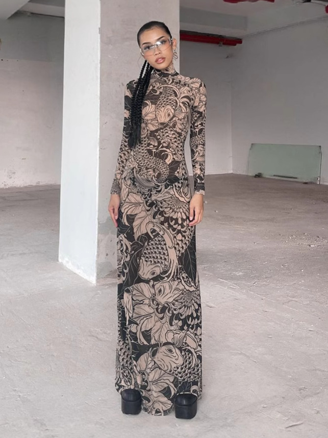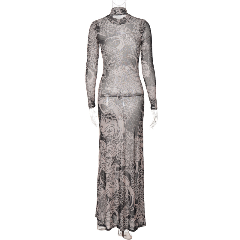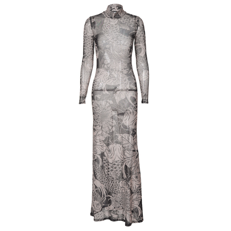 유럽 및 미국 해외 여성복 2025 여름 신상 패션 메쉬 프린트 시스루 하이넥 슬림핏 원피스