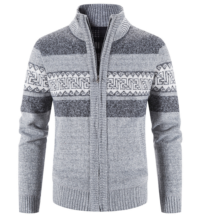 外贸男士外套加厚拼色夹克立领针织衫毛衣2023秋冬季加绒保暖开衫