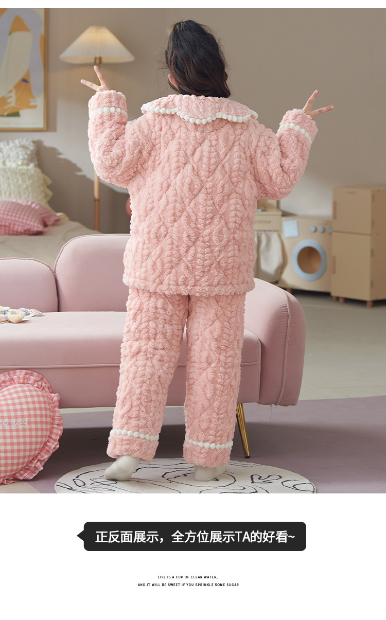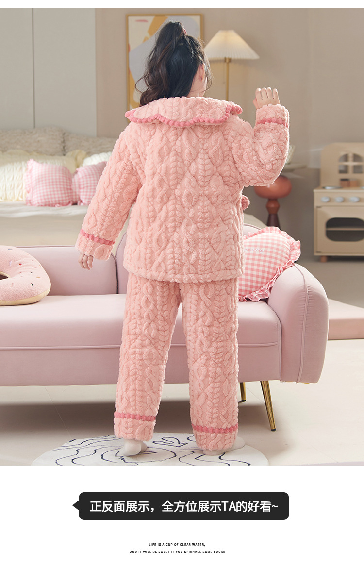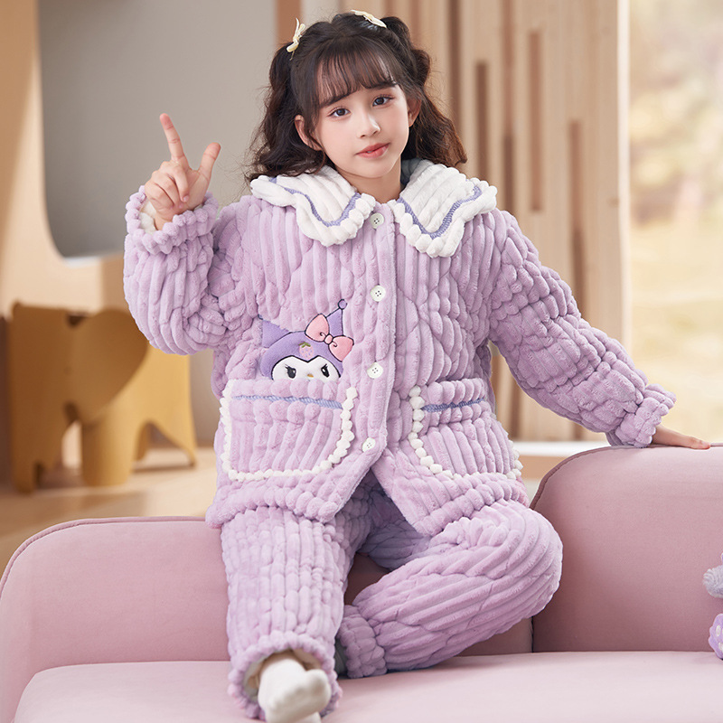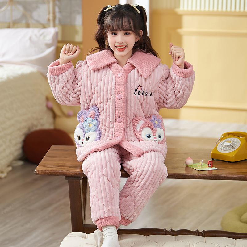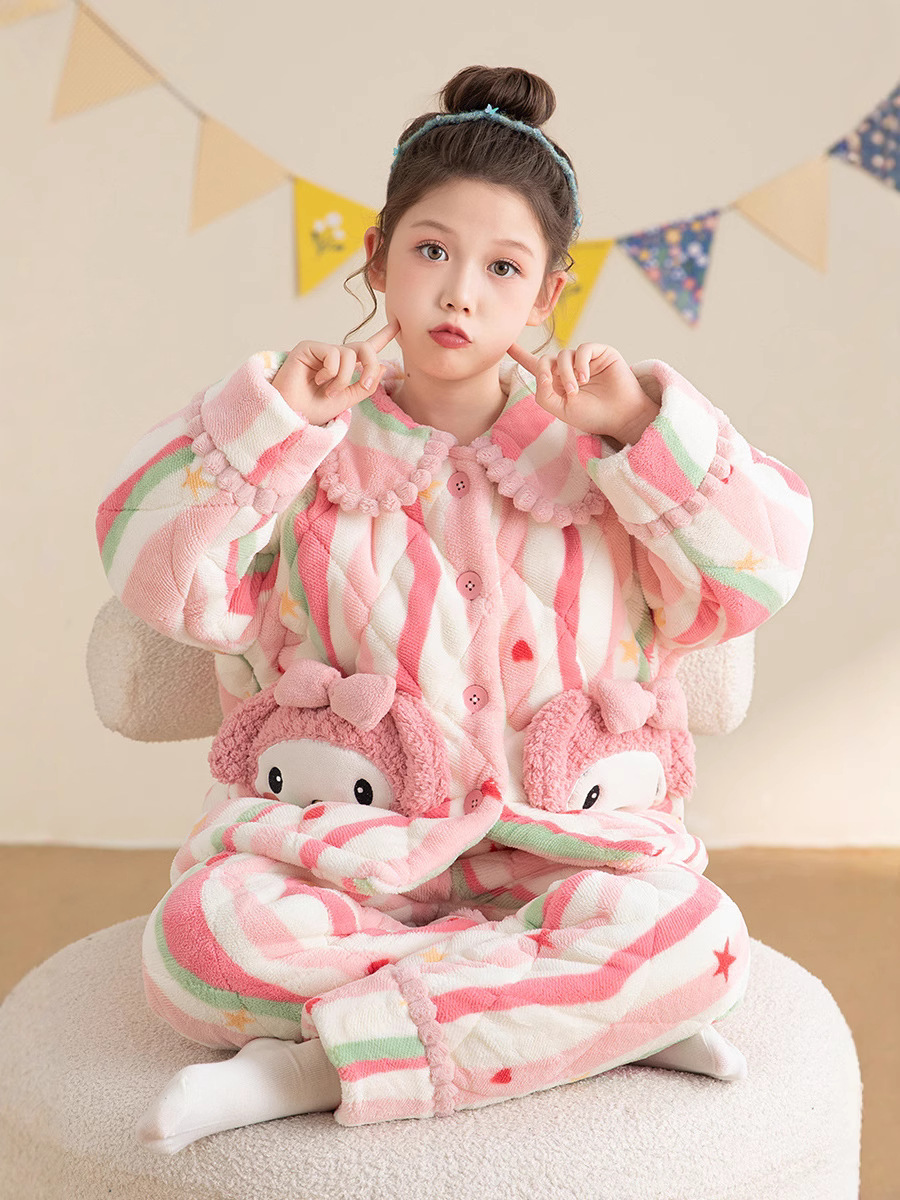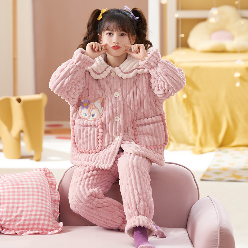 산호 양털 3 단 누비 이불 어린이 잠옷 여아 두꺼운 따뜻한 가정복 여아 대형 어린이 플란넬 겨울