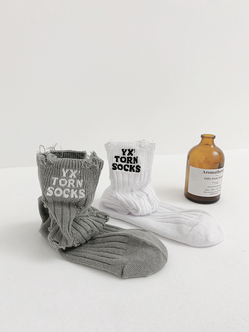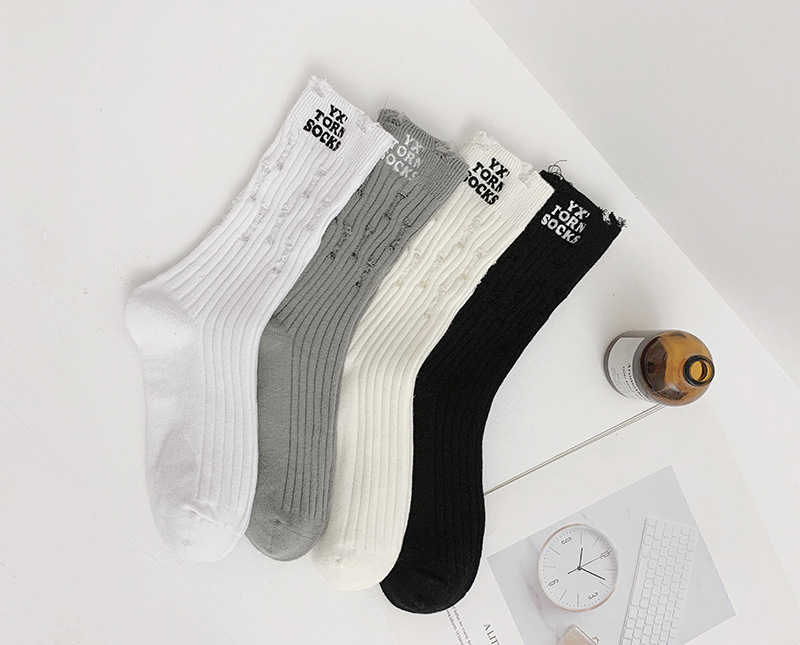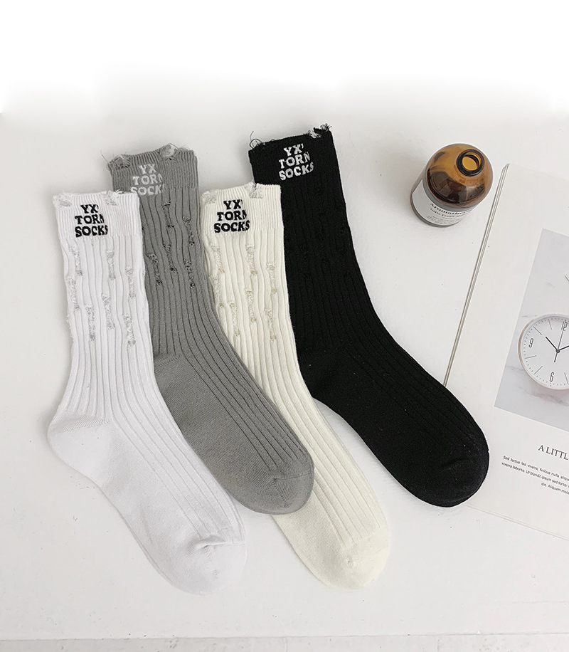 찢어진 양말 여성용 미드 튜브 양말 봄과 가을 순면 사이버 연예인 스포츠 거지 양말 한국 쌓인 세련된 양말
