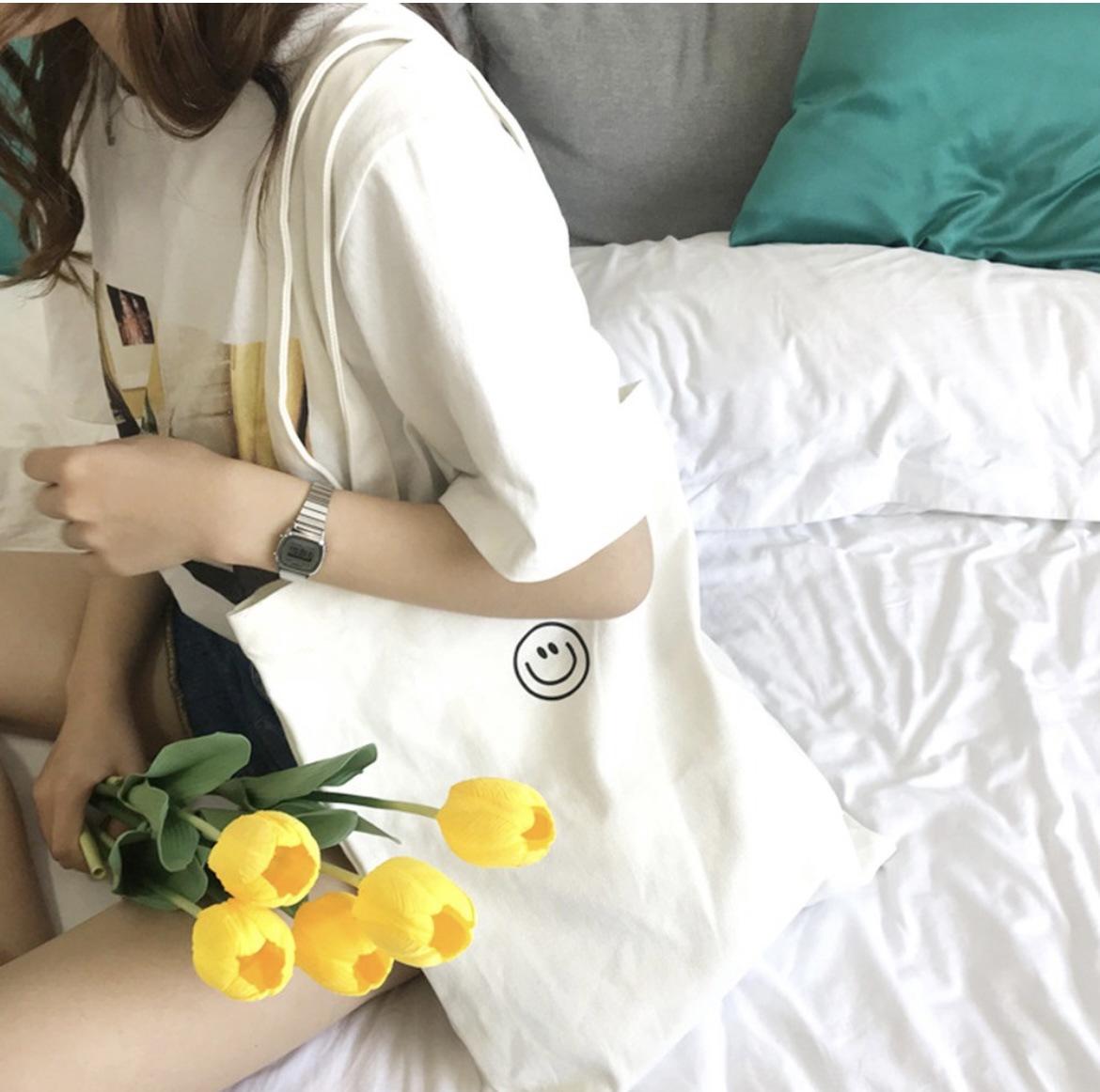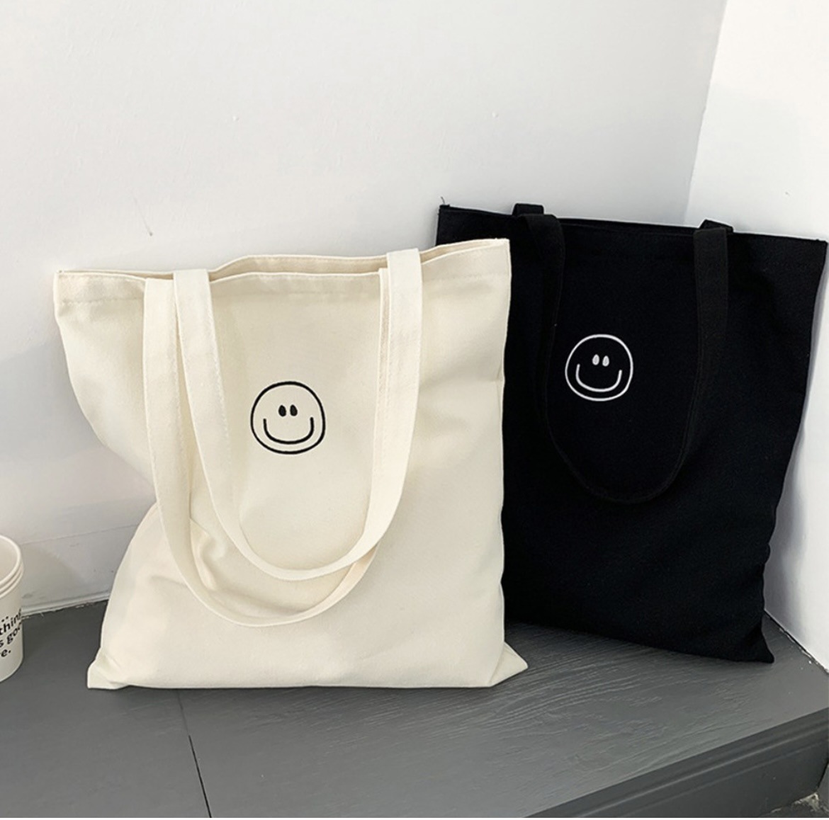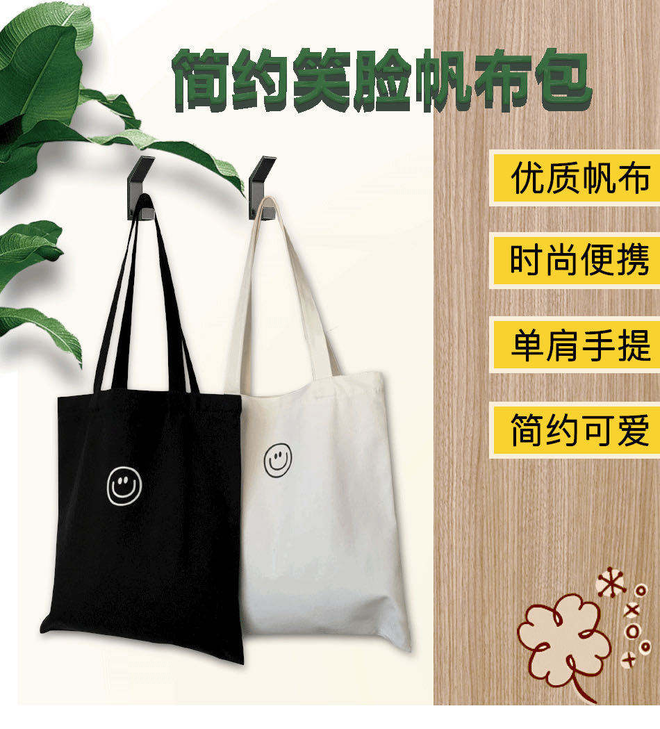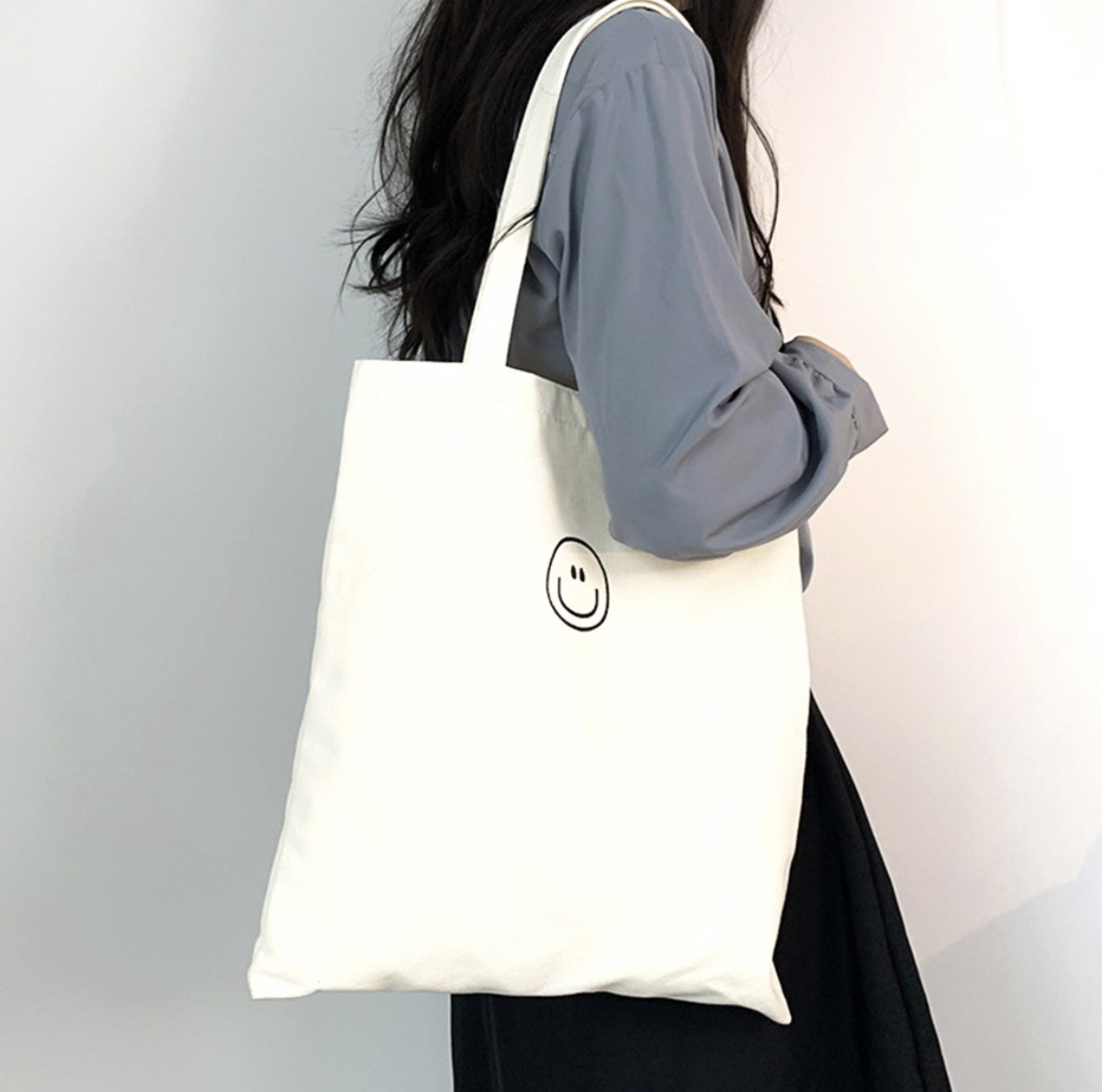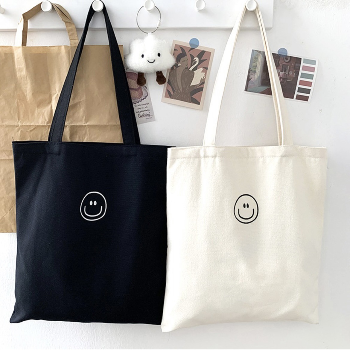 2025 대용량 캔버스 가방 스마일 숄더백 학생용 실용 핸드백 학습용 친환경 가방 여름 여성 수납용스토어 가기
