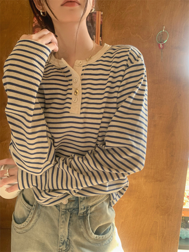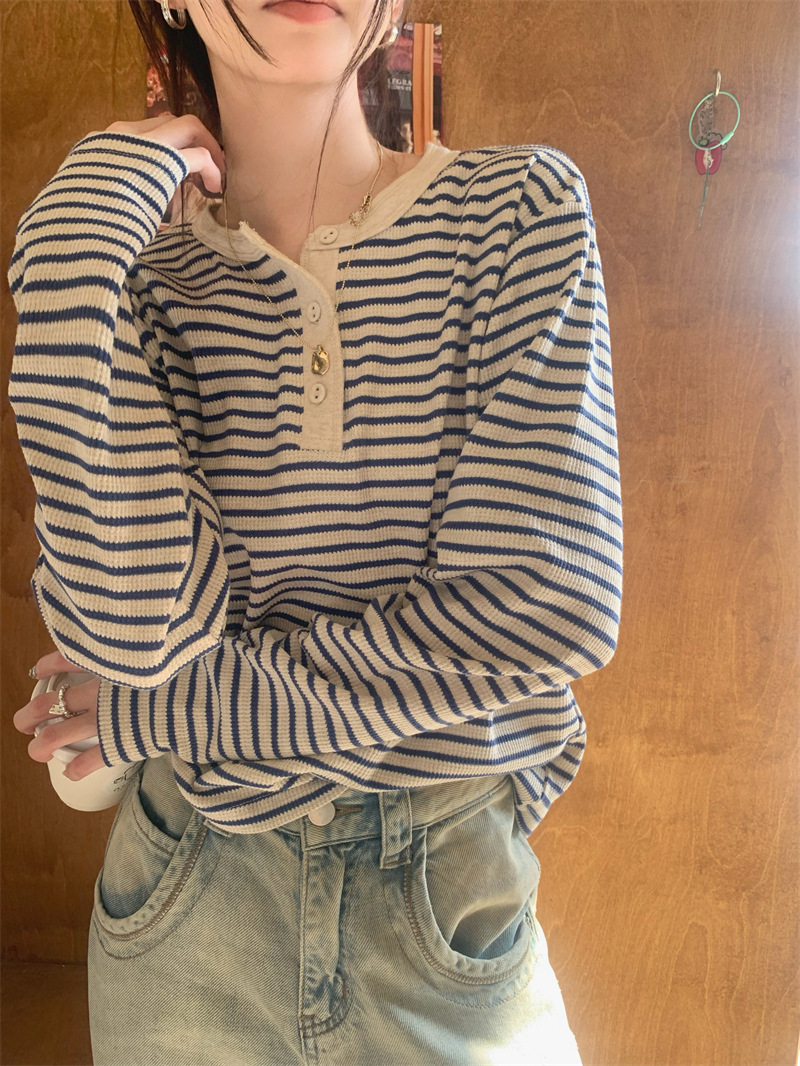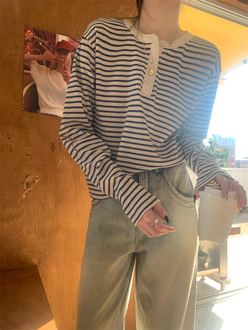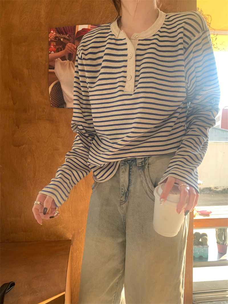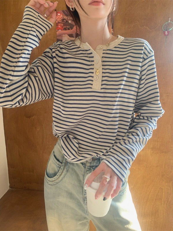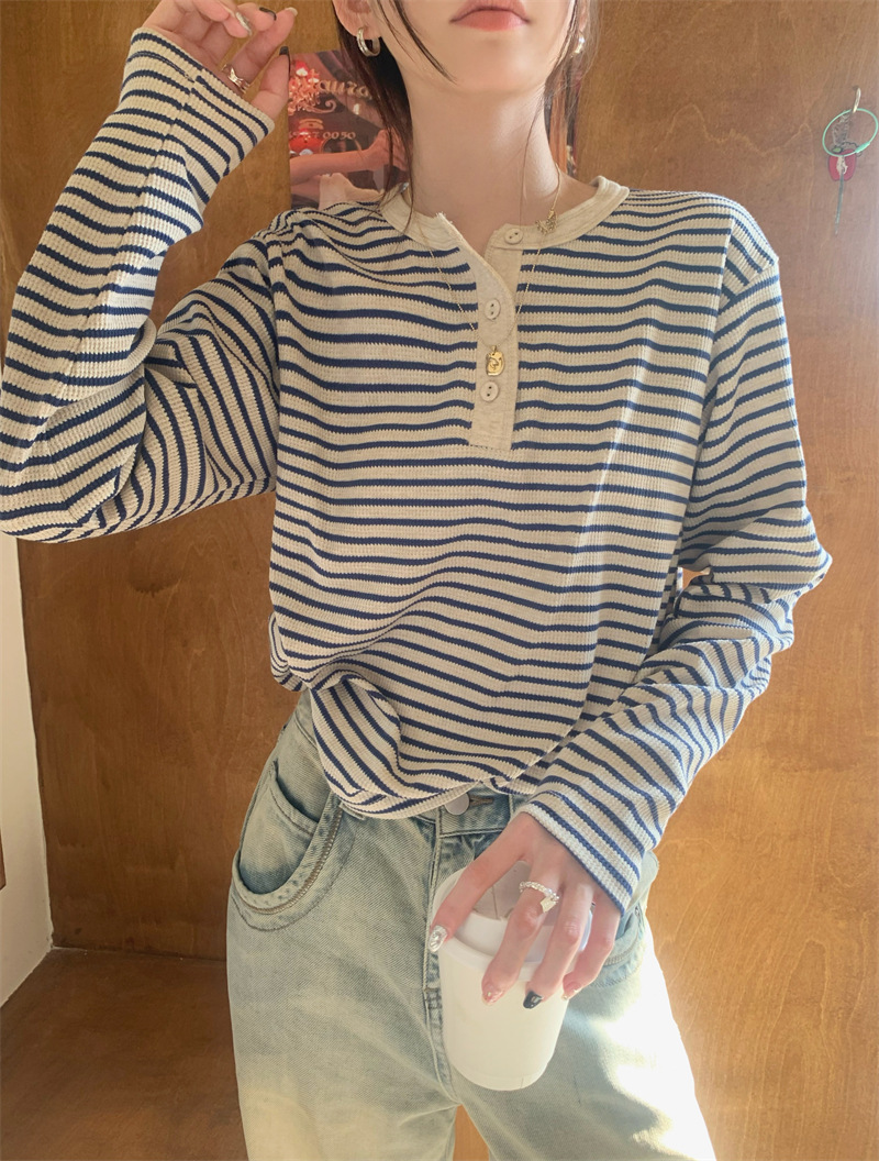 초가을 스타일의 베이직 반오픈 칼라 스트라이프 긴팔 베이스 티셔츠, 루즈하고 활용도 높은 디자인의 여성용 탑 55474스토어 가기