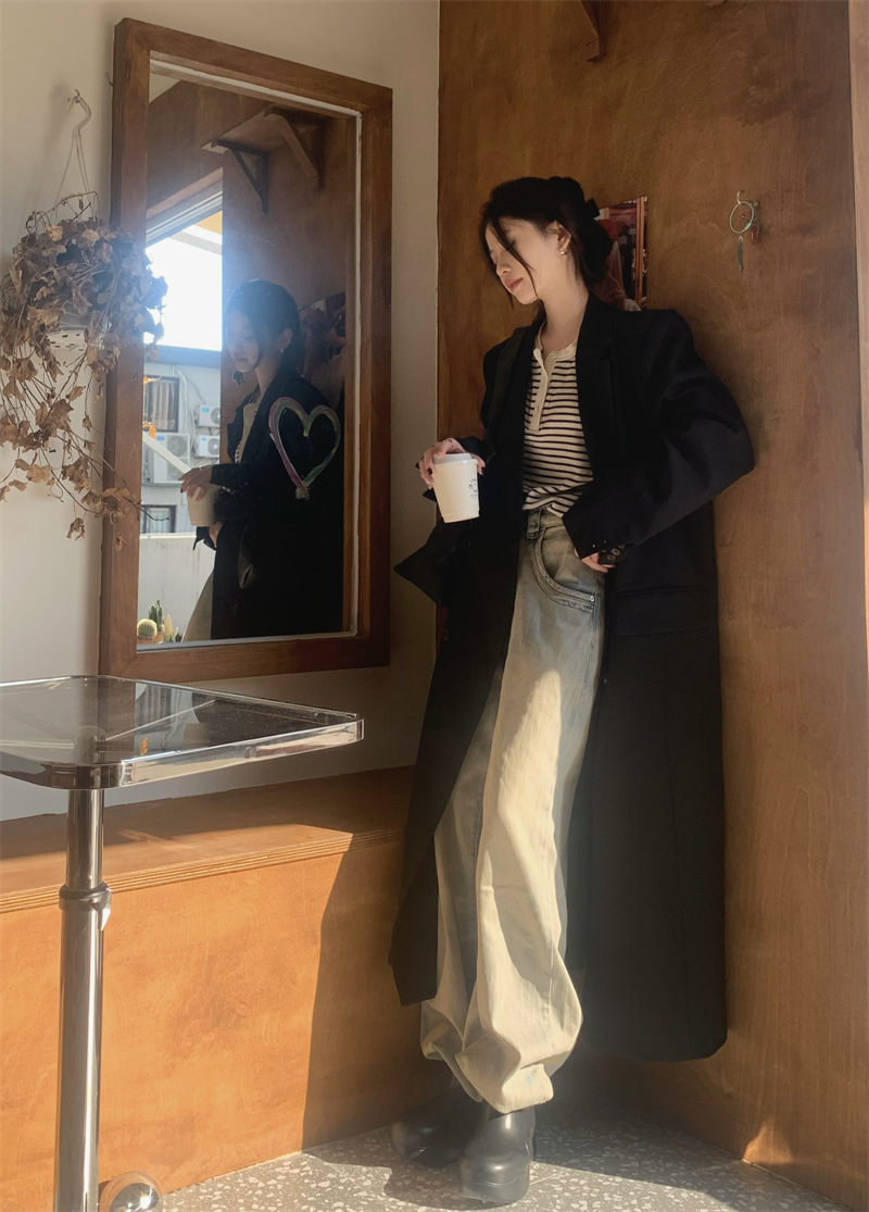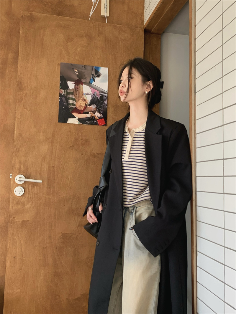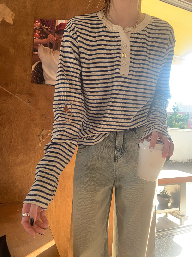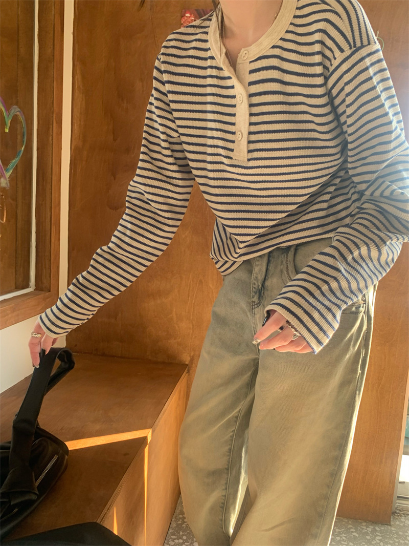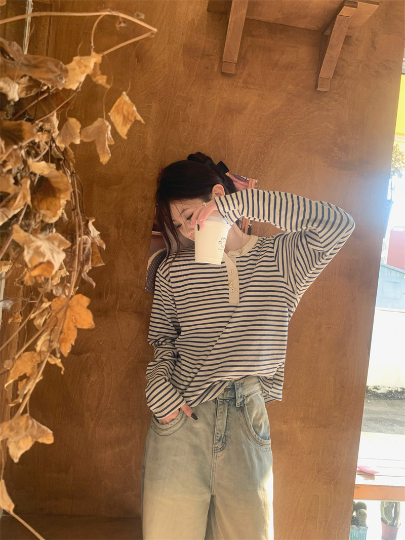 초가을 스타일의 베이직 반오픈 칼라 스트라이프 긴팔 베이스 티셔츠, 루즈하고 활용도 높은 디자인의 여성용 탑 55474스토어 가기