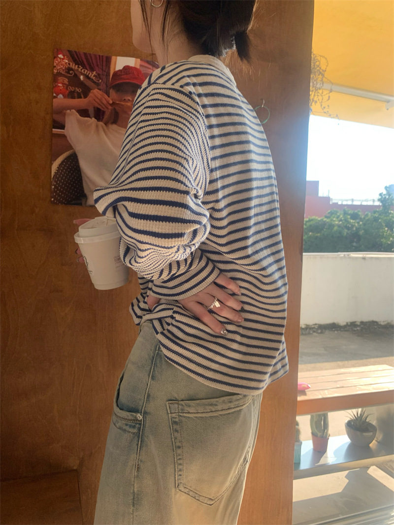 초가을 스타일의 베이직 반오픈 칼라 스트라이프 긴팔 베이스 티셔츠, 루즈하고 활용도 높은 디자인의 여성용 탑 55474