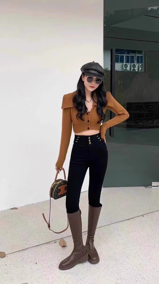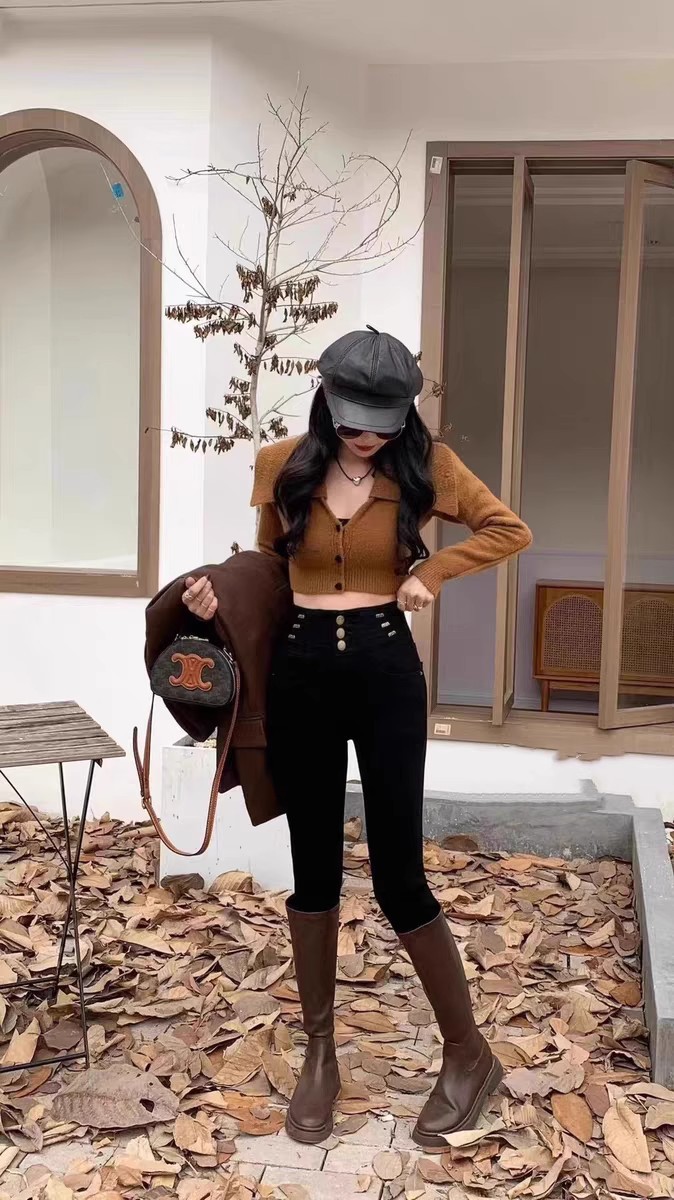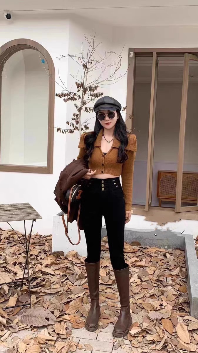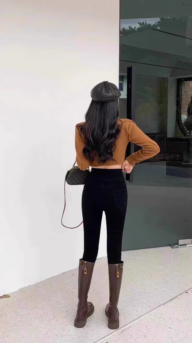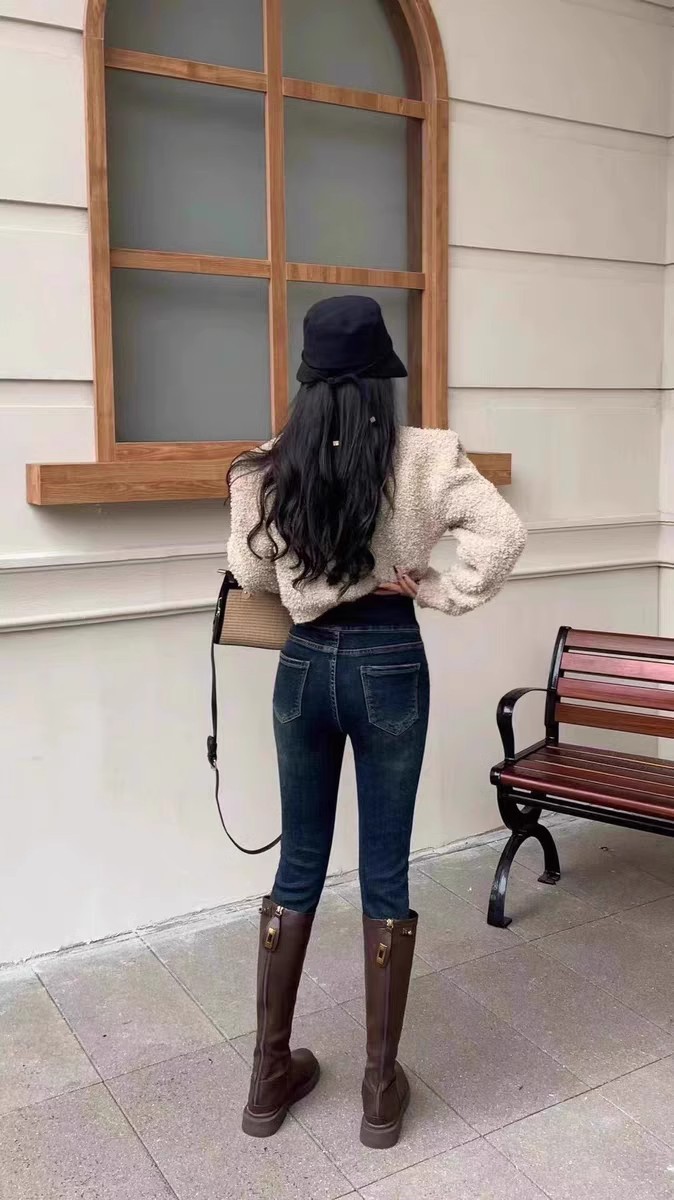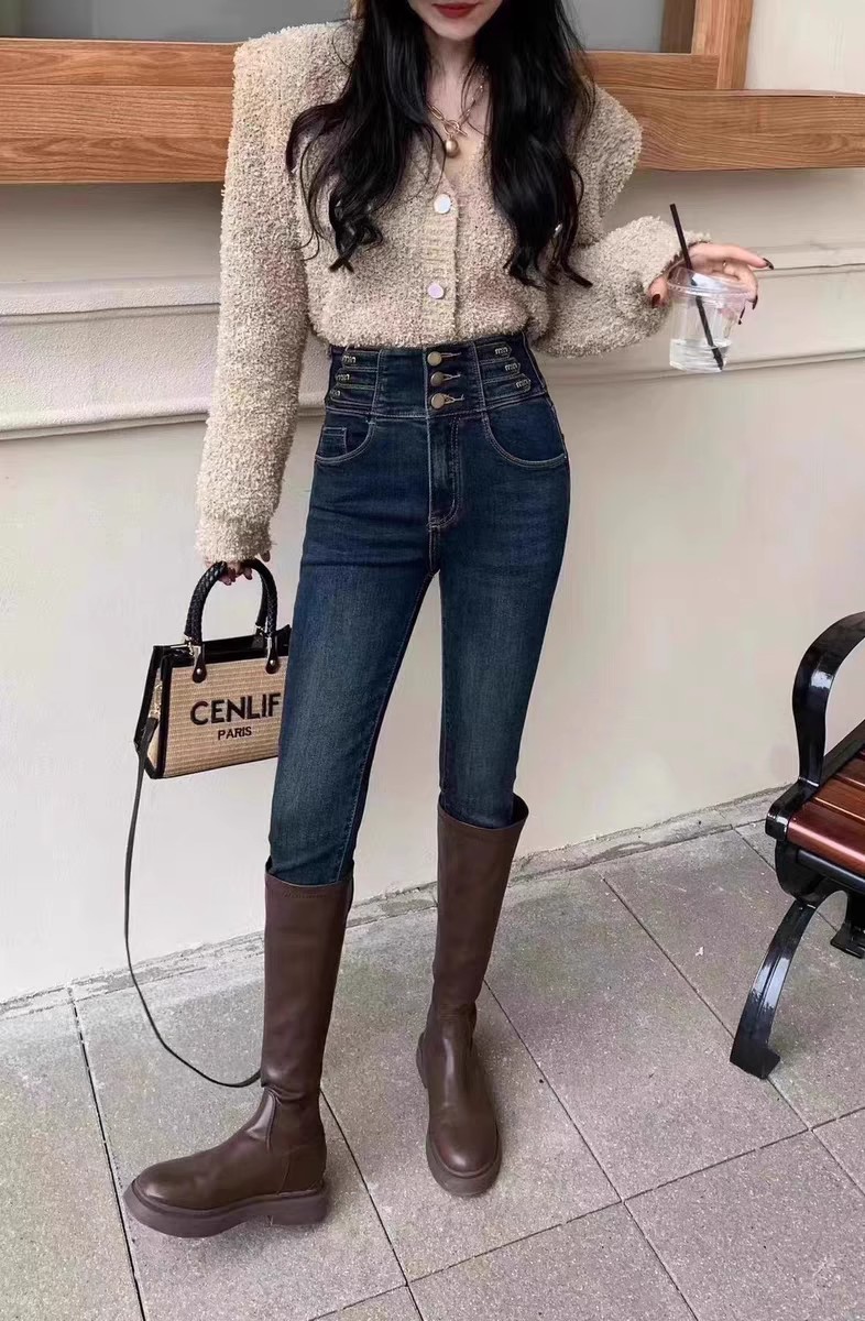 기모 두꺼운 하이 웨이스트 버클 스키니 진 여성 가을/겨울 2023 새로운 슬림 핏 슬리밍 따뜻한 연필 바지스토어 가기