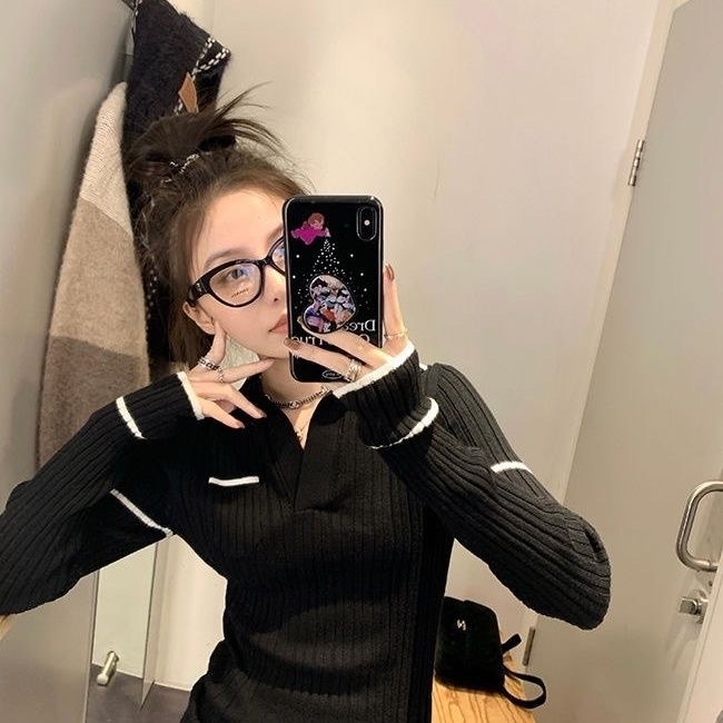 순수한 욕망 디자인 센스 슬리밍 긴팔 폴로 칼라 니트 스웨터 여성 가을과 겨울 2023 새로운 스타일 탑 만능 스웨터 트렌디