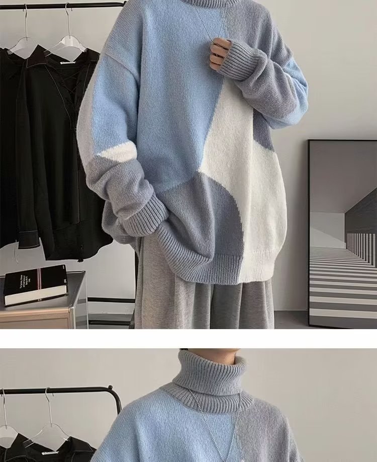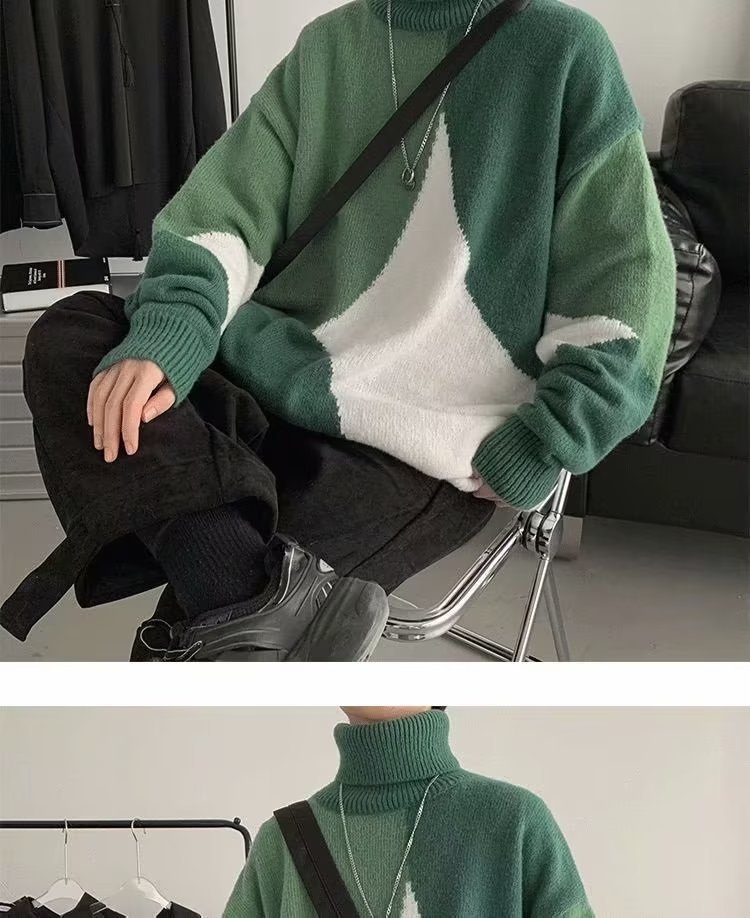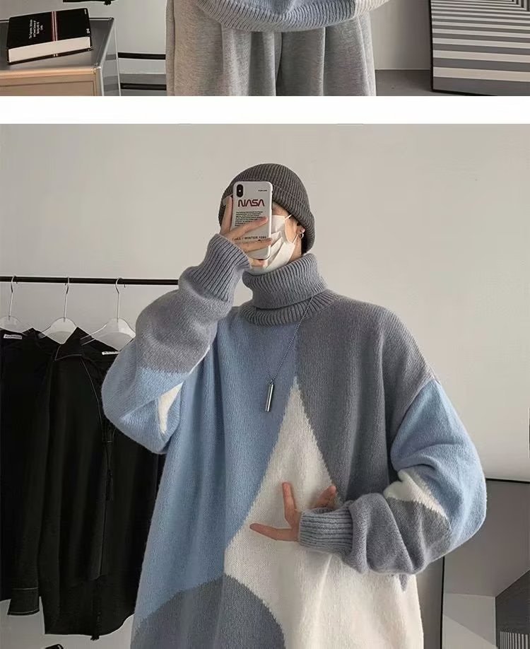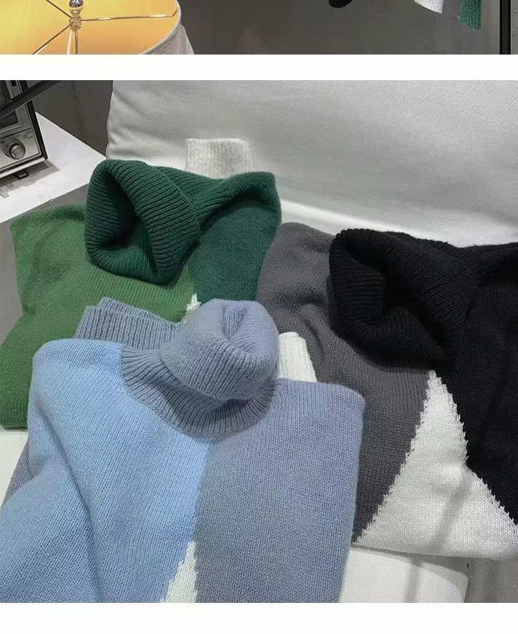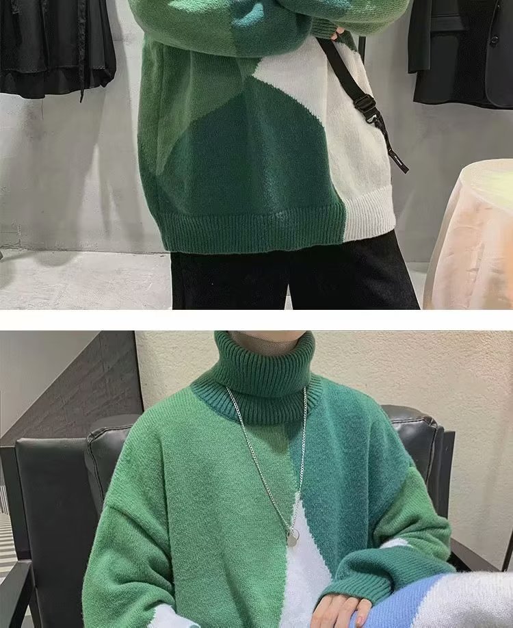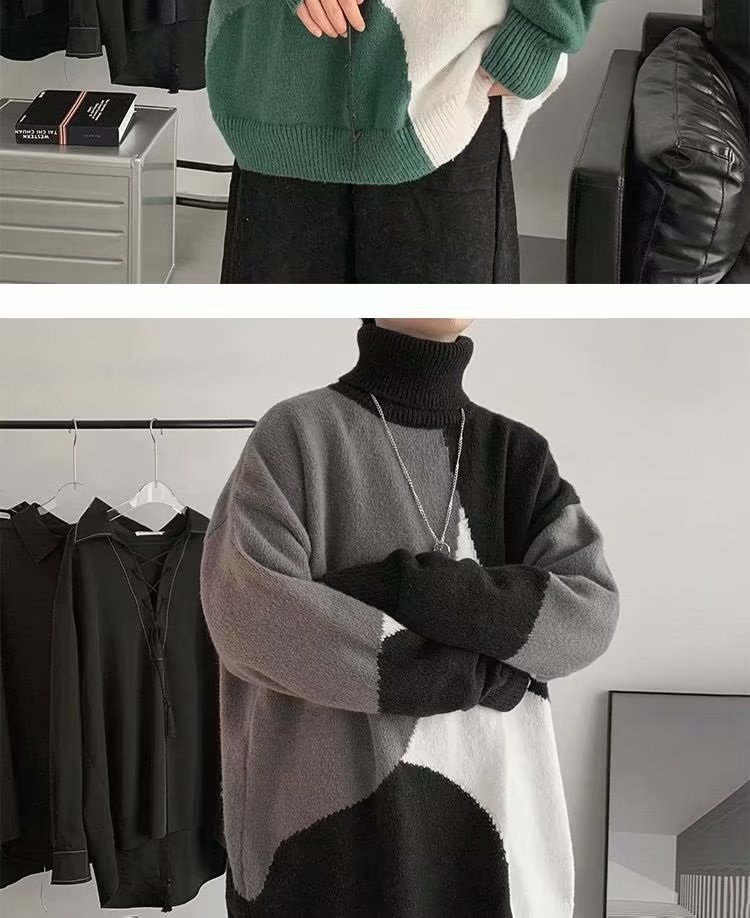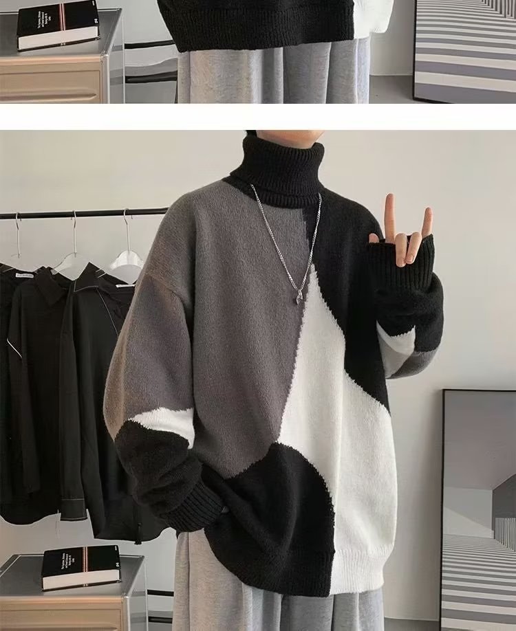 트렌디 한 브랜드 미국 터틀넥 스웨터 남자의 가을과 겨울 느슨한 대비 색상 구덩이 니트 스웨터 더플 잘 생긴 디자인 센스 스웨터 재킷스토어 가기
