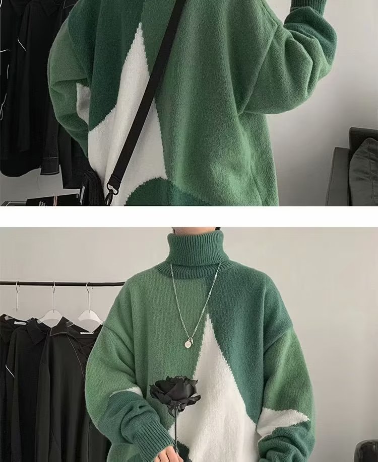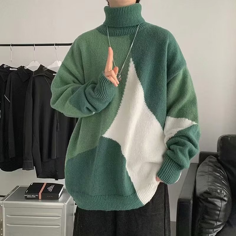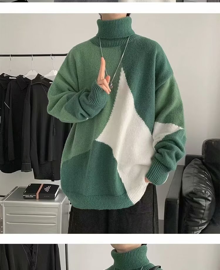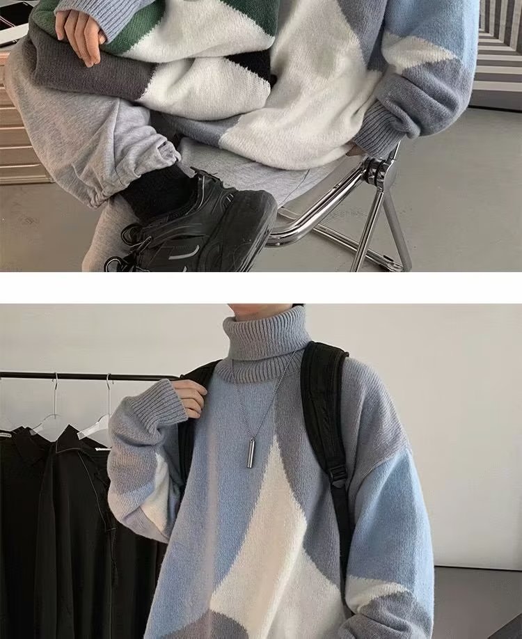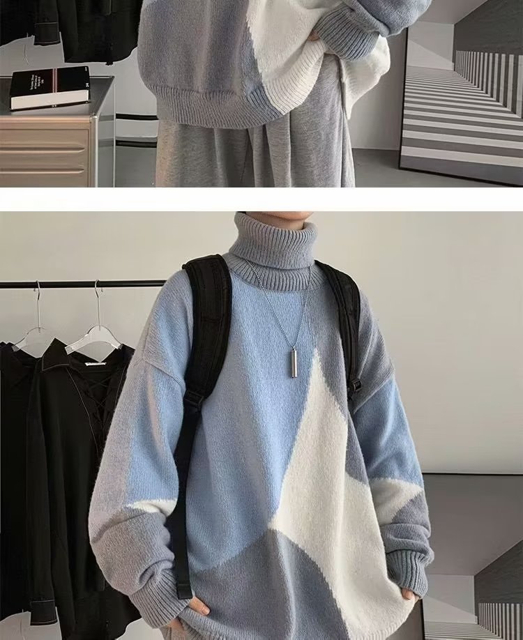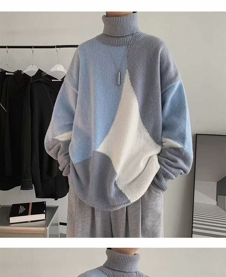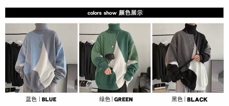 트렌디 한 브랜드 미국 터틀넥 스웨터 남자의 가을과 겨울 느슨한 대비 색상 구덩이 니트 스웨터 더플 잘 생긴 디자인 센스 스웨터 재킷스토어 가기