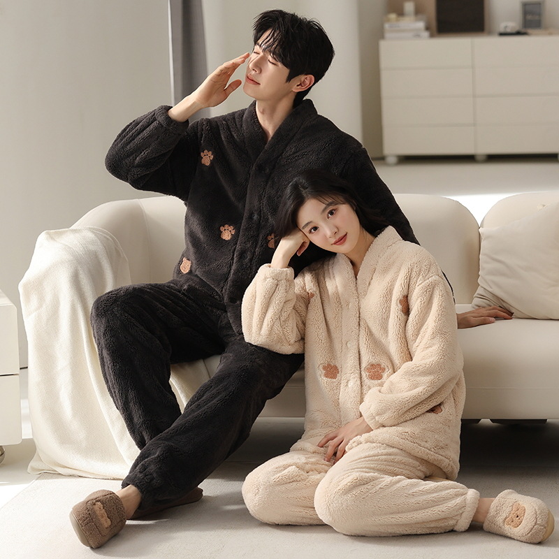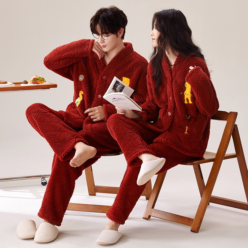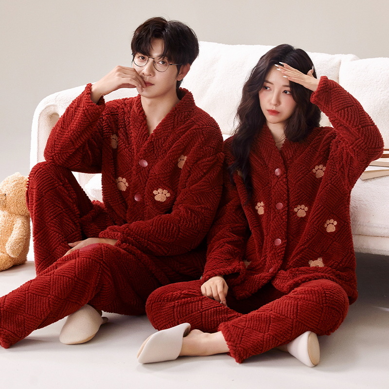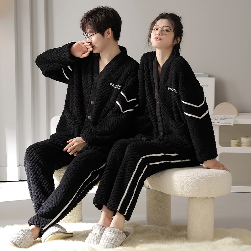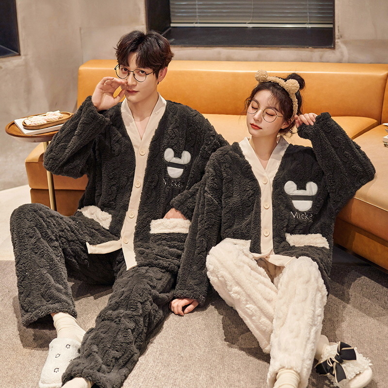 산호 양털 잠옷 여자의 겨울 커플의 V-넥 카디건 기모 두꺼운 플란넬 남자의 따뜻한 가정 옷 세트