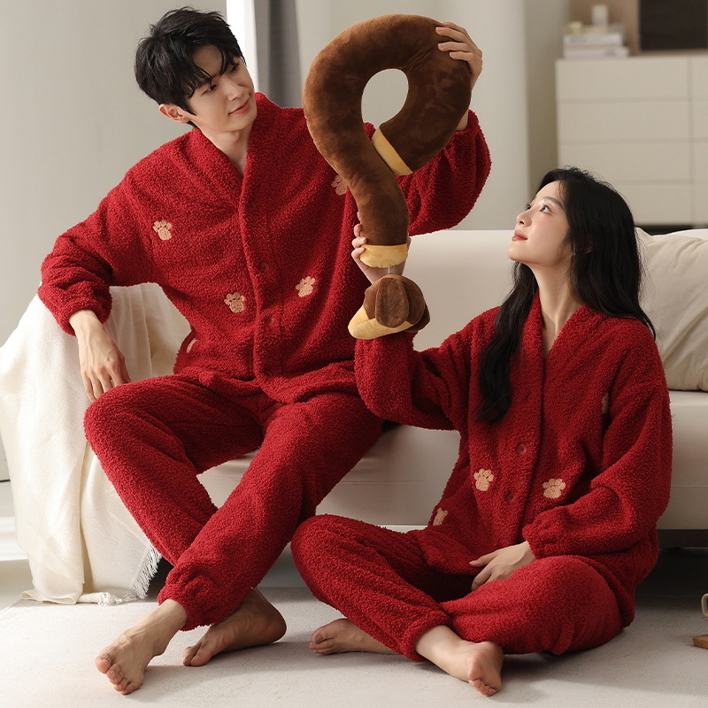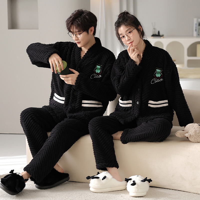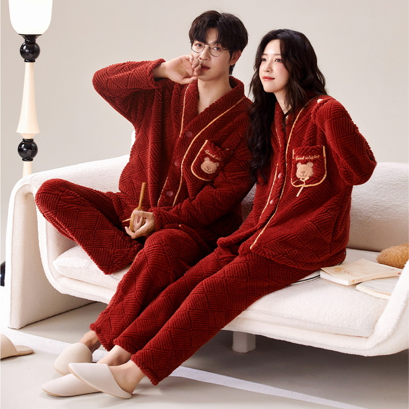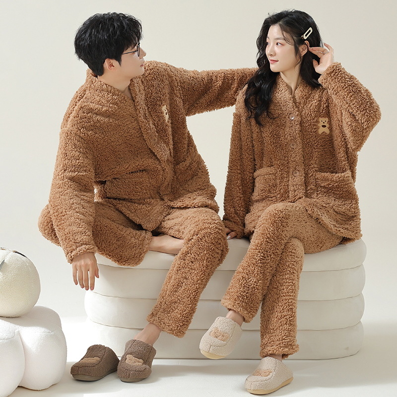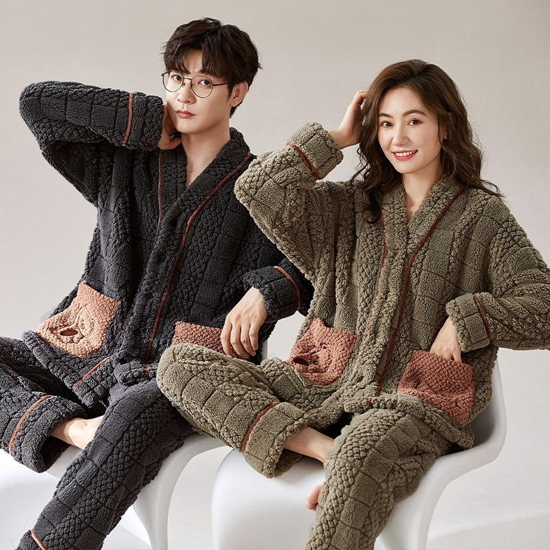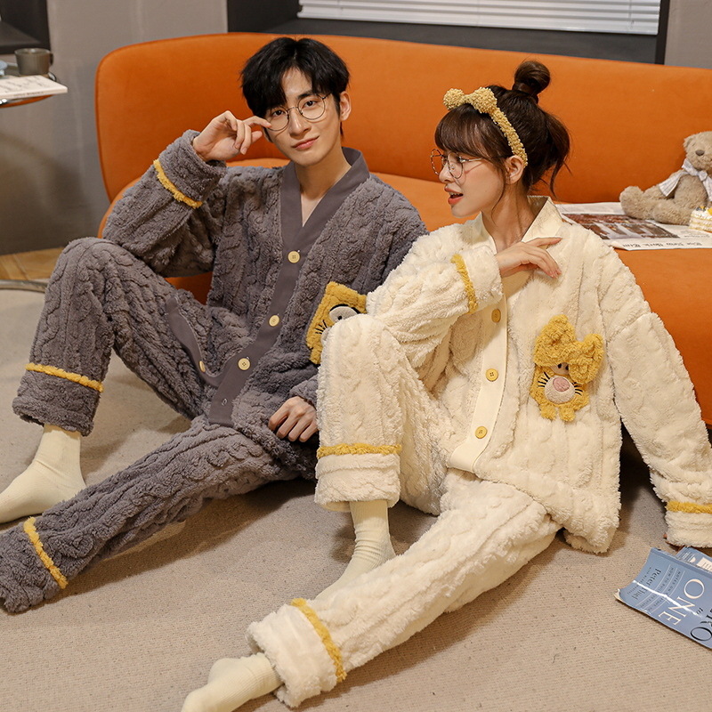 산호 양털 잠옷 여자의 겨울 커플의 V-넥 카디건 기모 두꺼운 플란넬 남자의 따뜻한 가정 옷 세트