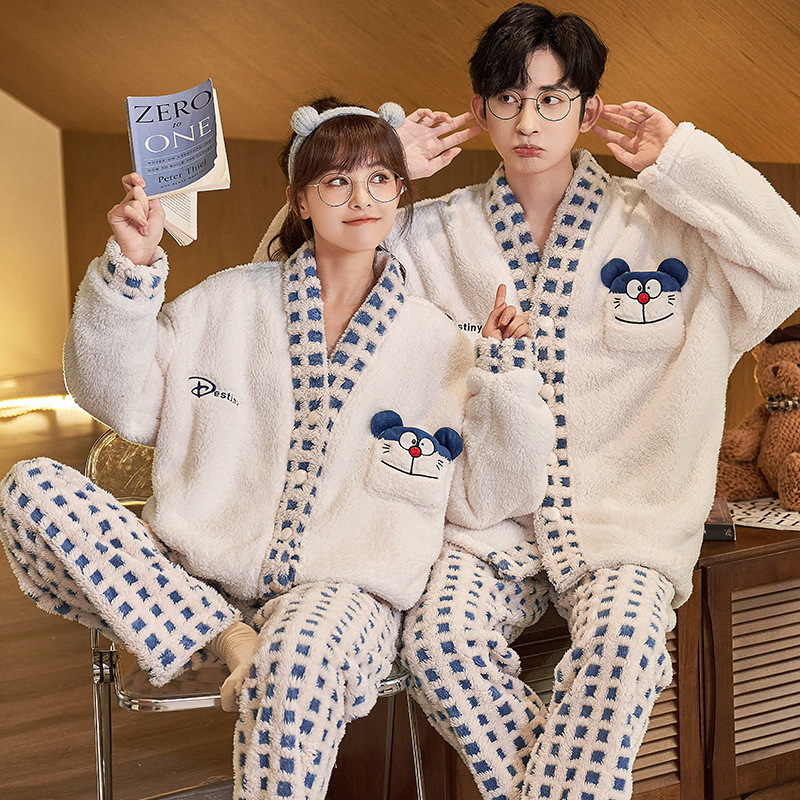 산호 양털 잠옷 여자의 겨울 커플의 V-넥 카디건 기모 두꺼운 플란넬 남자의 따뜻한 가정 옷 세트스토어 가기