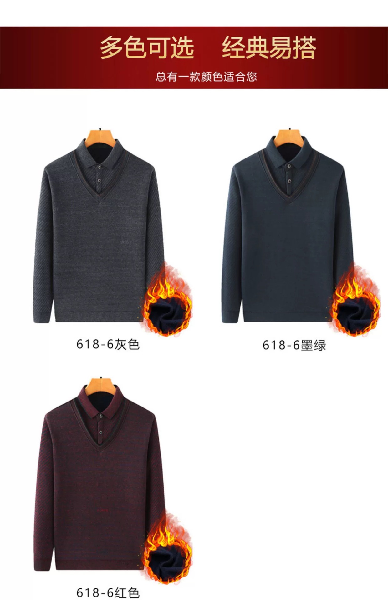 중년 기모 두꺼운 스웨터 남자의 중년 및 노인 남자의 가짜 투피스 티셔츠 아빠의 겨울 니트 따뜻한 탑