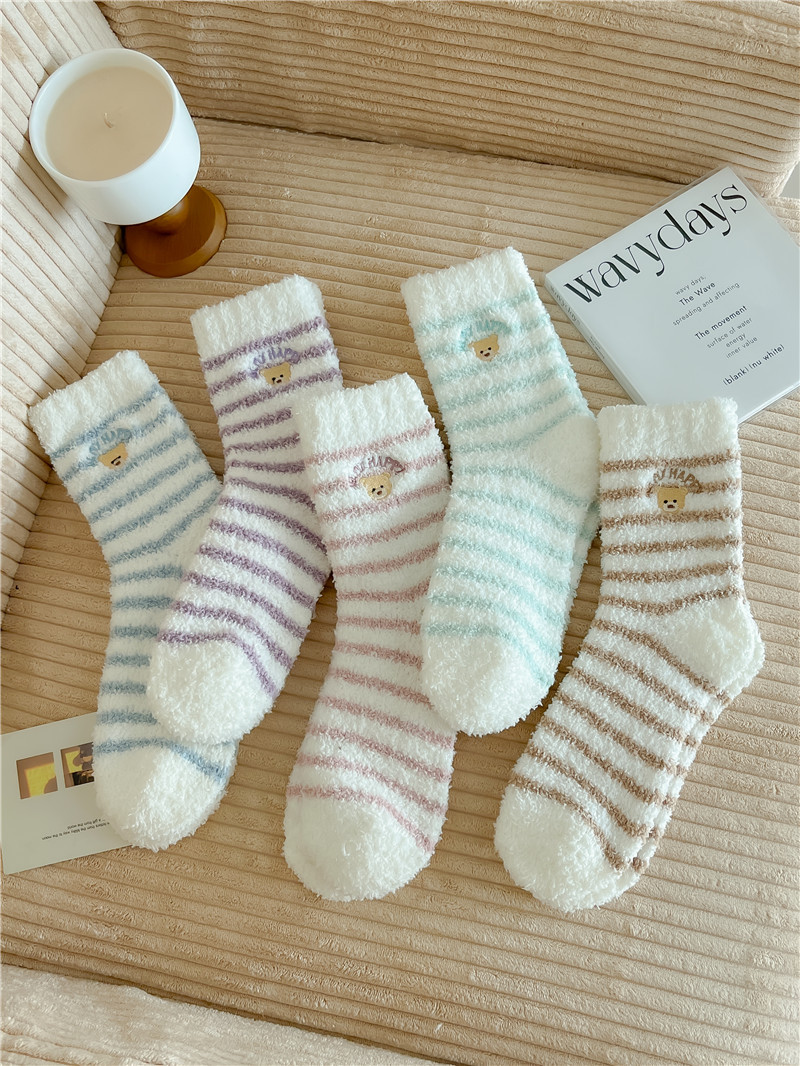 양말 여성 자수 곰 스트라이프 수면 양말 산호 양털 여성 미드 튜브 양말 겨울 두꺼운 따뜻한 바닥 양말 도매