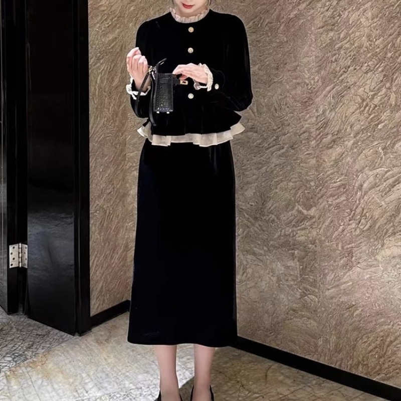 유럽 스타일 2025 가을 신상품 작은 프랑스풍 패셔너블 벨벳 정장 스커트 헤본 스타일 슬림 투피스 세트스토어 가기