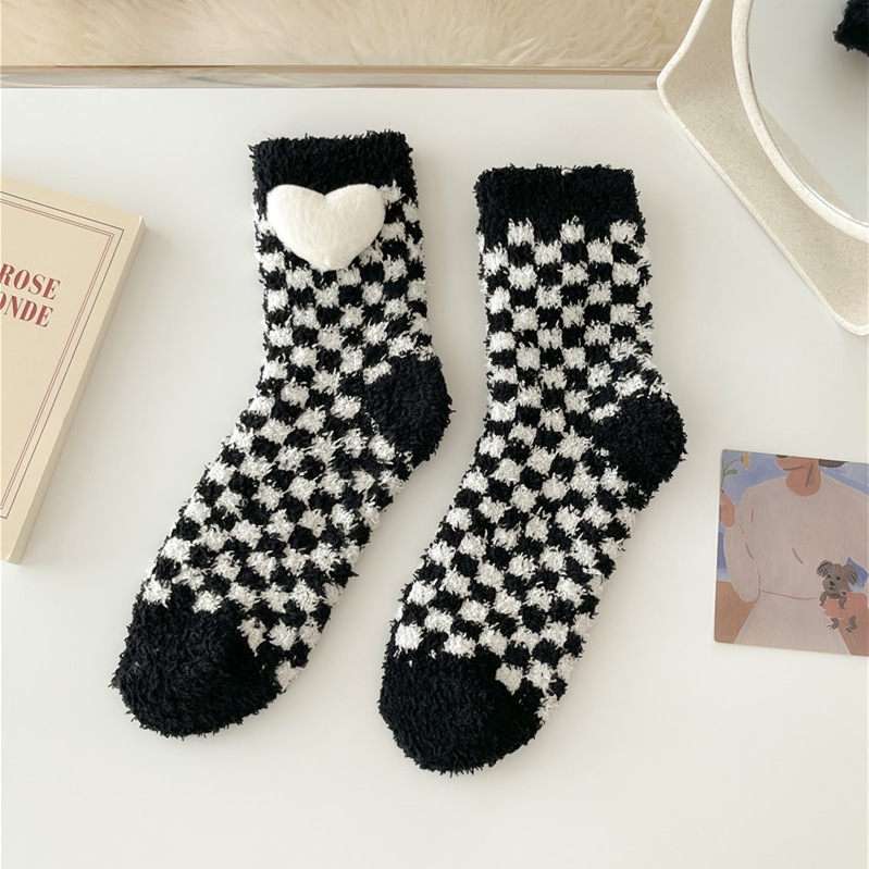 양말 여성 체스 판 사랑 인형 산호 양털 중간 길이 양말 겨울 두꺼운 따뜻한 바닥 양말 홈 수면 양말스토어 가기