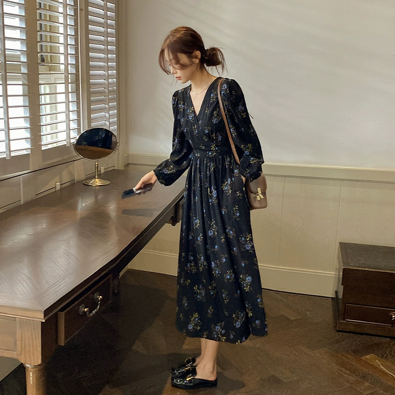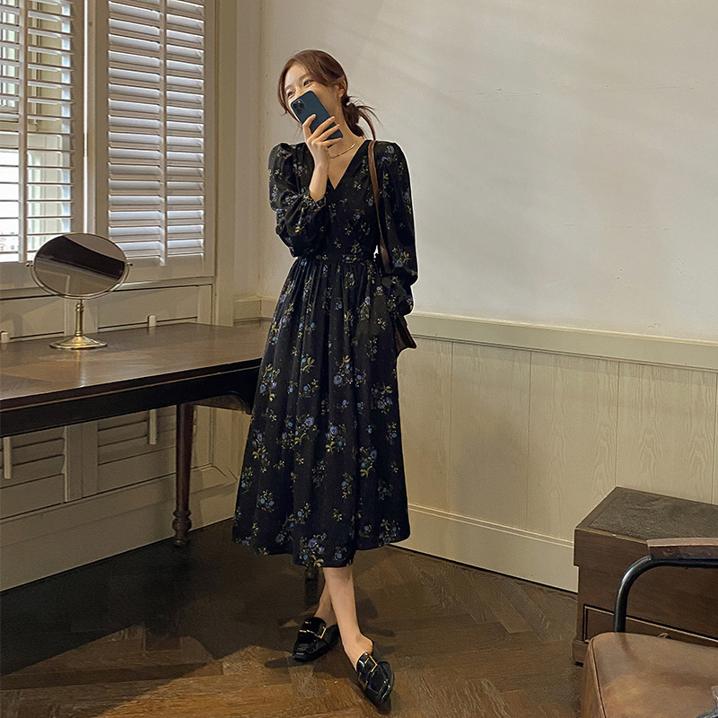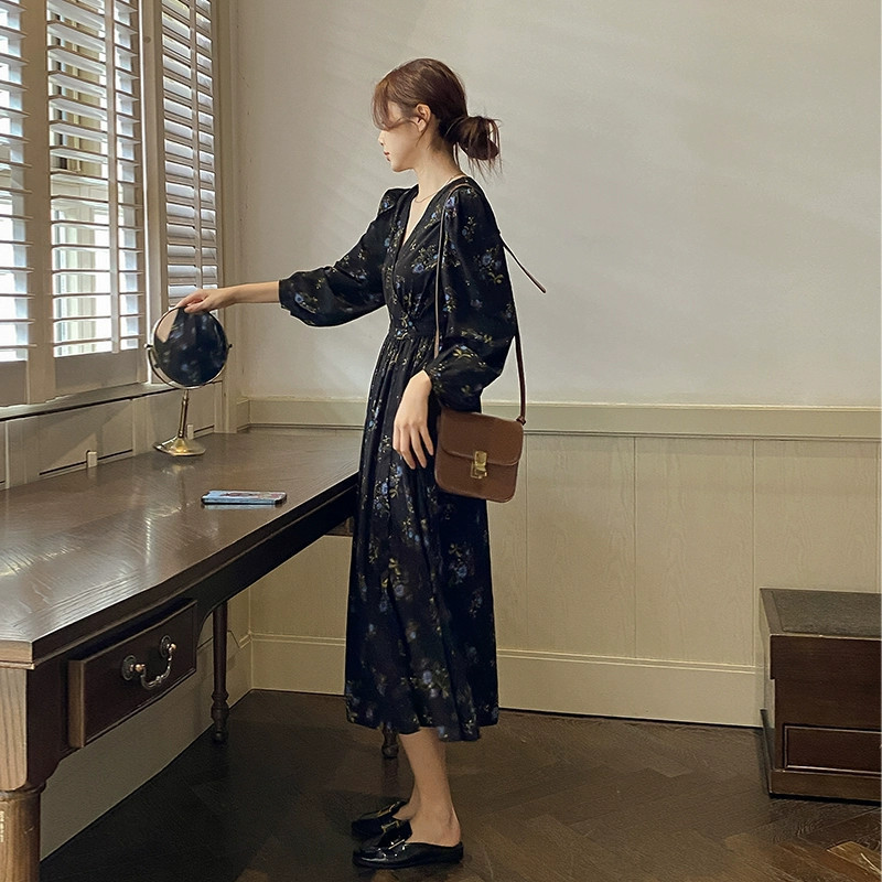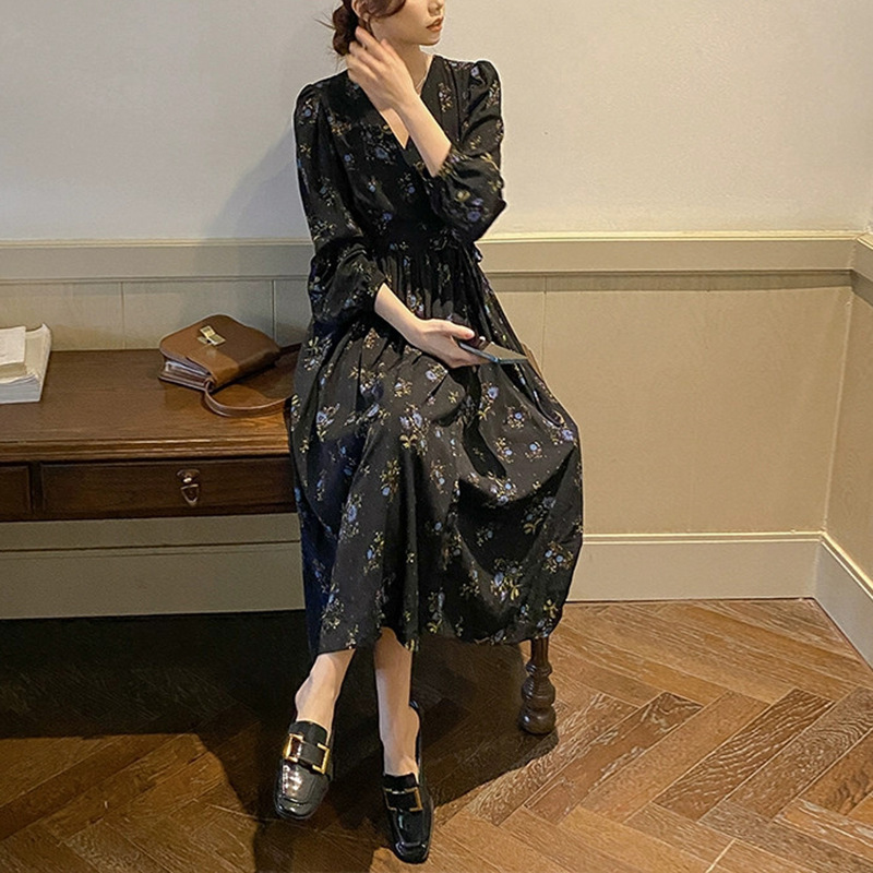 여성을위한 프렌치 블랙 꽃 무늬 긴팔 드레스 2025 봄, 가을 새로운 스타일 슬리밍 햅번 스타일 롱 드레스스토어 가기