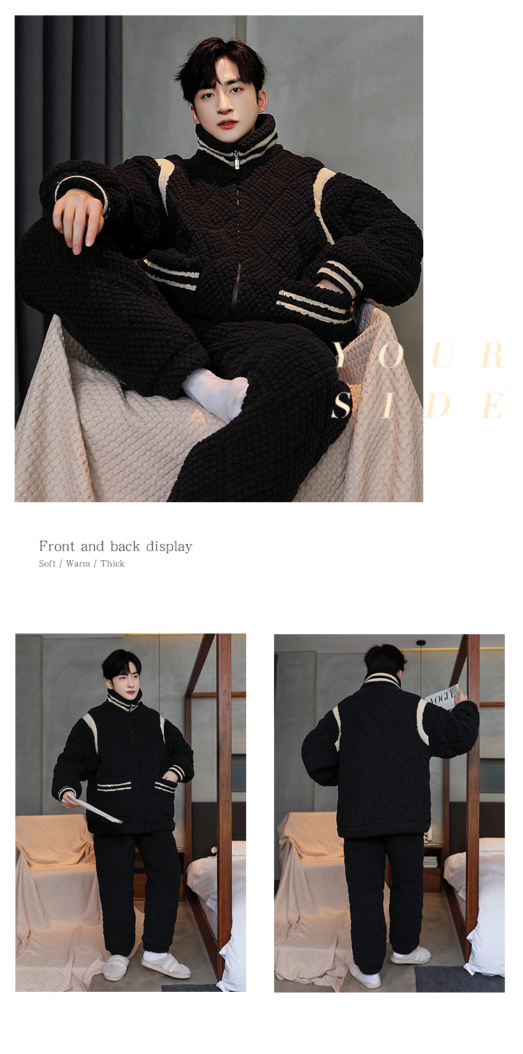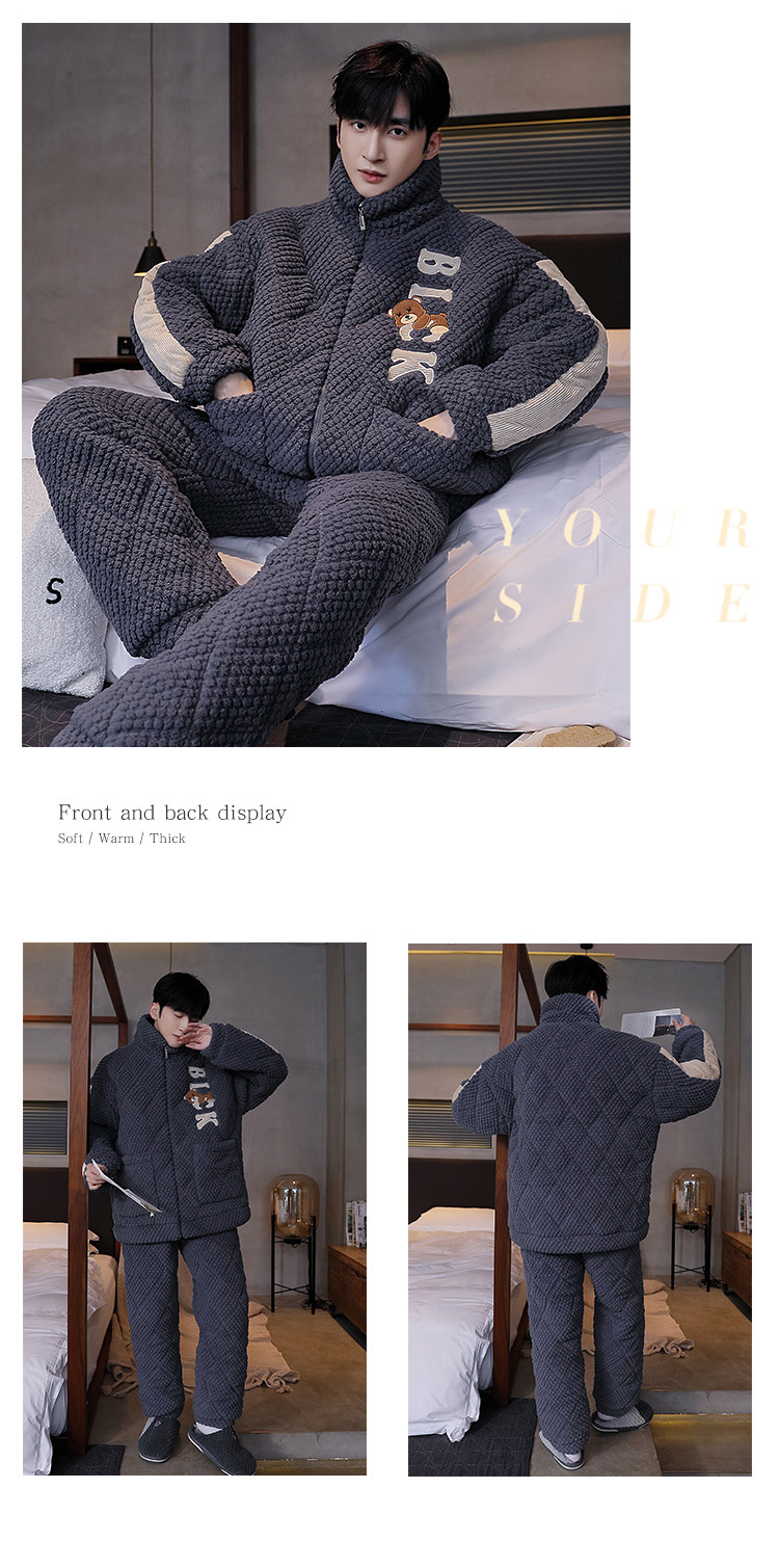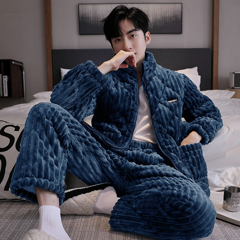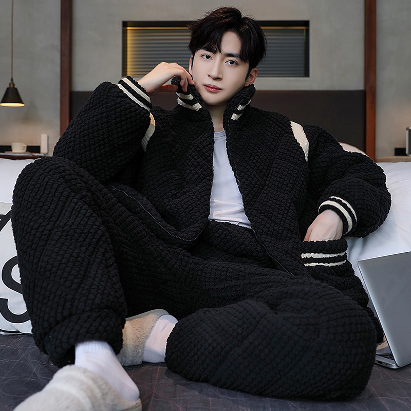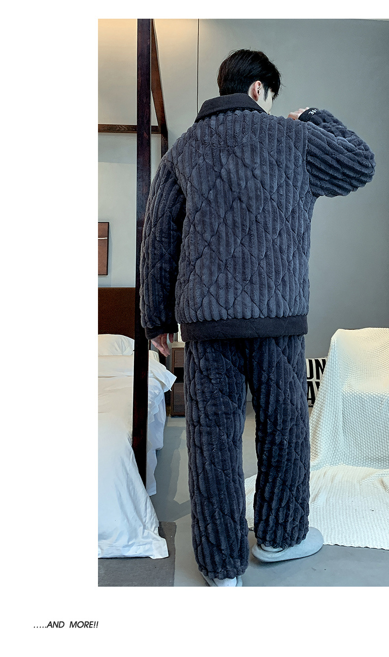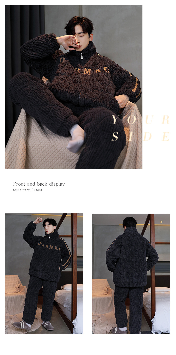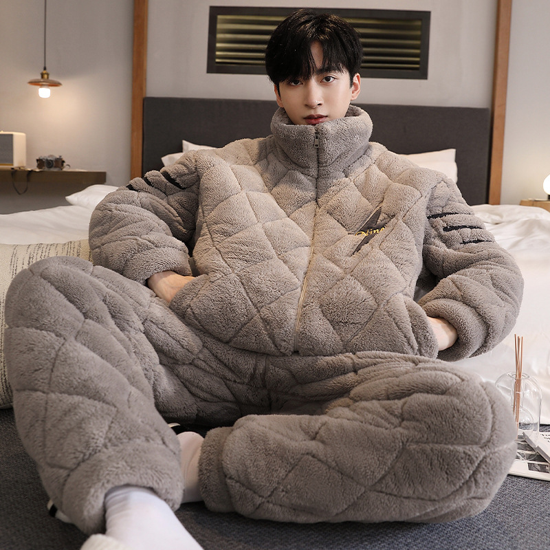 남자의 잠옷 겨울 기모 두꺼운 산호 양털 3 층 클립 면 패딩 재킷 하이 칼라 지퍼 플란넬 가정 옷 세트