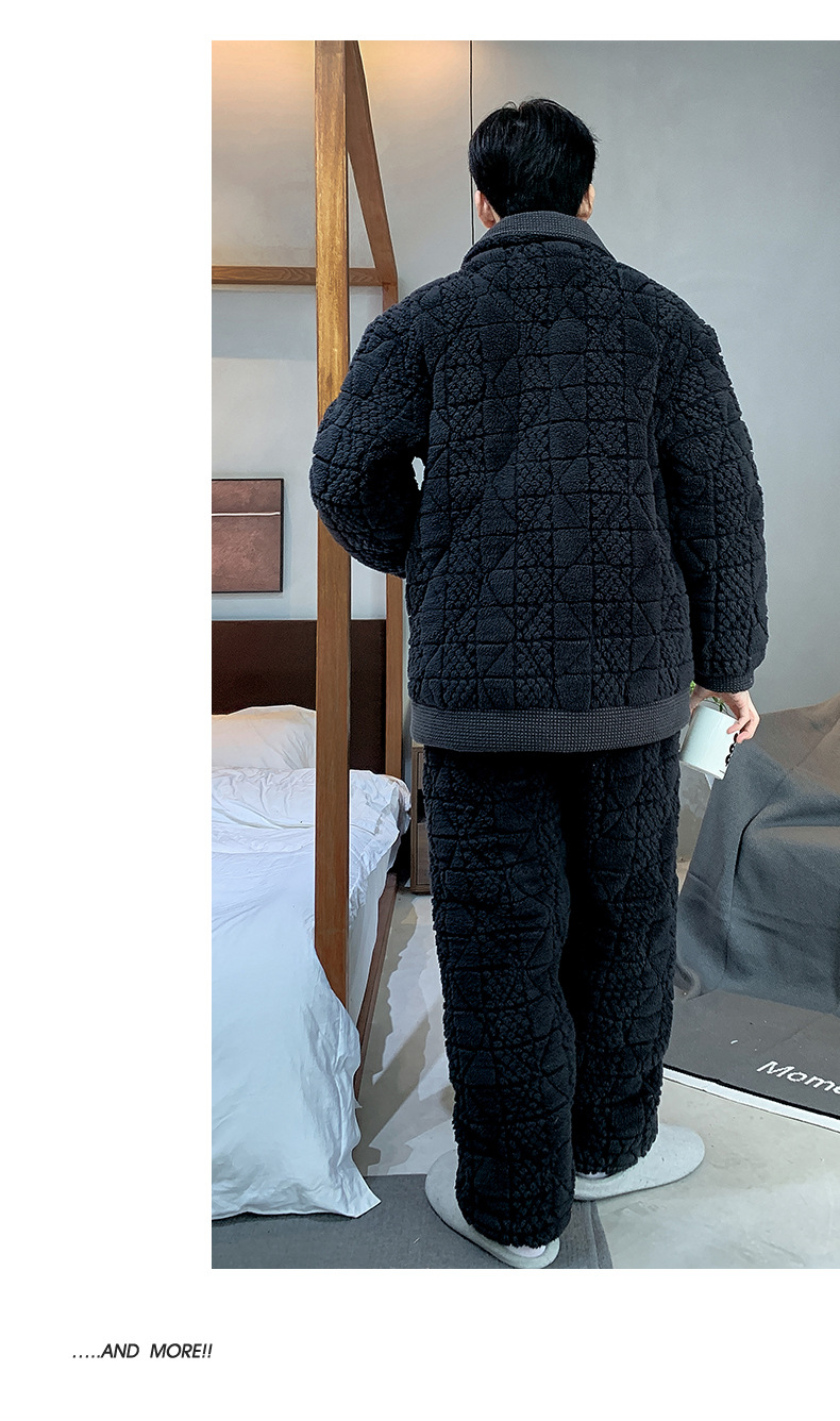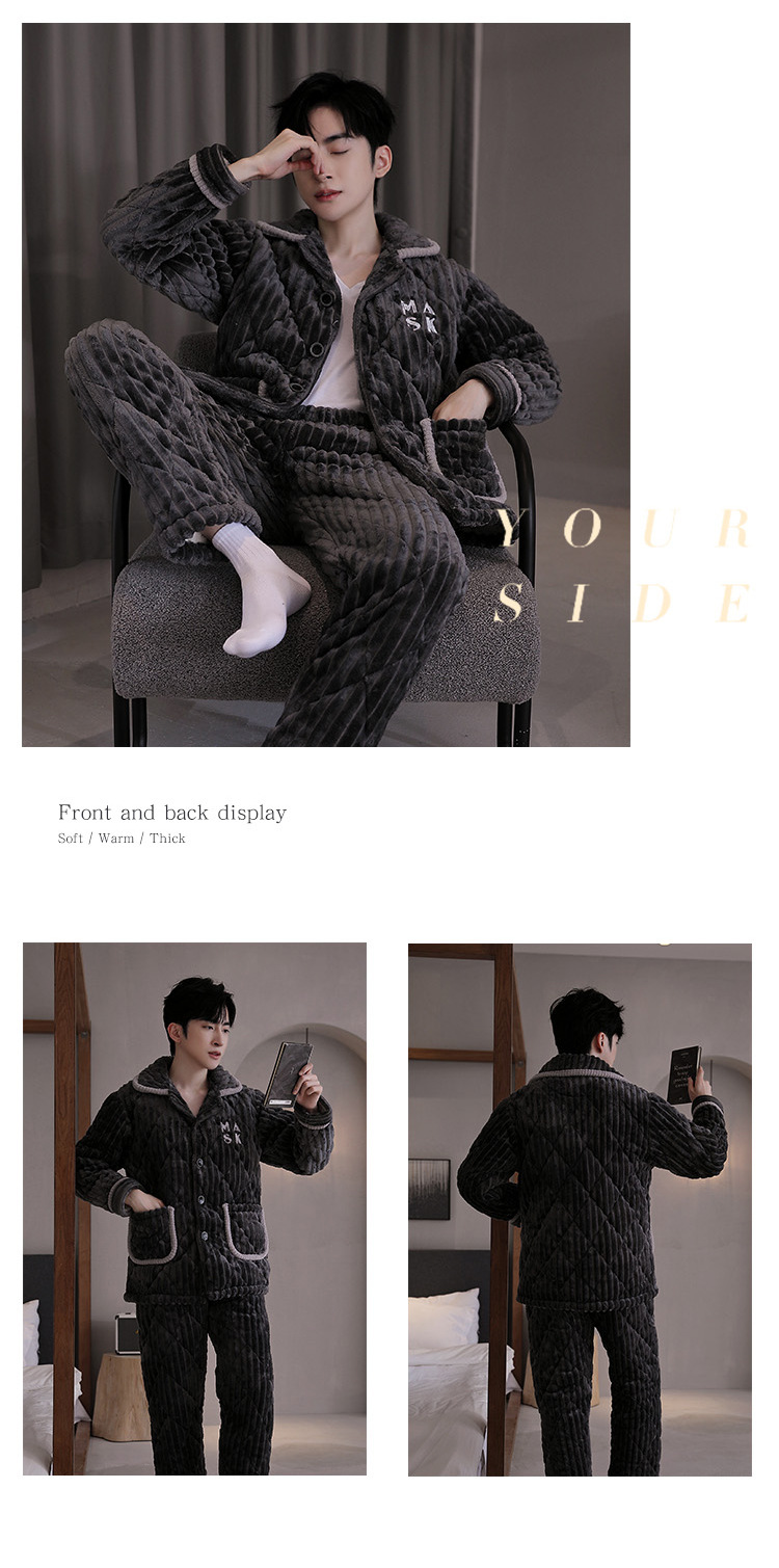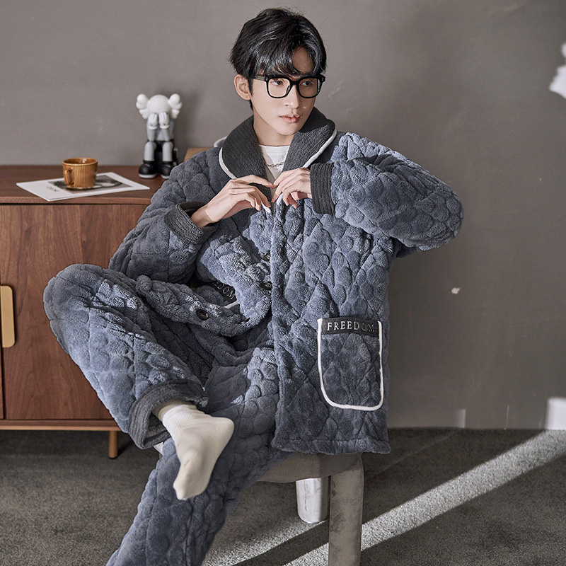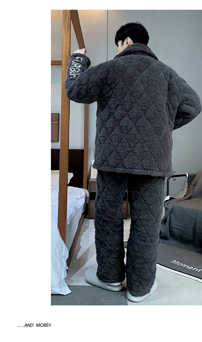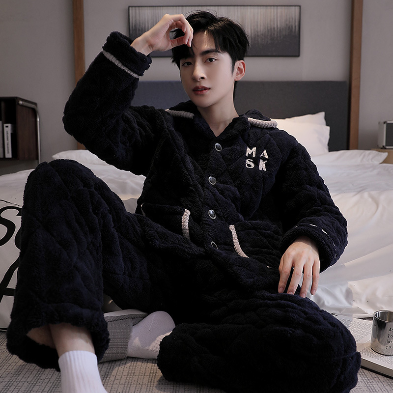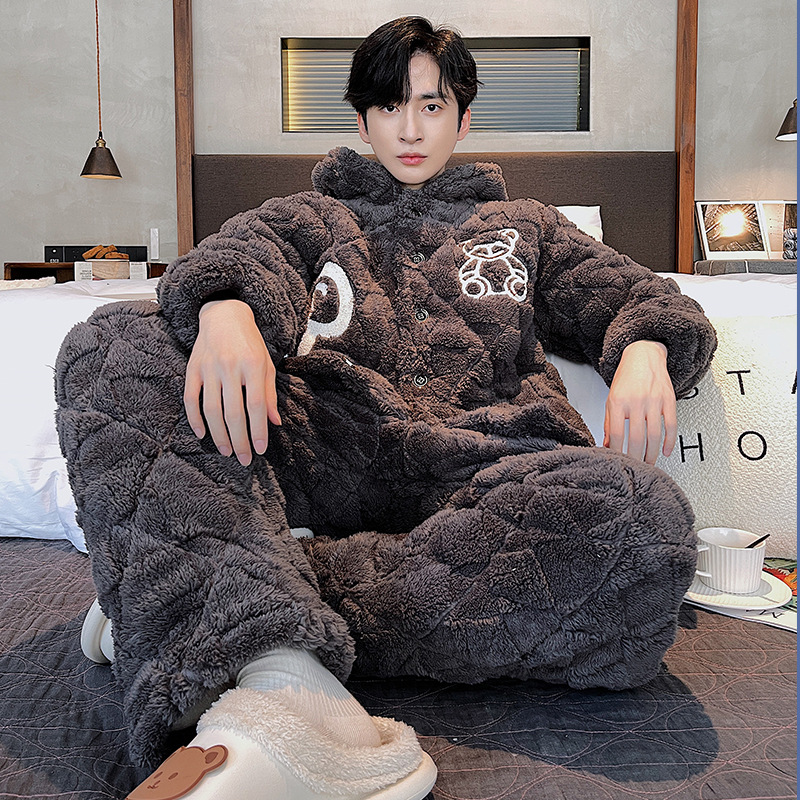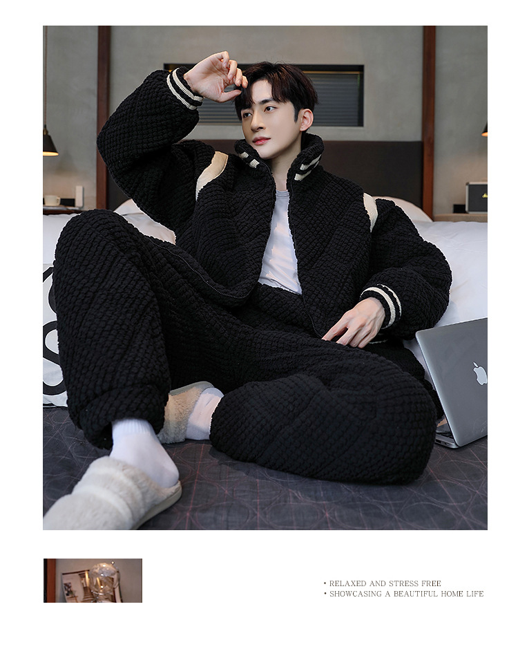 남자의 잠옷 겨울 기모 두꺼운 산호 양털 3 층 클립 면 패딩 재킷 하이 칼라 지퍼 플란넬 가정 옷 세트