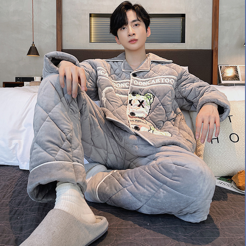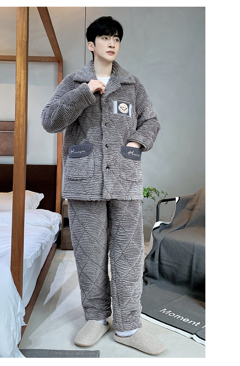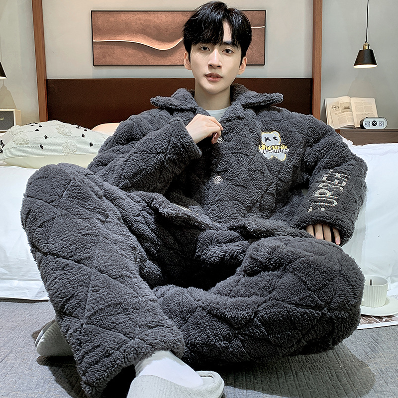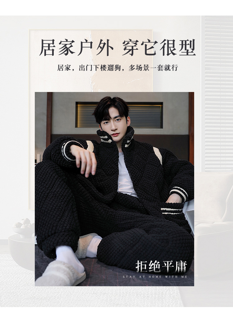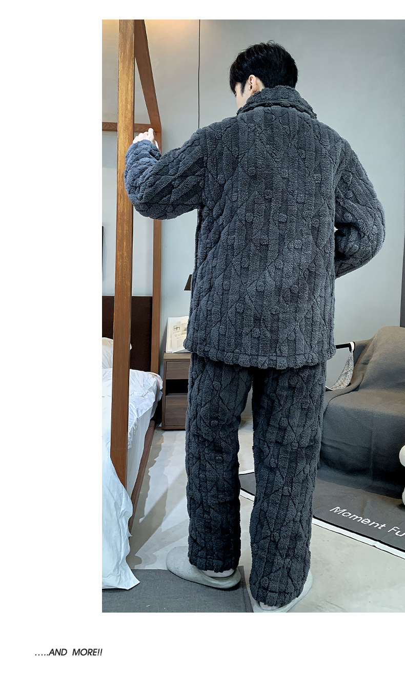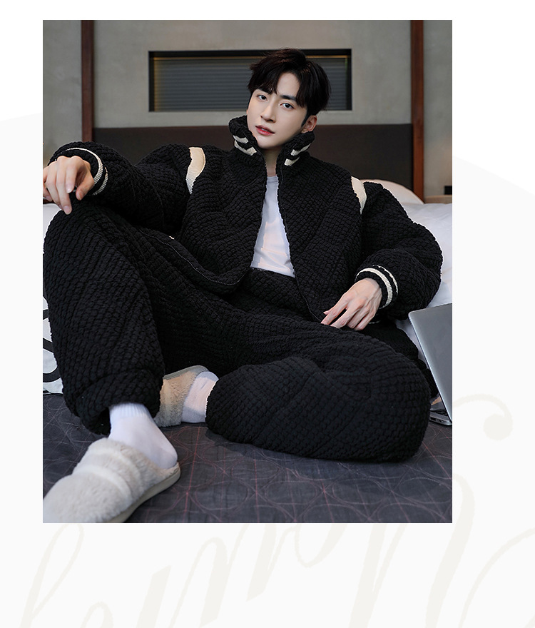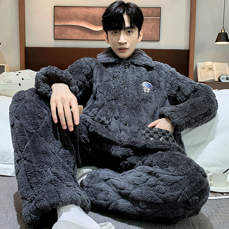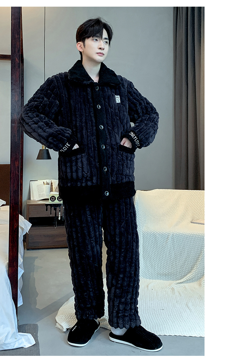 남자의 잠옷 겨울 기모 두꺼운 산호 양털 3 층 클립 면 패딩 재킷 하이 칼라 지퍼 플란넬 가정 옷 세트