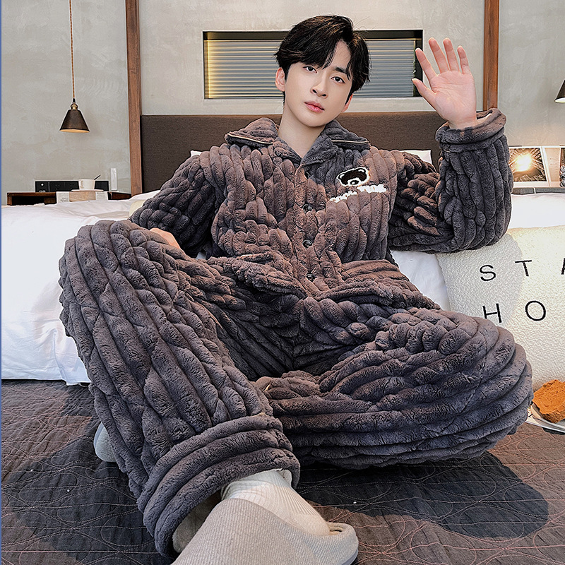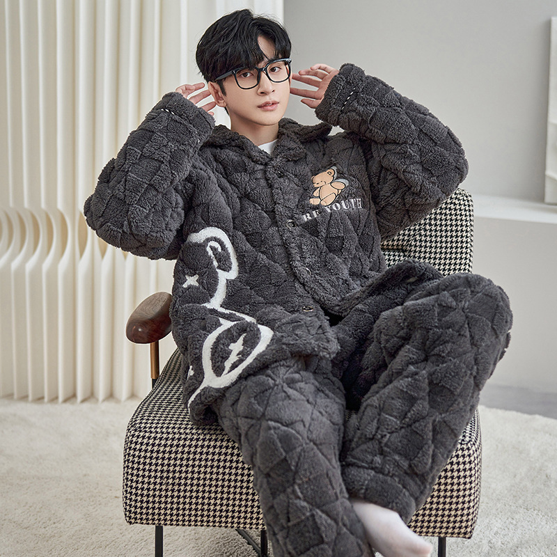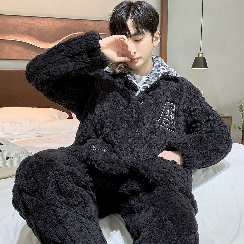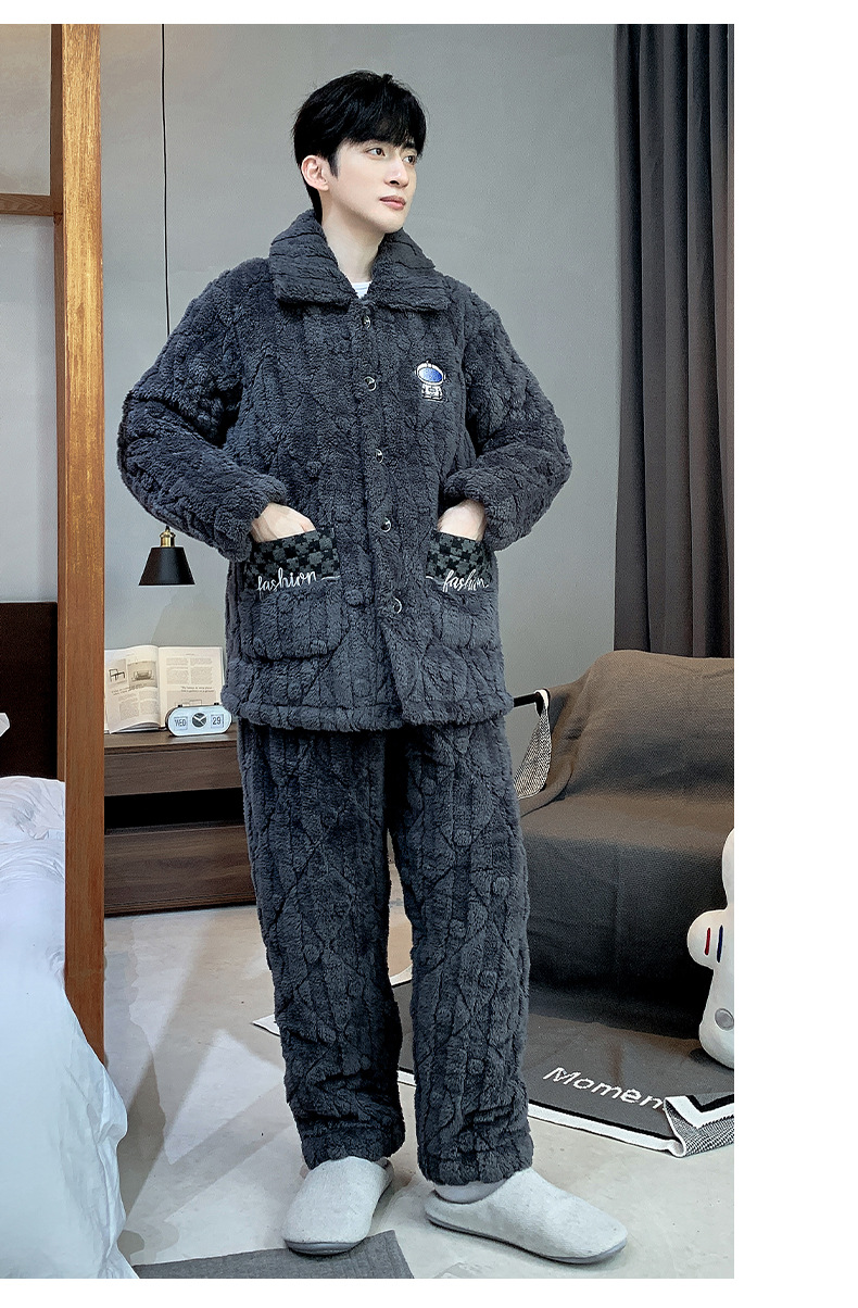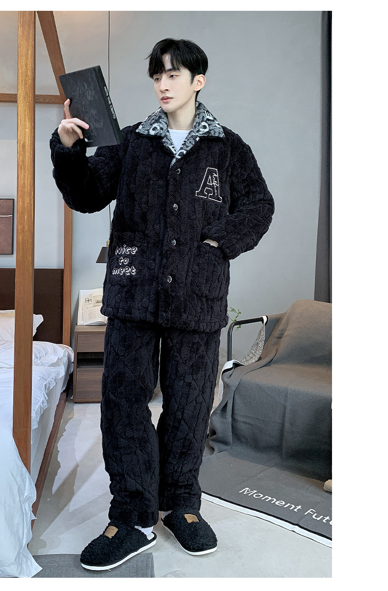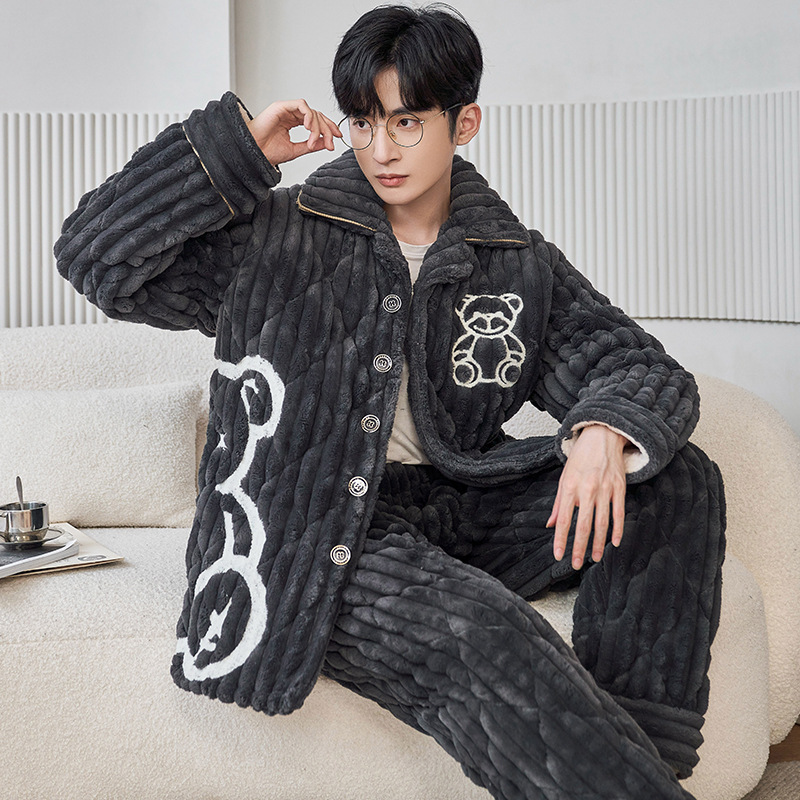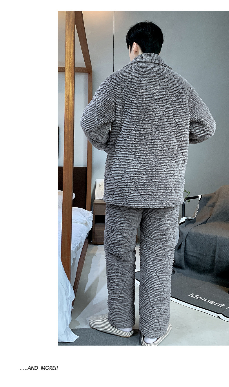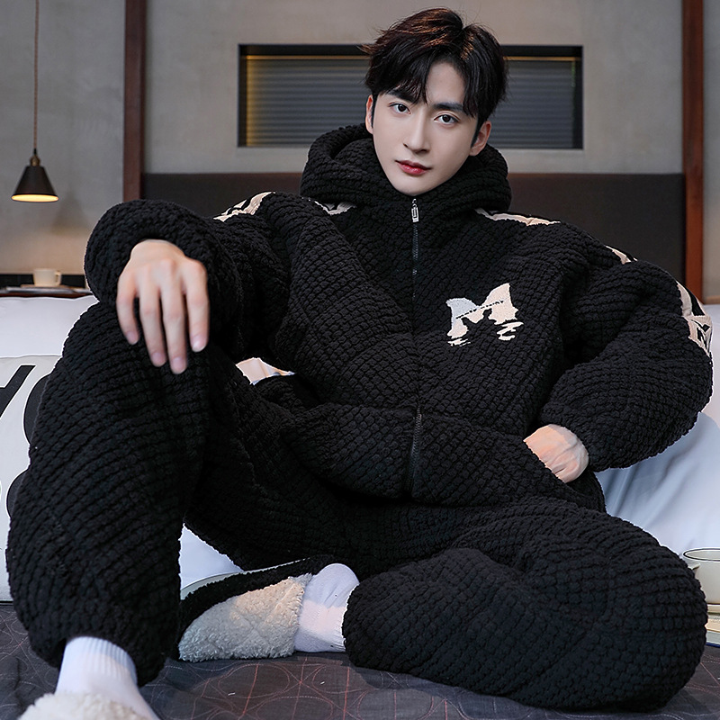 남자의 잠옷 겨울 기모 두꺼운 산호 양털 3 층 클립 면 패딩 재킷 하이 칼라 지퍼 플란넬 가정 옷 세트