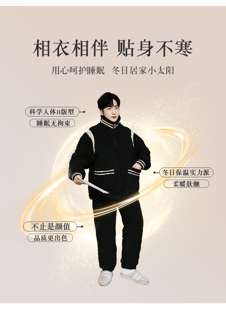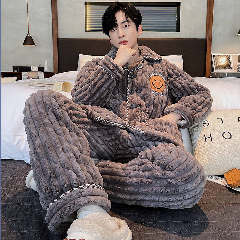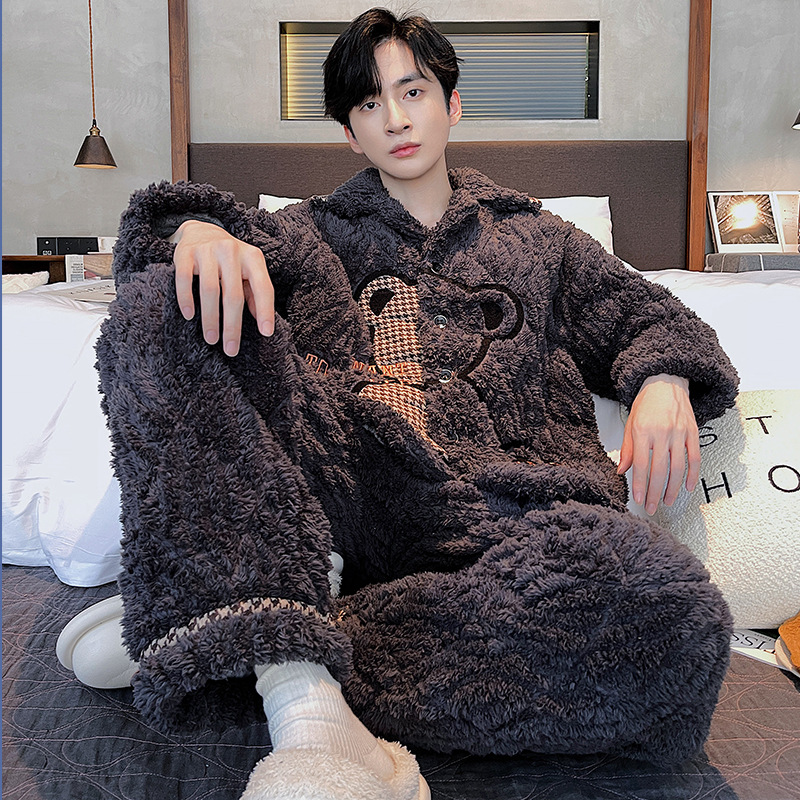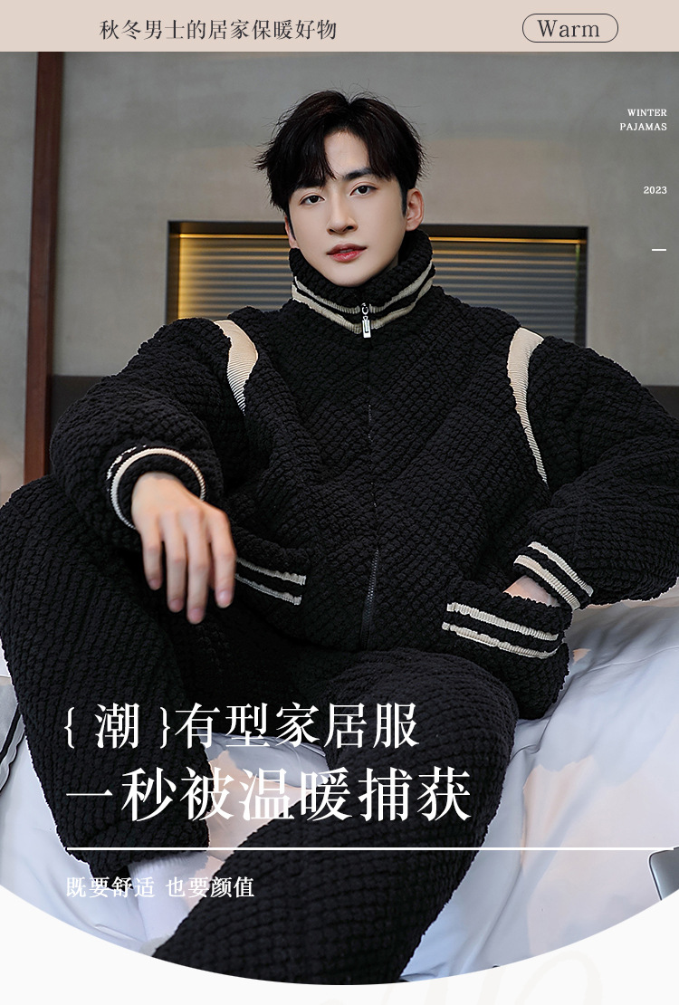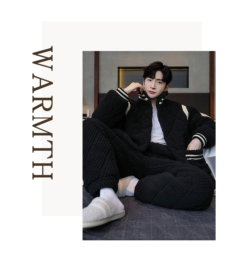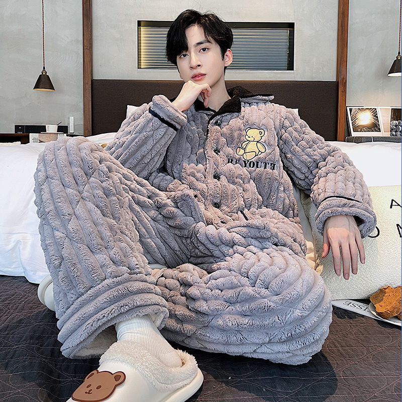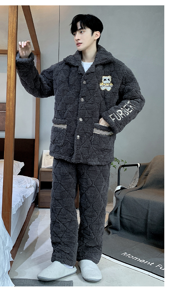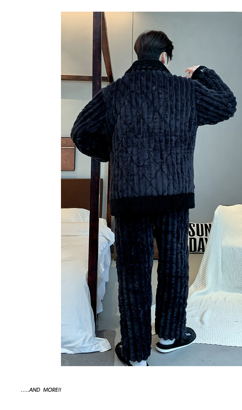 남자의 잠옷 겨울 기모 두꺼운 산호 양털 3 층 클립 면 패딩 재킷 하이 칼라 지퍼 플란넬 가정 옷 세트