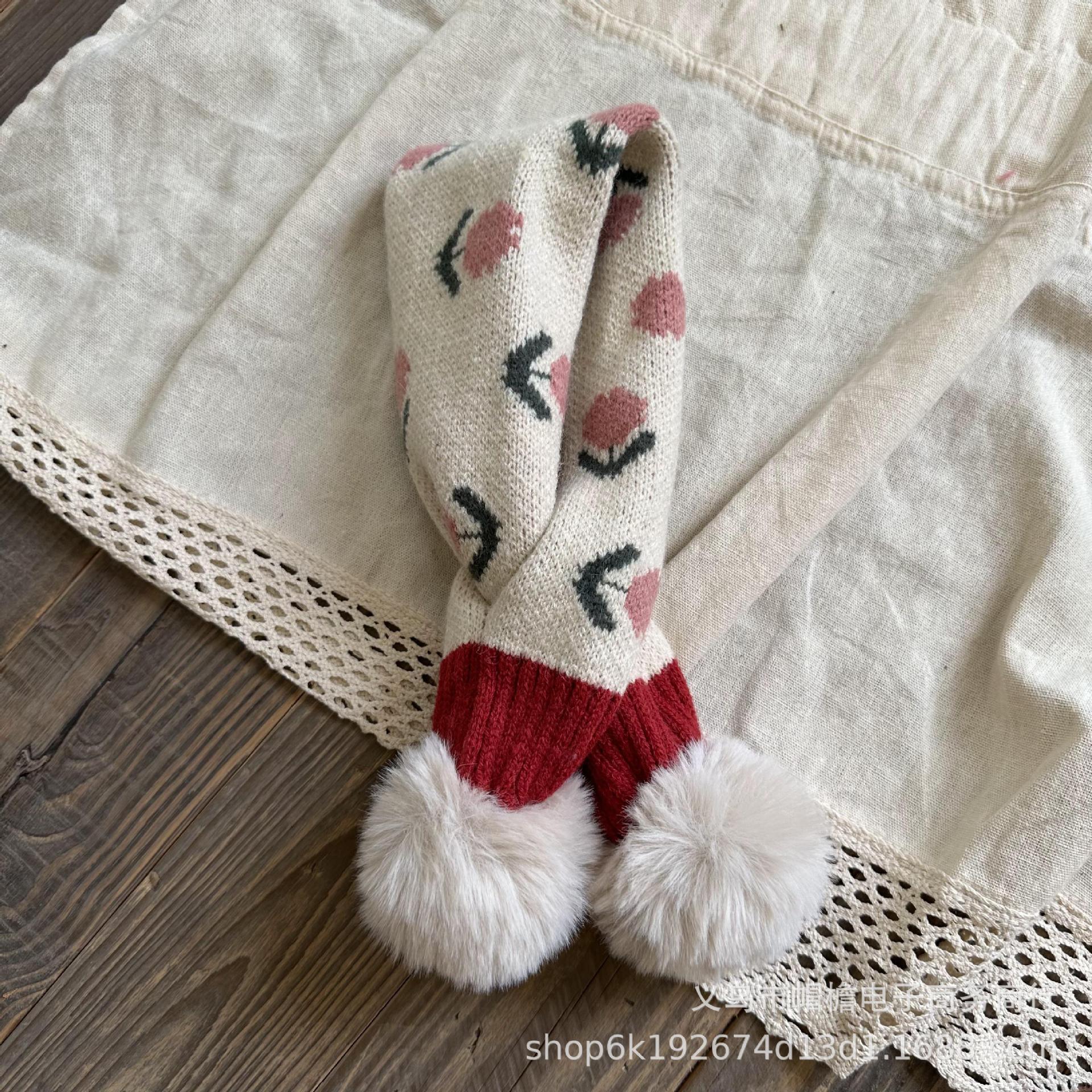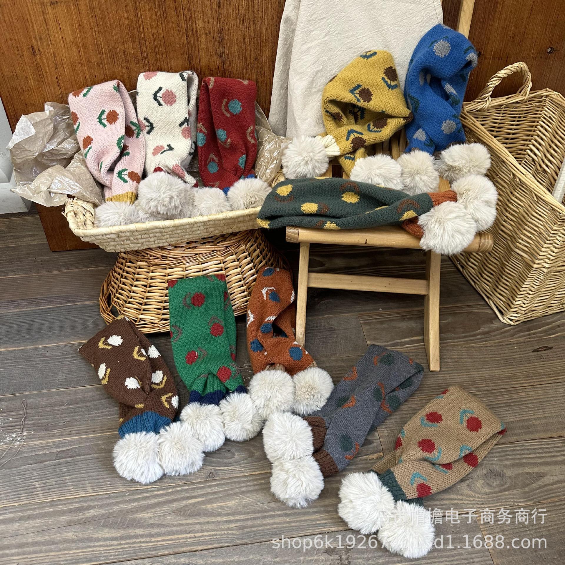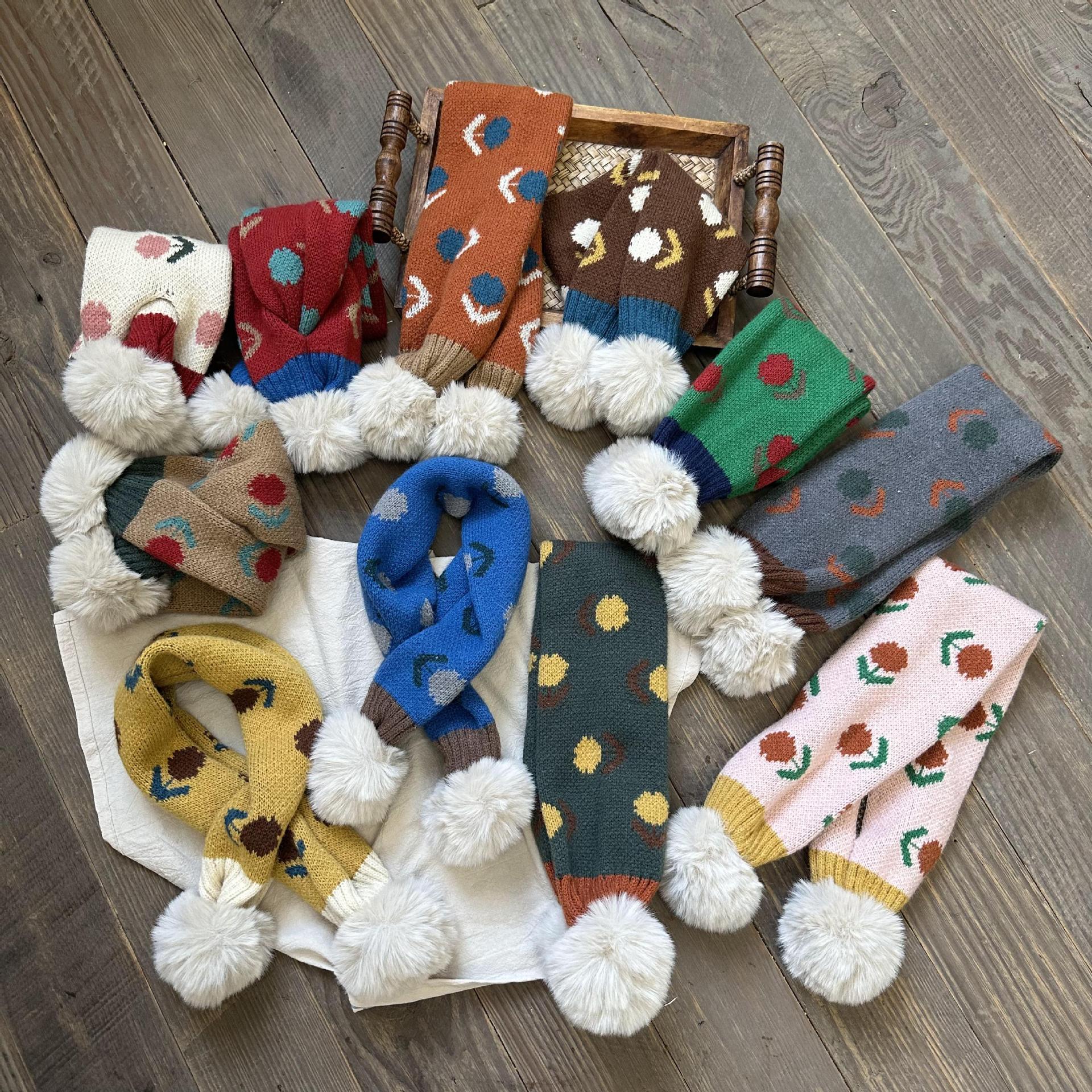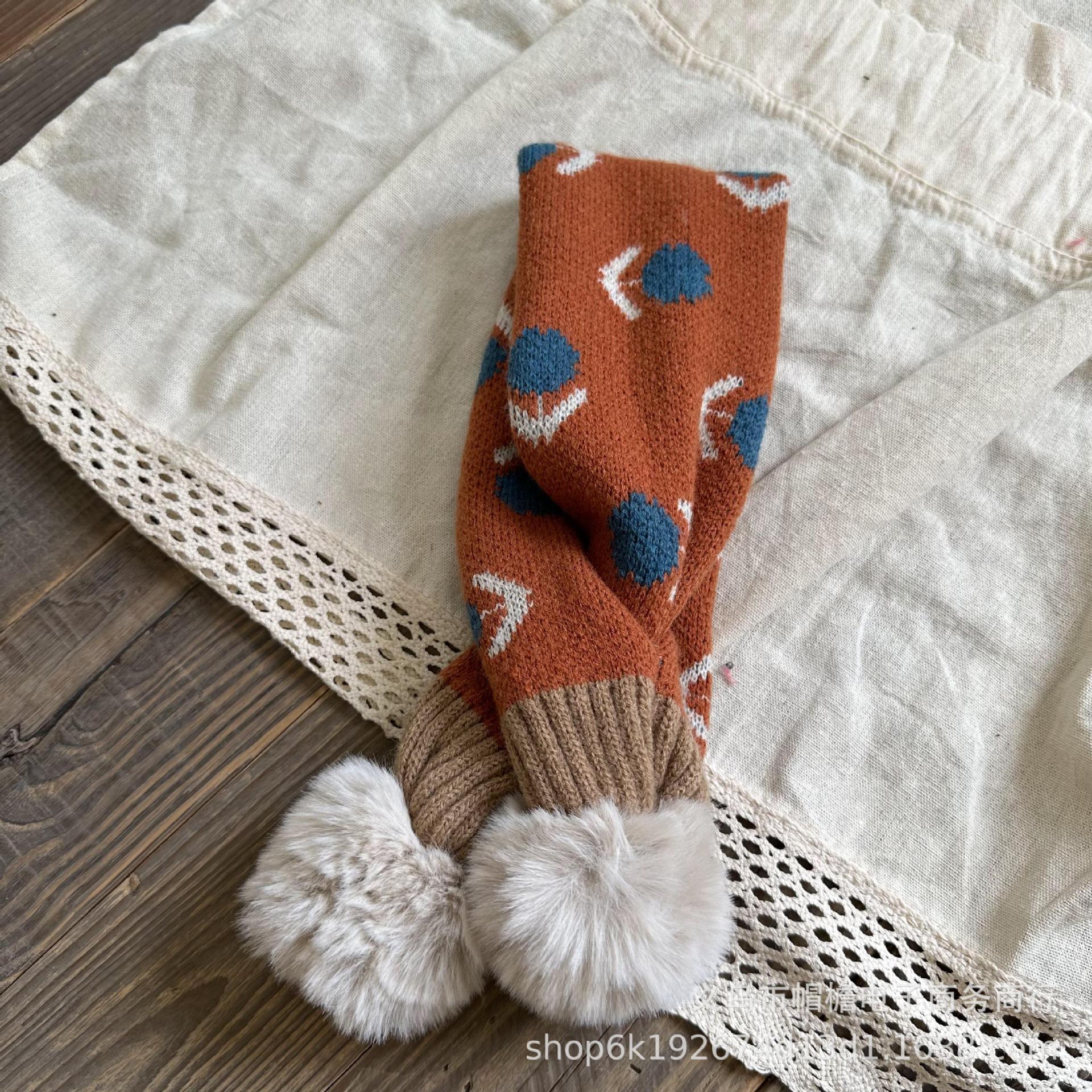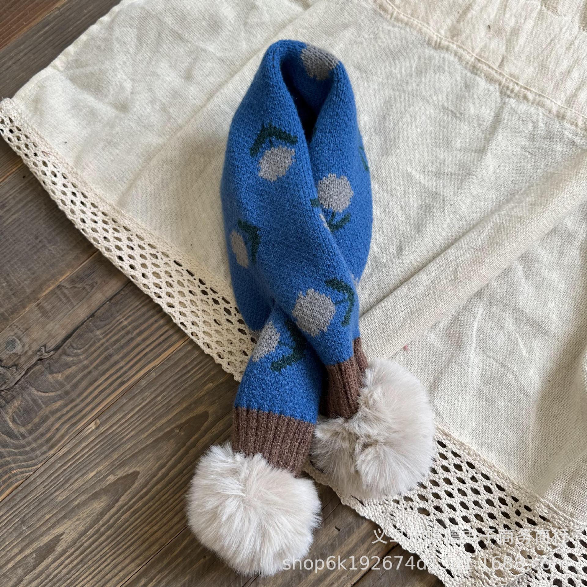 달콤한 복고풍 아기 모피 볼 크로스 스카프 가을과 겨울 야외 따뜻한 어린이 니트 작은 신선한 꽃 스카프스토어 가기