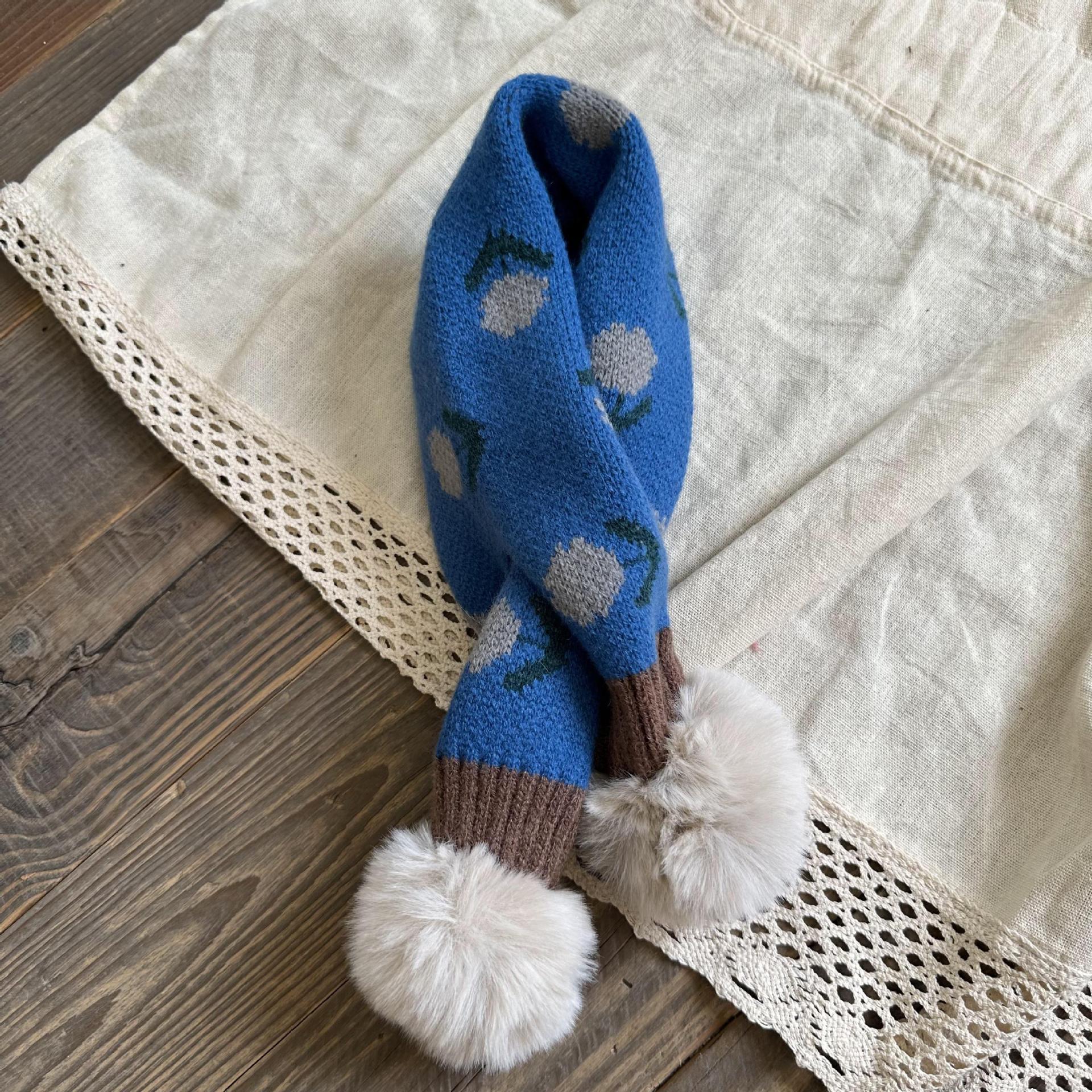 달콤한 복고풍 아기 모피 볼 크로스 스카프 가을과 겨울 야외 따뜻한 어린이 니트 작은 신선한 꽃 스카프