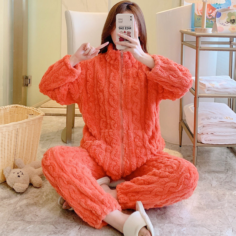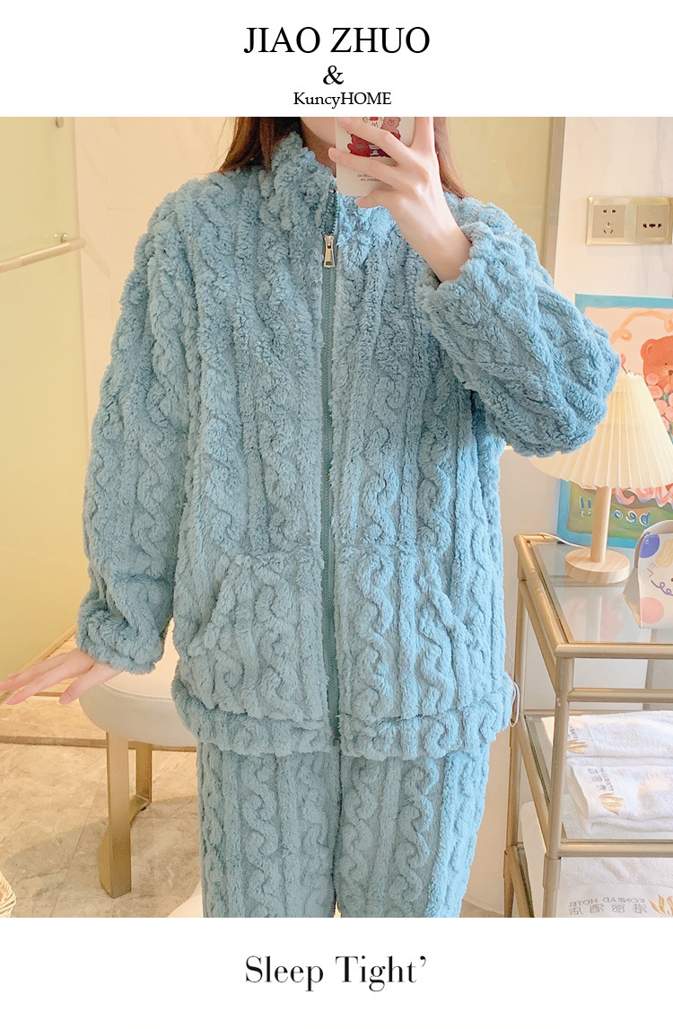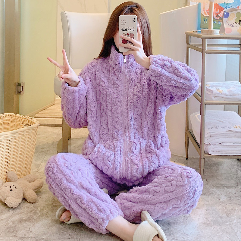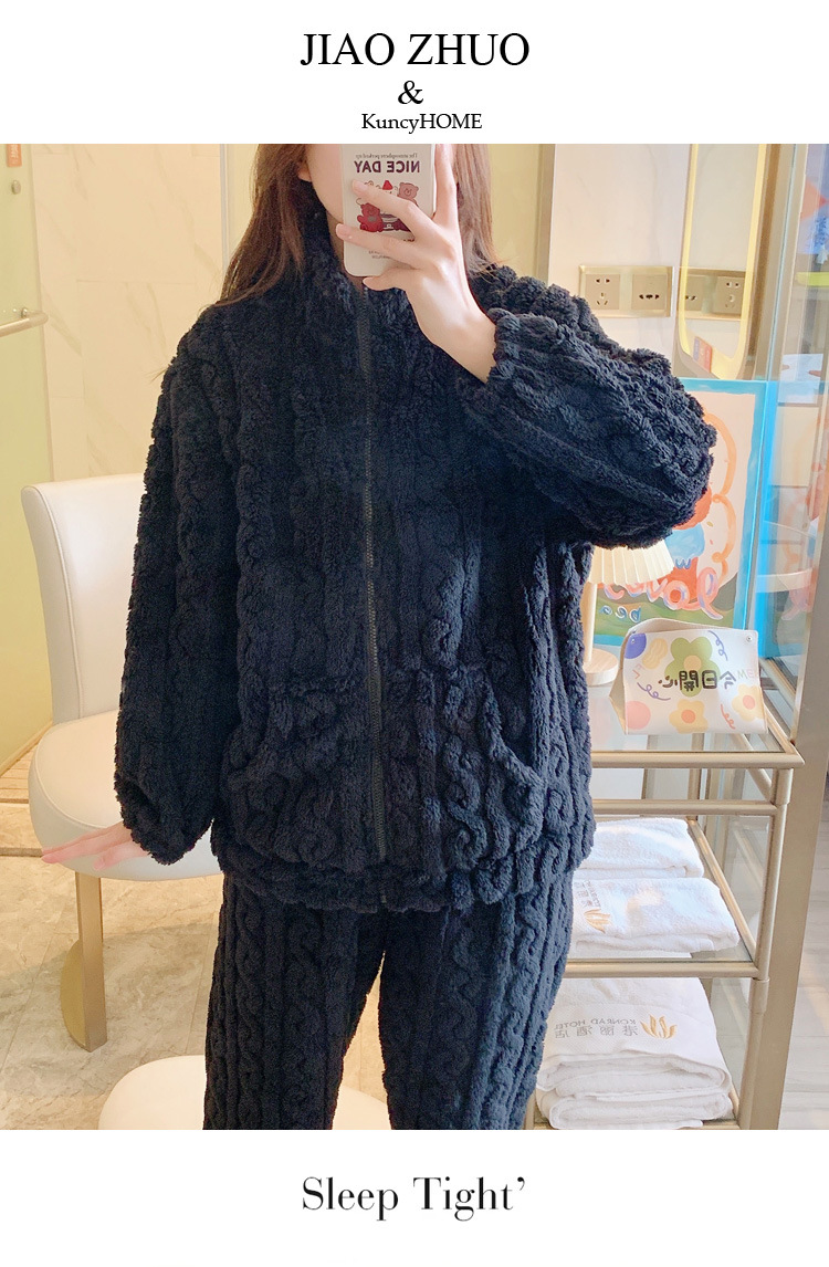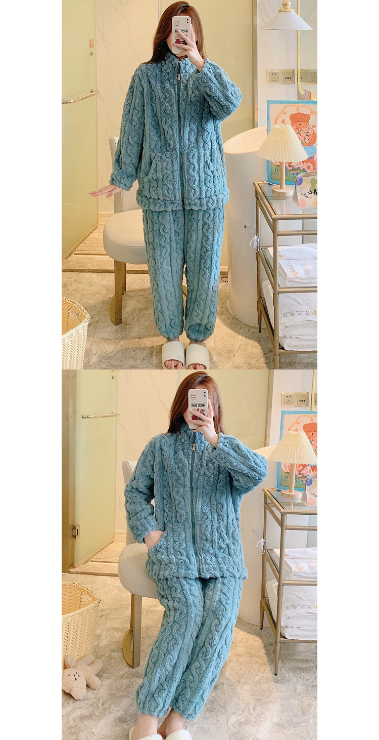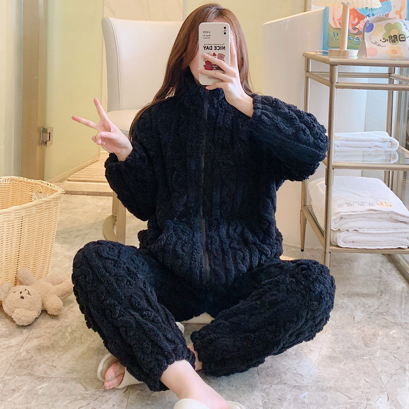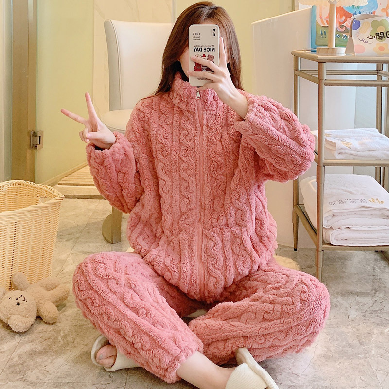 높은 칼라 지퍼 캐주얼 잠옷 여자의 가을과 겨울 두꺼운 기모 산호 양털 플란넬 가정 옷 세트 겉옷스토어 가기