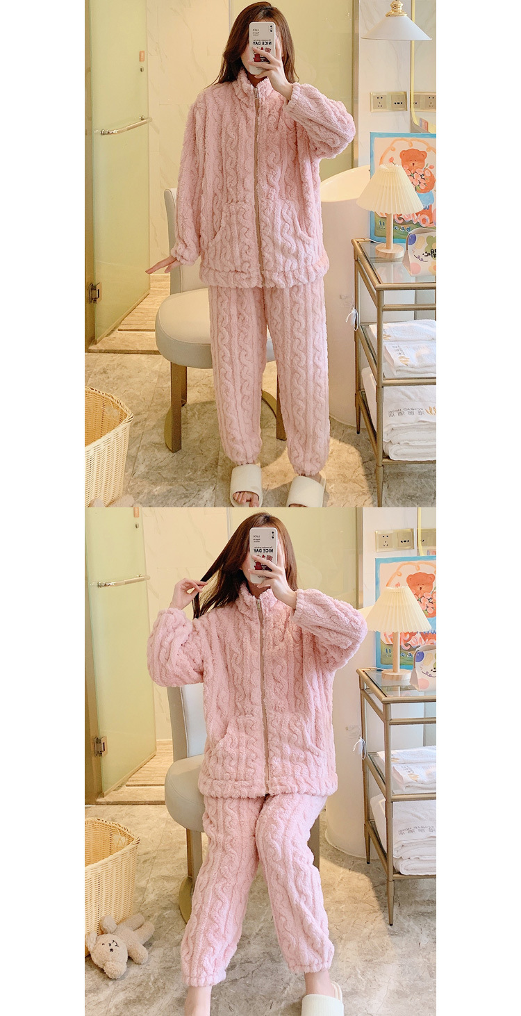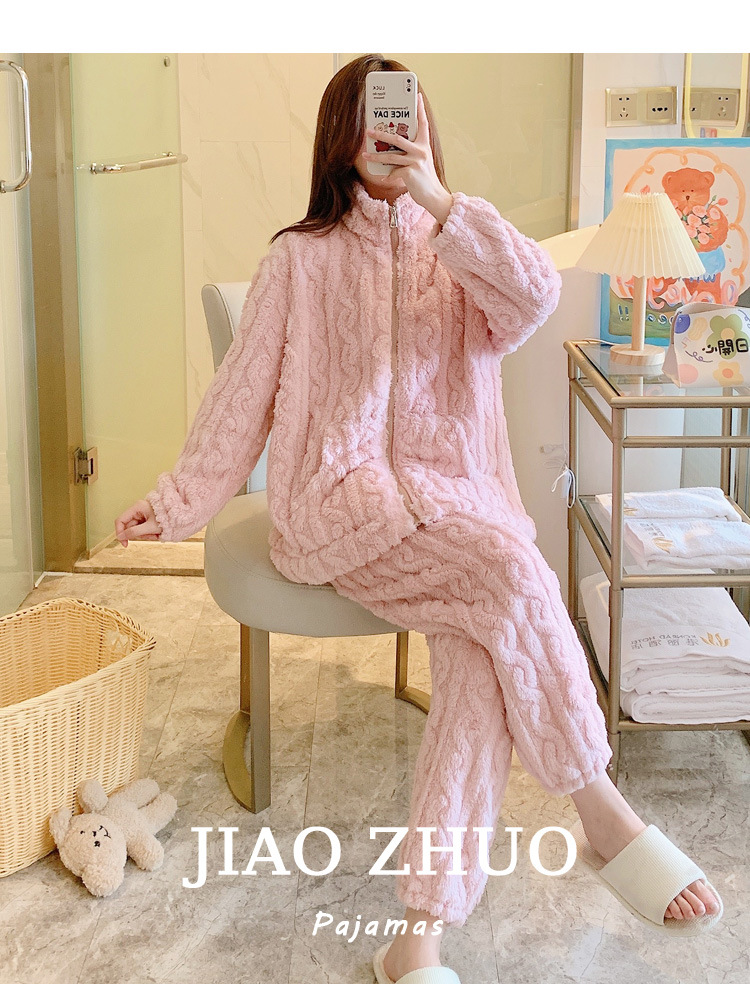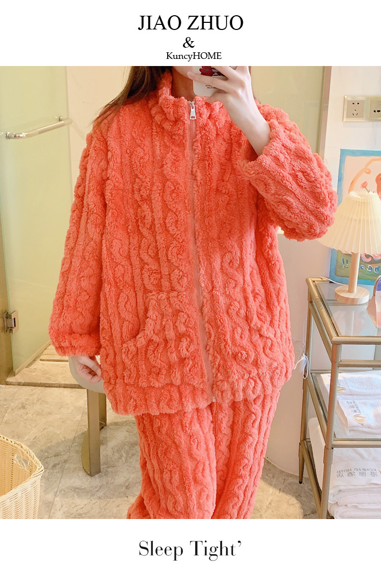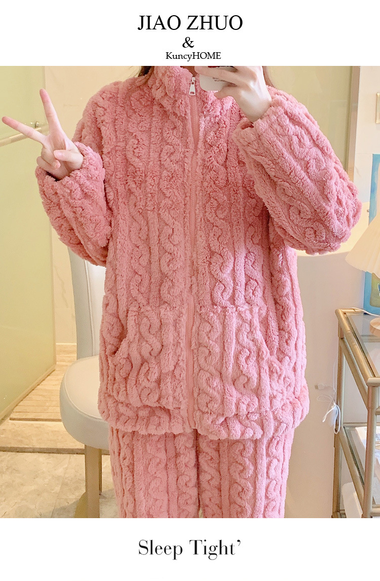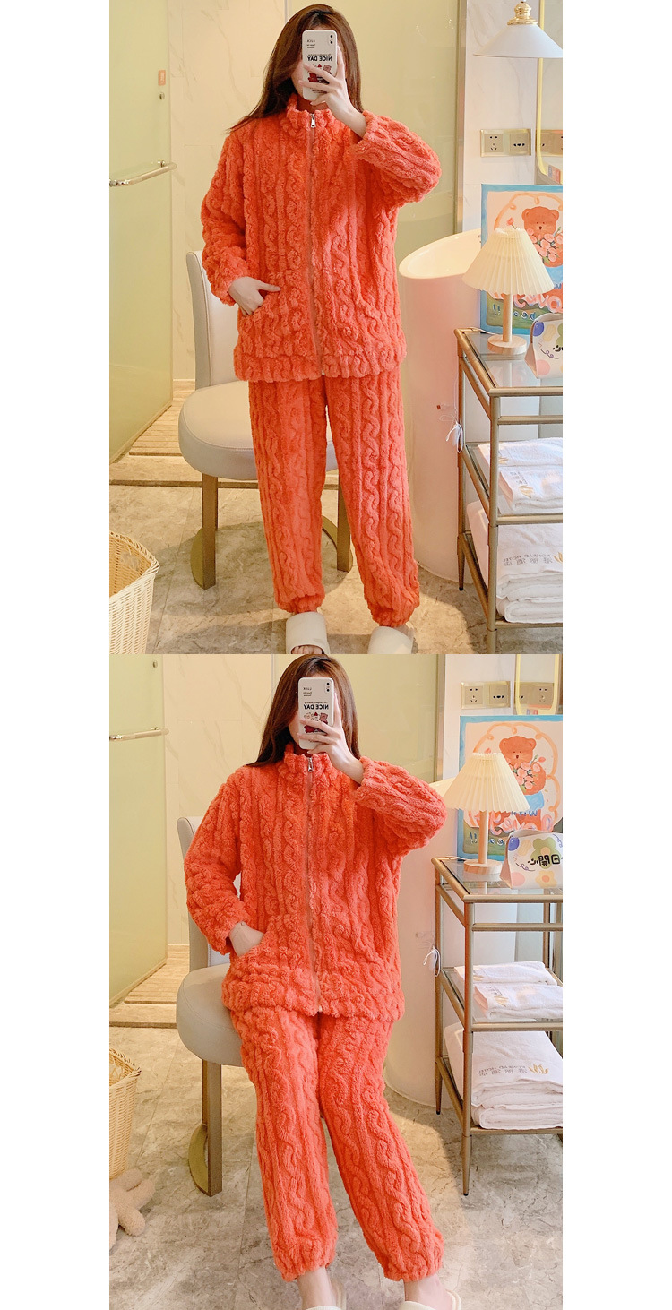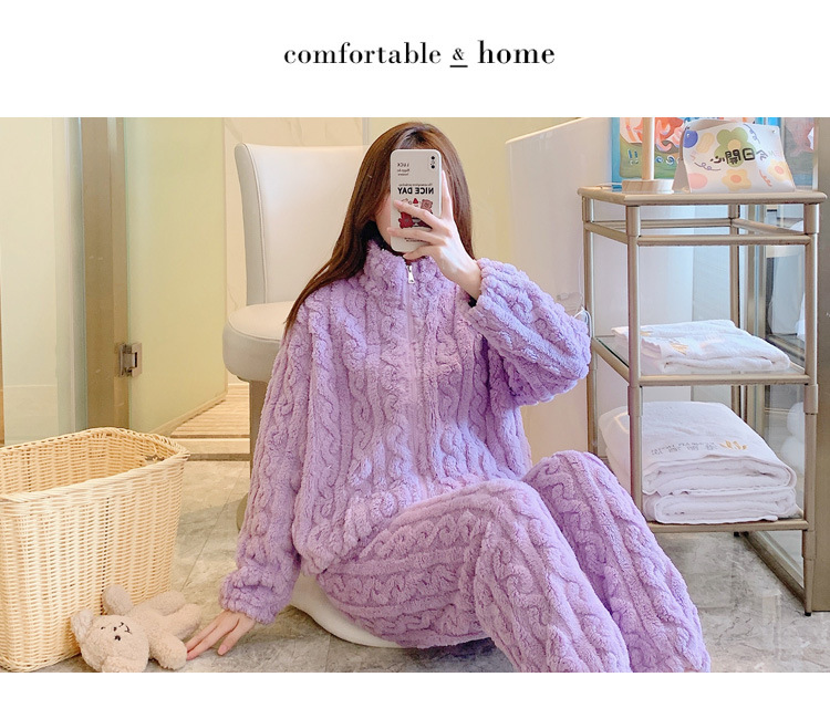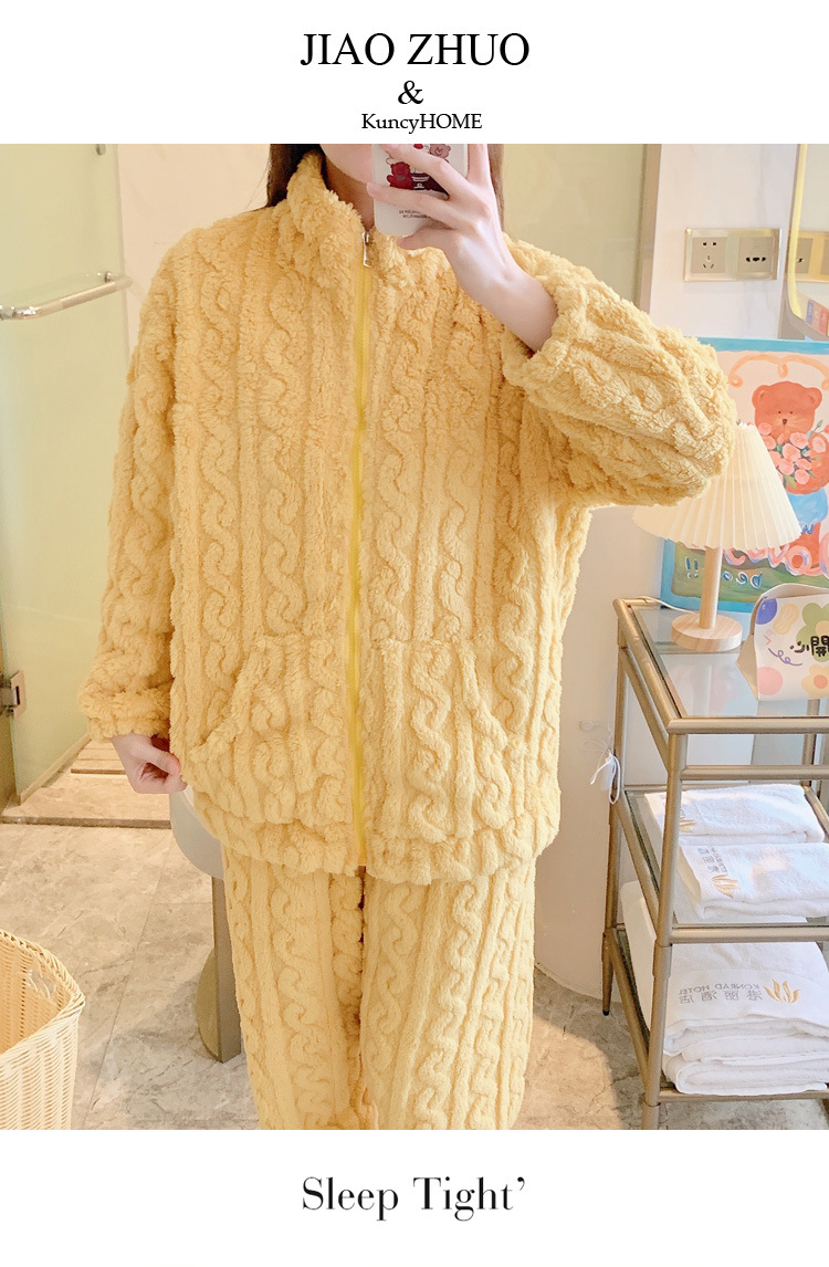 높은 칼라 지퍼 캐주얼 잠옷 여자의 가을과 겨울 두꺼운 기모 산호 양털 플란넬 가정 옷 세트 겉옷스토어 가기
