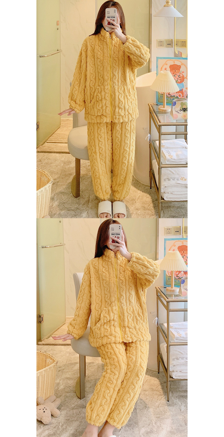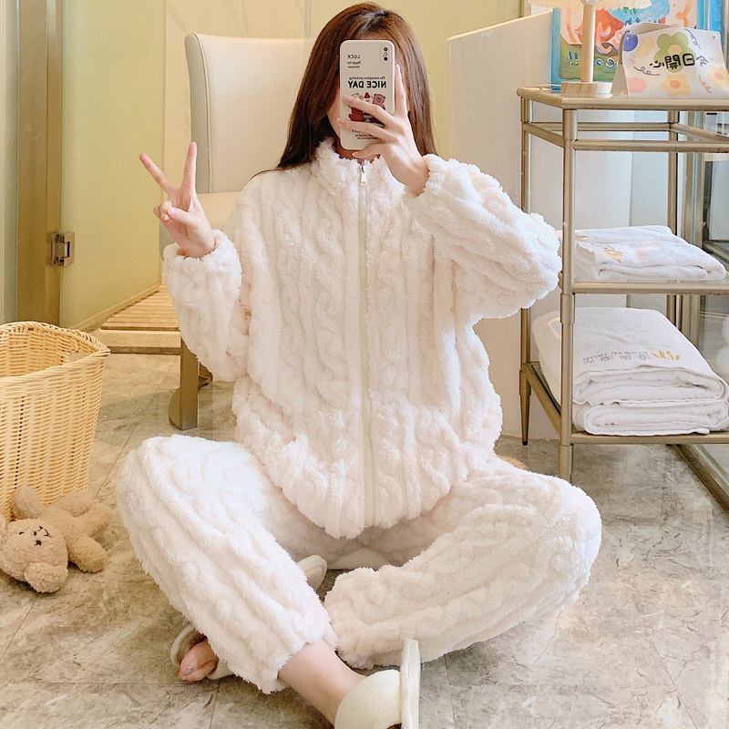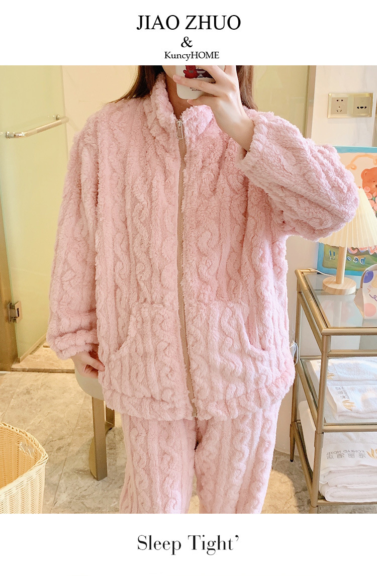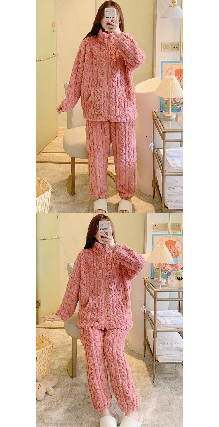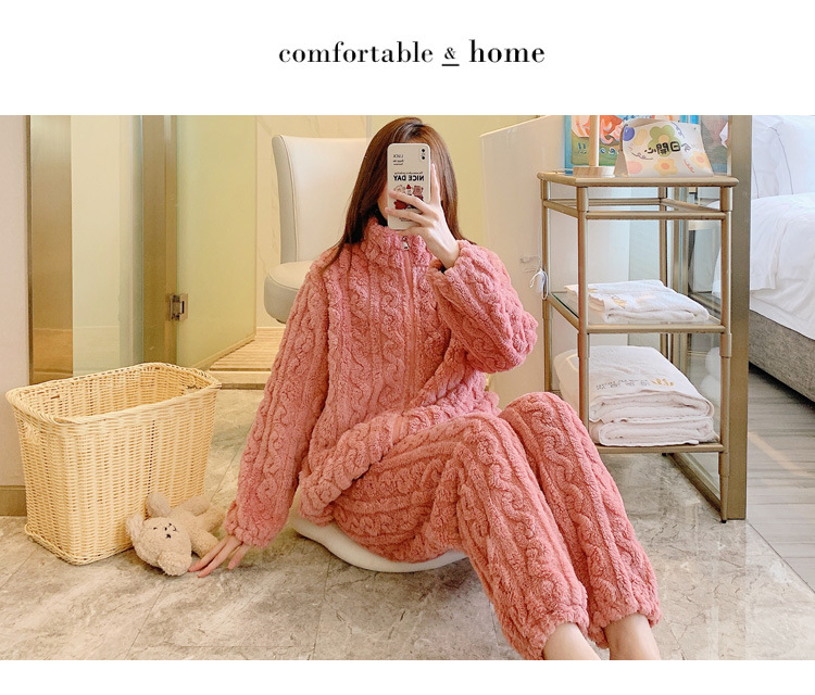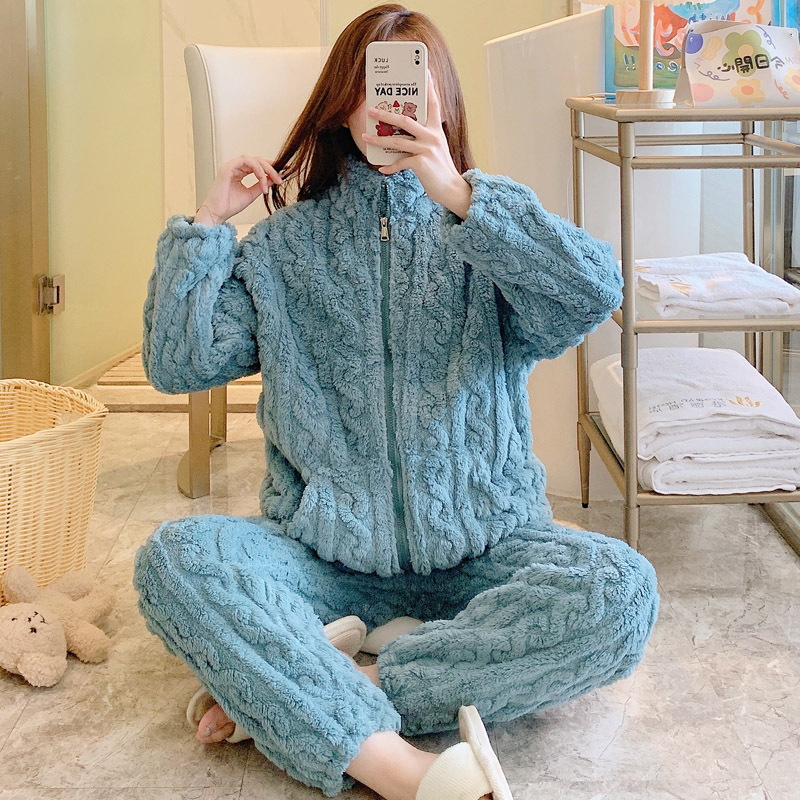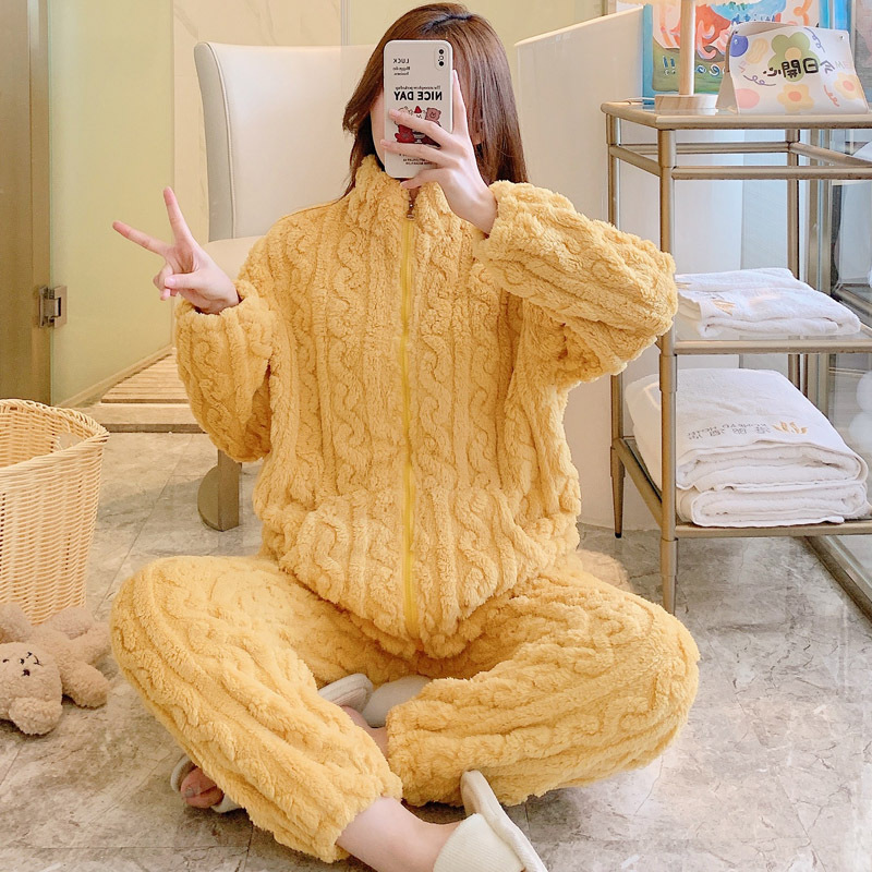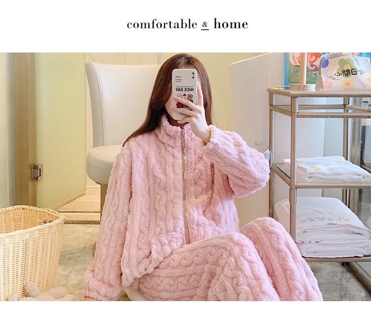 높은 칼라 지퍼 캐주얼 잠옷 여자의 가을과 겨울 두꺼운 기모 산호 양털 플란넬 가정 옷 세트 겉옷스토어 가기