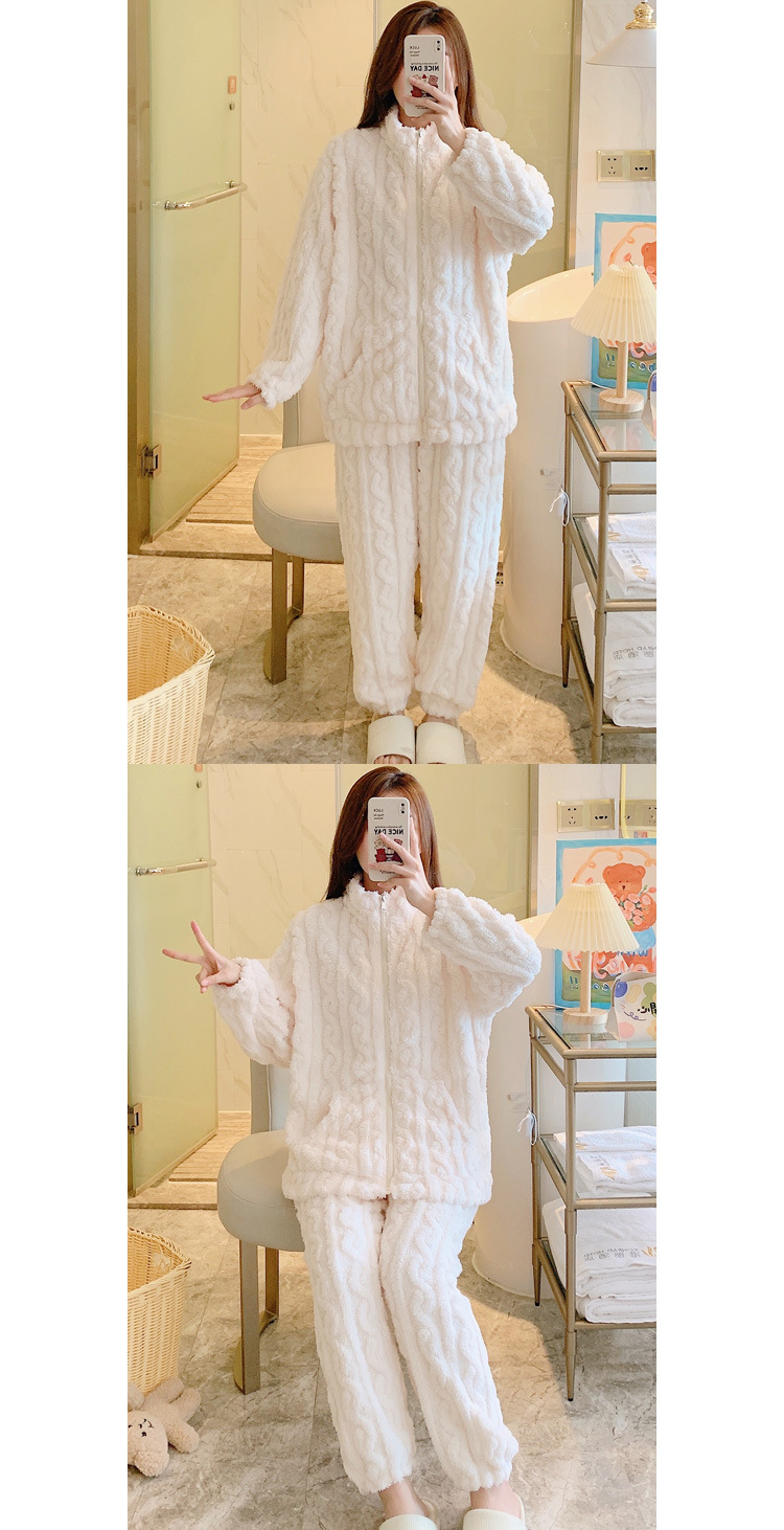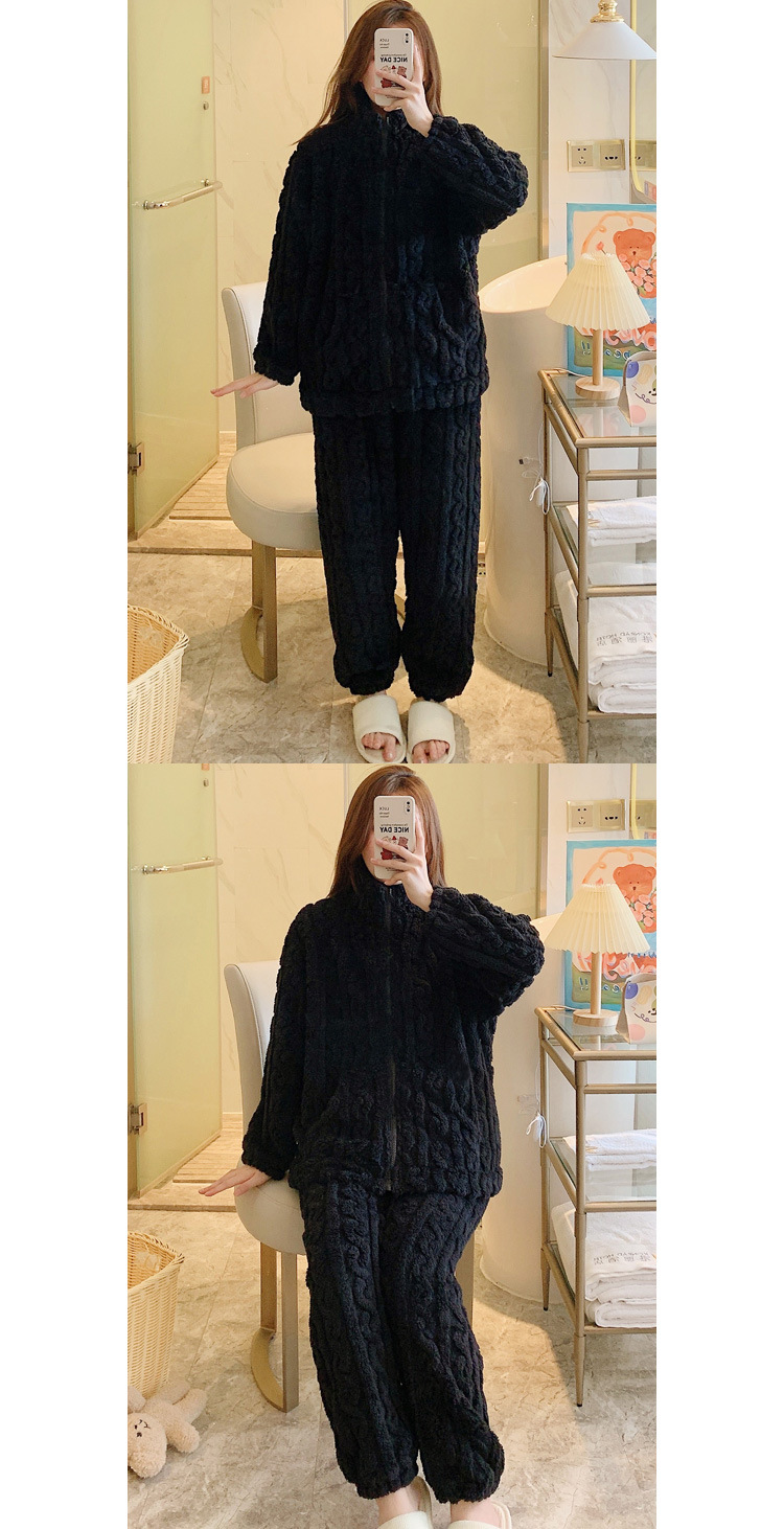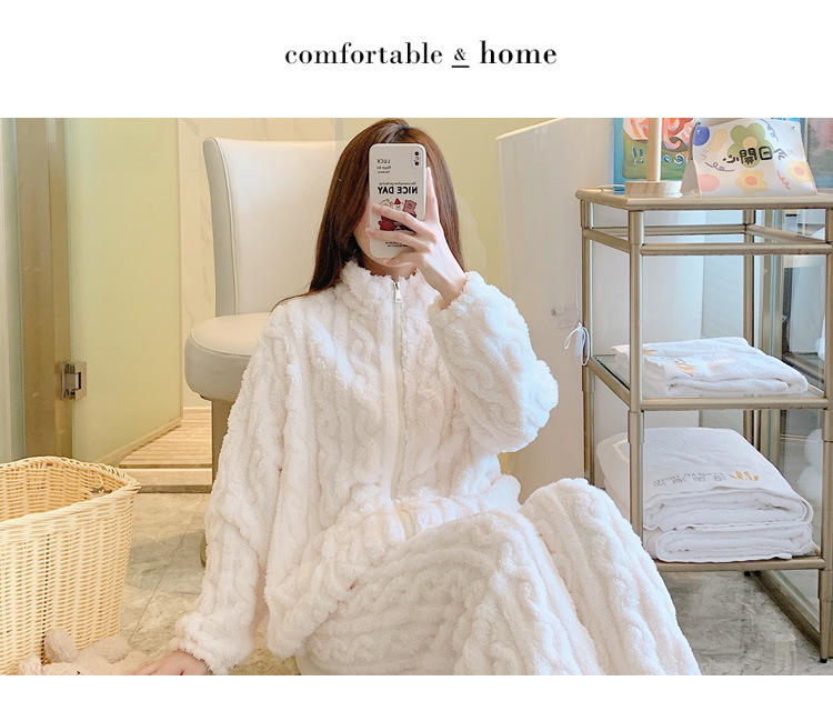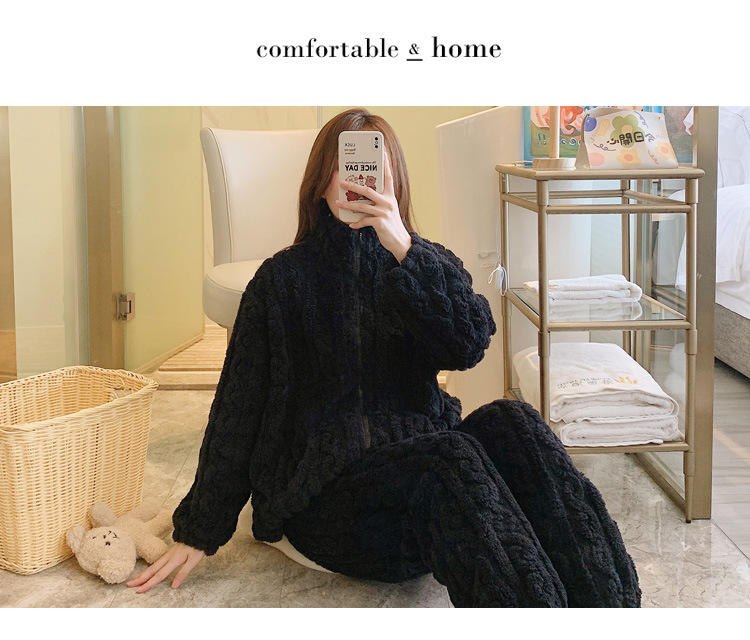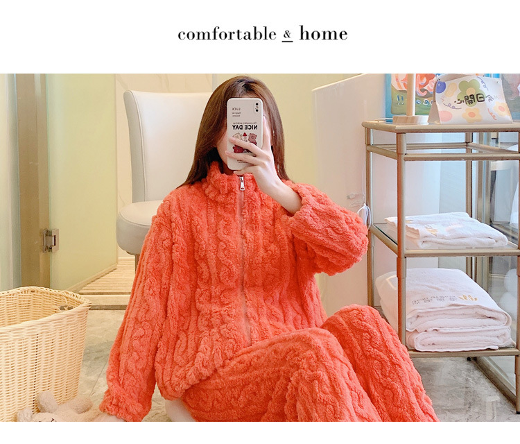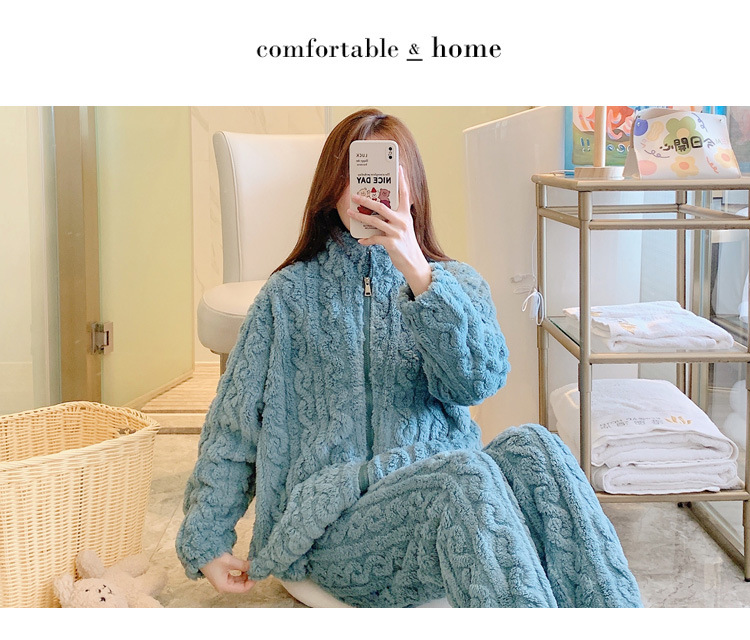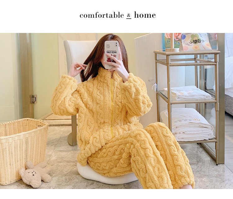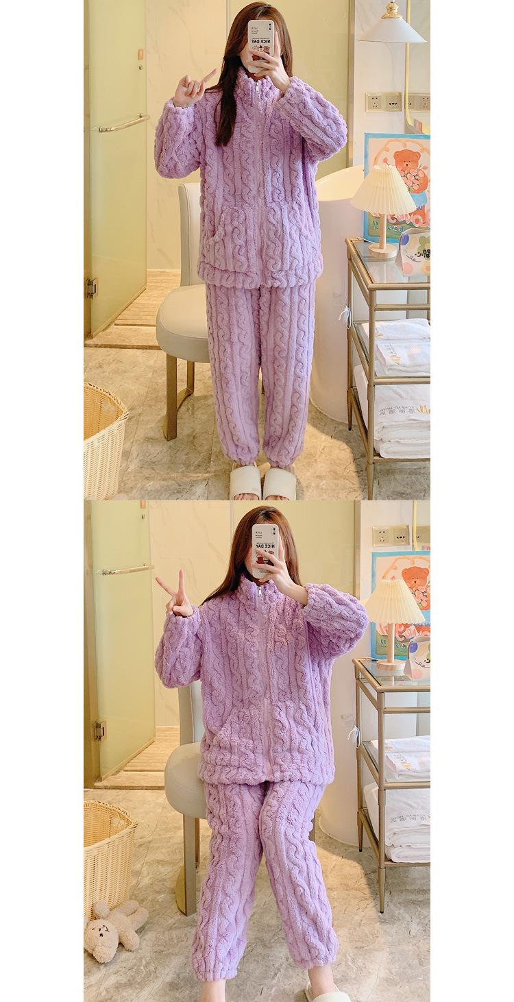 높은 칼라 지퍼 캐주얼 잠옷 여자의 가을과 겨울 두꺼운 기모 산호 양털 플란넬 가정 옷 세트 겉옷스토어 가기