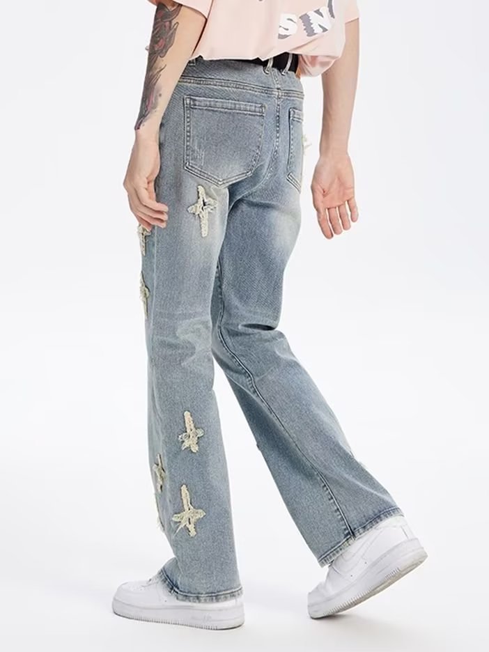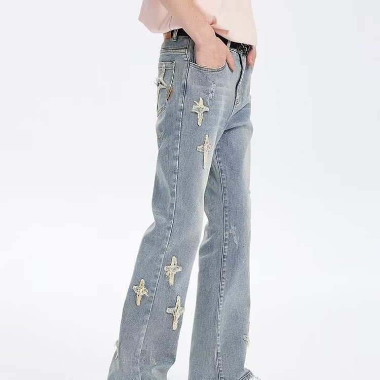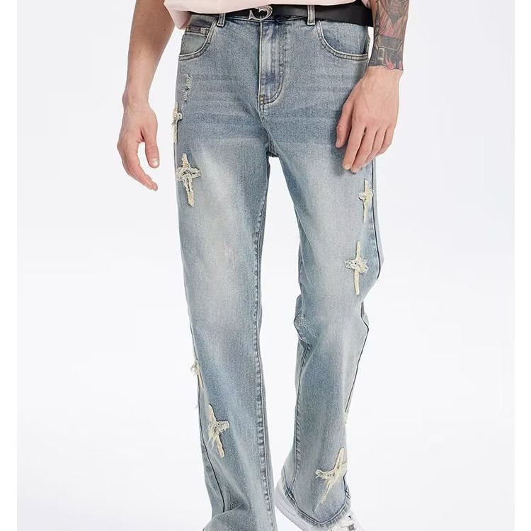 겨울 유행 브랜드 아메리칸 스타일 라이트 블루 청바지 남성용 하이 스트리트 성격 느슨한 스트레이트 크로스 긴 바지 학생용스토어 가기