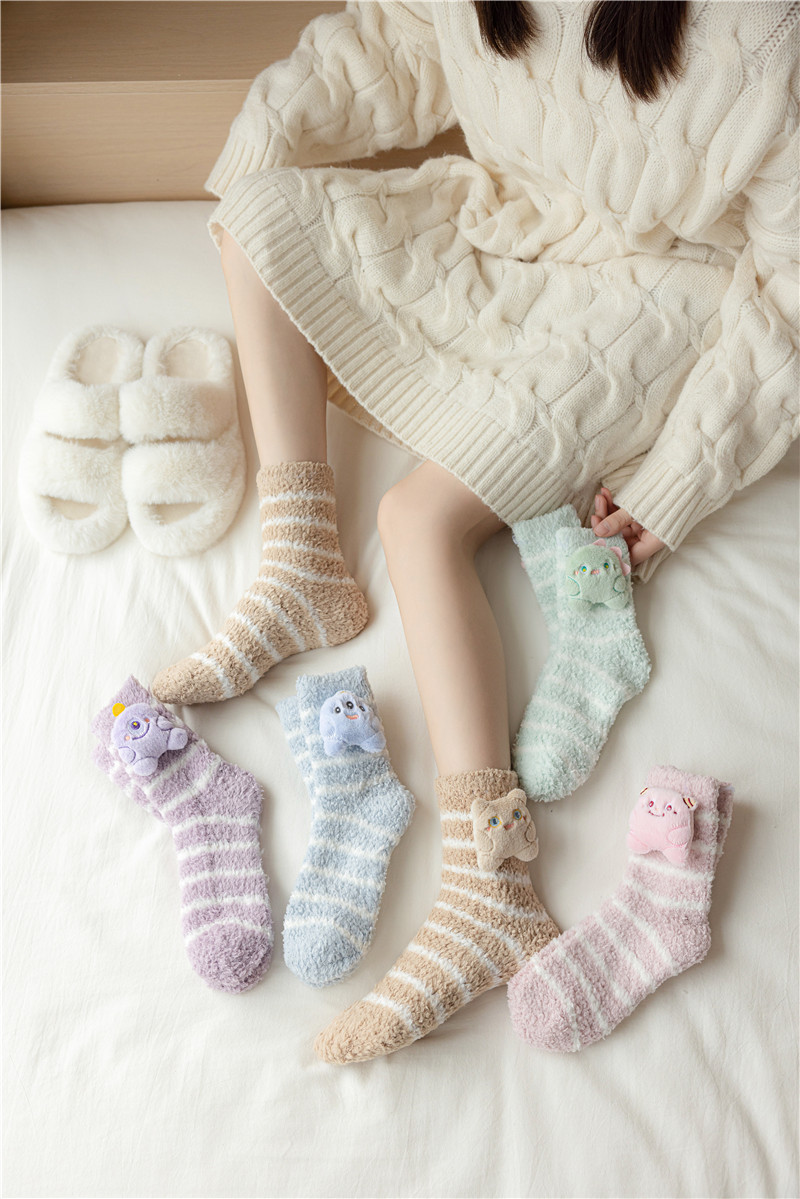 스트라이프 산호 양털 여성용 미드 튜브 양말 여성용 겨울 두꺼운 따뜻한 바닥 양말 만화 귀여운 인형 수면 양말