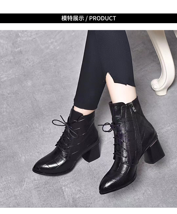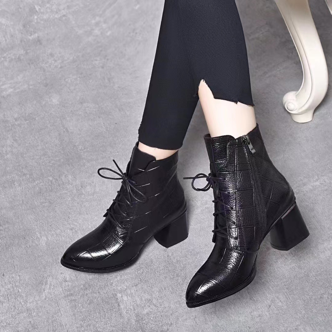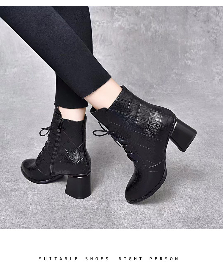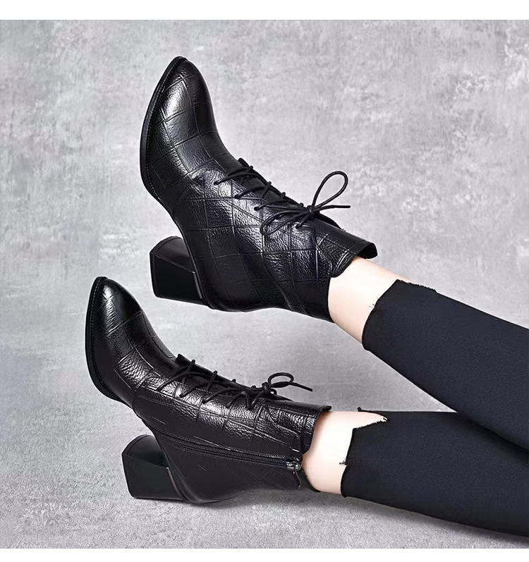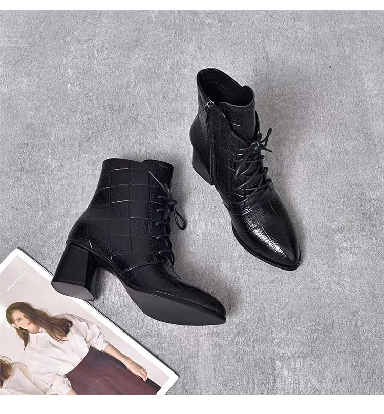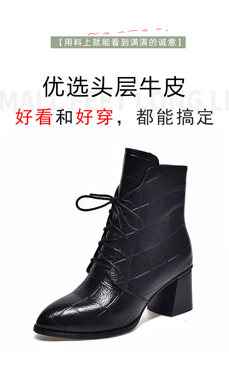 격자 무늬 소가죽 두꺼운 굽 뾰족한 발가락 부츠 여성용 정품 가죽 한국식 미드 힐 부츠 겨울 기모 앵클 부츠 모든 경기 패션 부츠스토어 가기