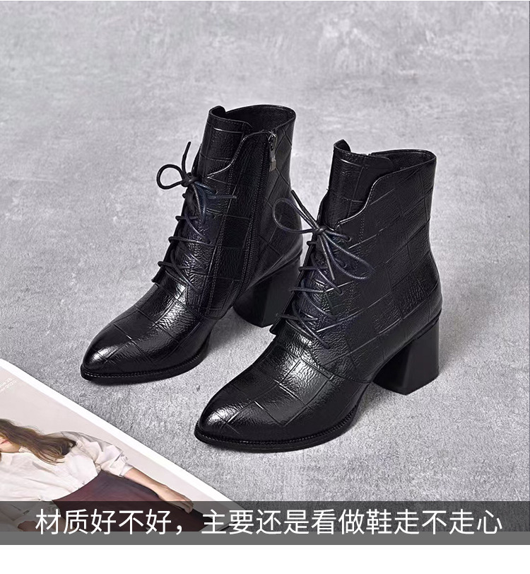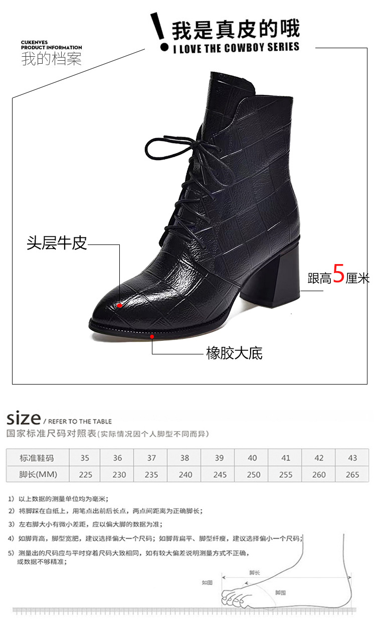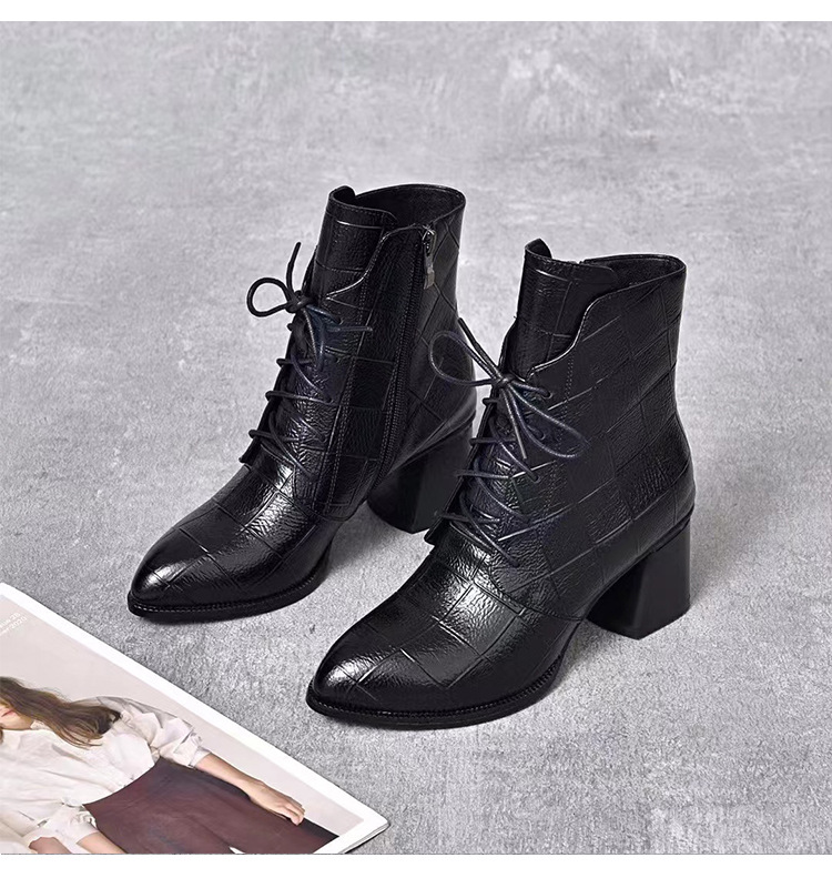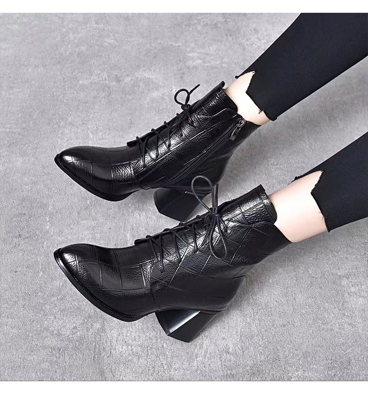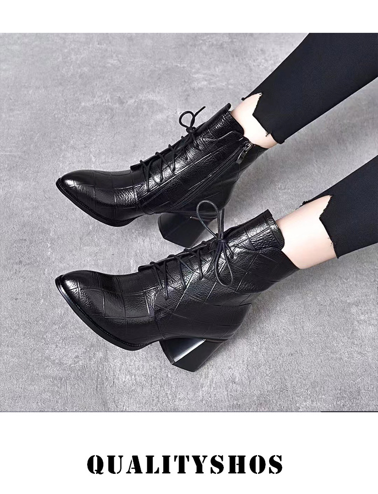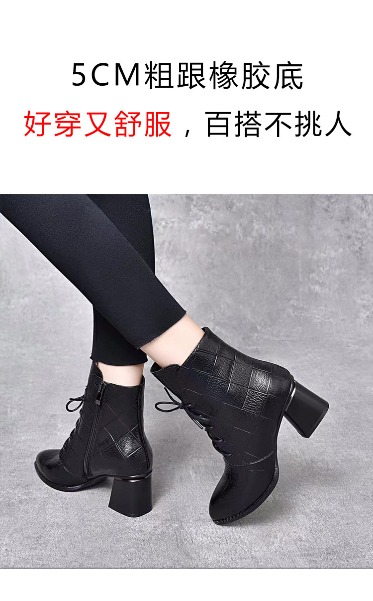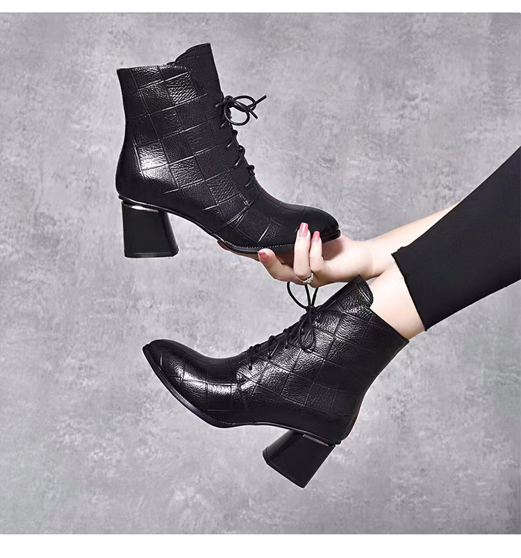격자 무늬 소가죽 두꺼운 굽 뾰족한 발가락 부츠 여성용 정품 가죽 한국식 미드 힐 부츠 겨울 기모 앵클 부츠 모든 경기 패션 부츠스토어 가기