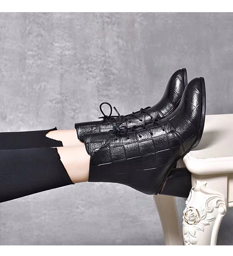 격자 무늬 소가죽 두꺼운 굽 뾰족한 발가락 부츠 여성용 정품 가죽 한국식 미드 힐 부츠 겨울 기모 앵클 부츠 모든 경기 패션 부츠