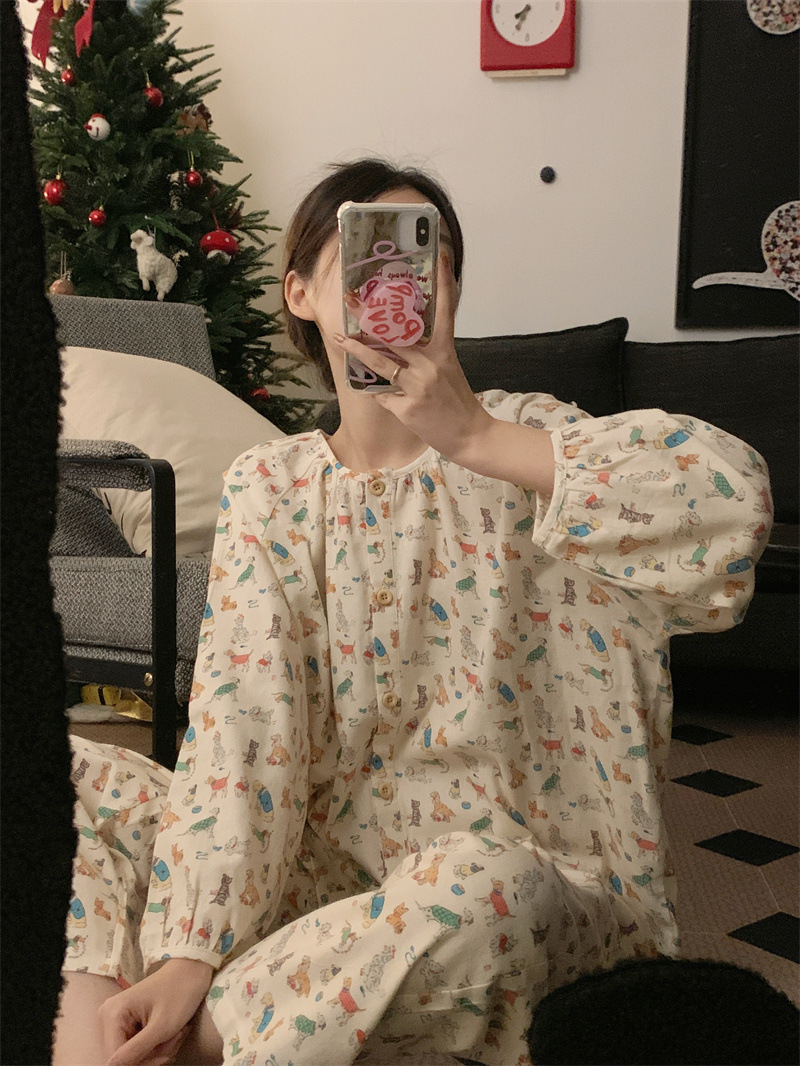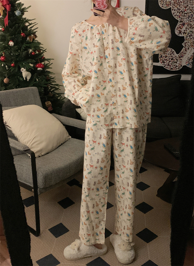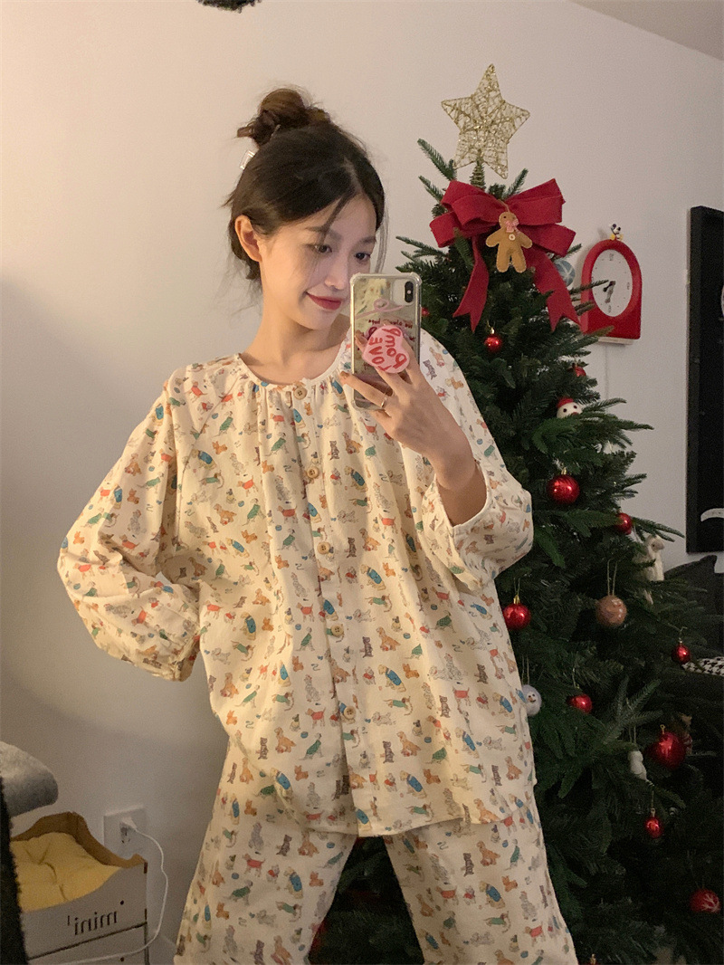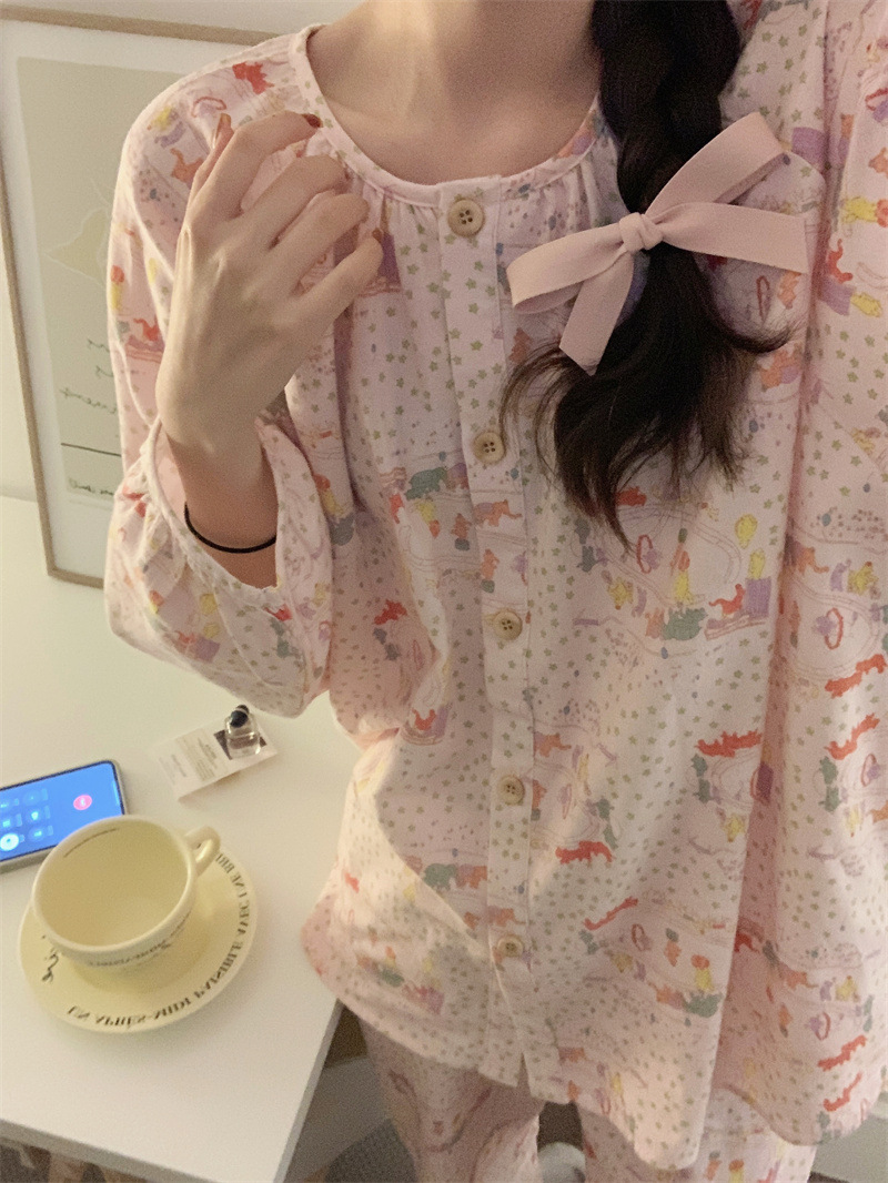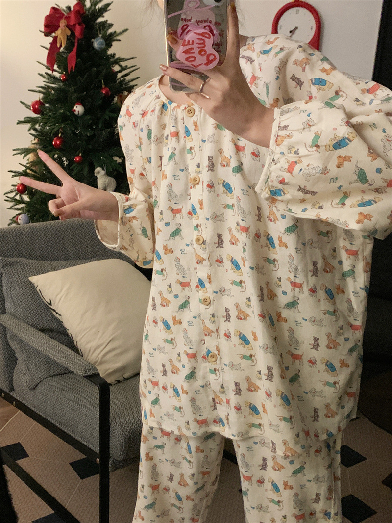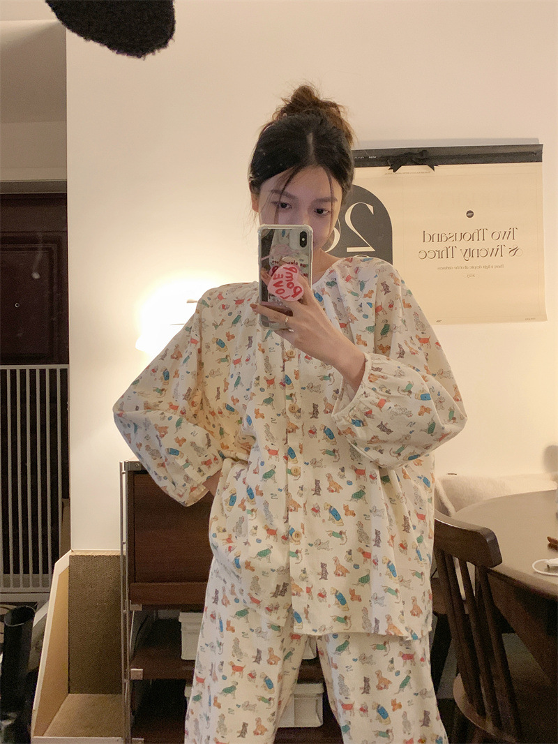 2023 가을 만화 동물 공원 귀여운 컬러 스크럽 가정 옷 잠옷 세트 잠옷 여자