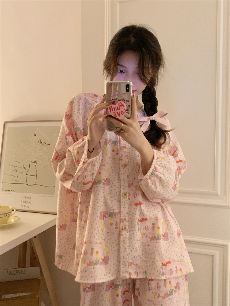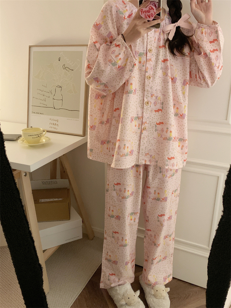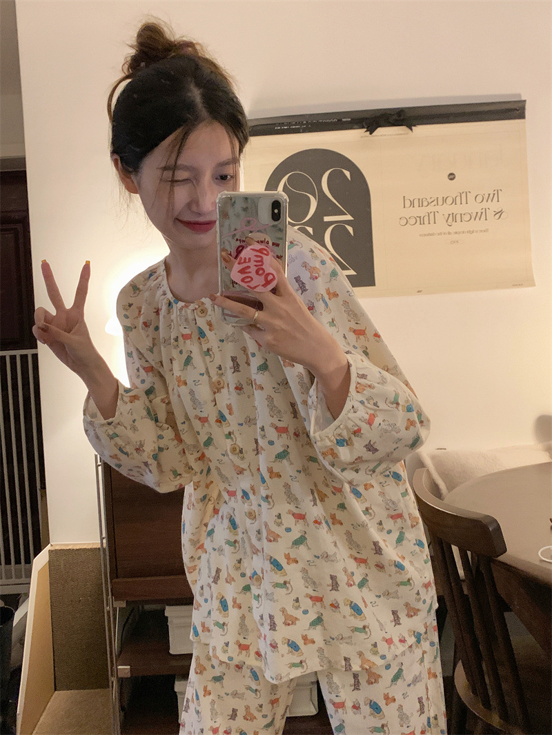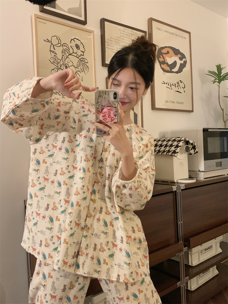 2023 가을 만화 동물 공원 귀여운 컬러 스크럽 가정 옷 잠옷 세트 잠옷 여자스토어 가기