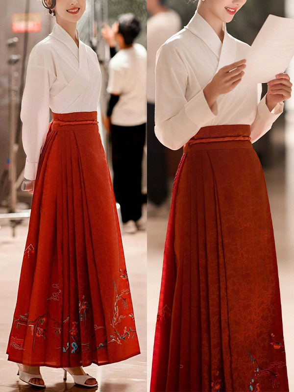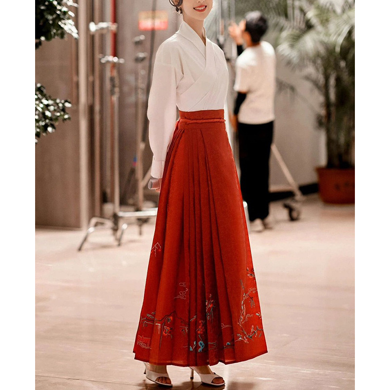 토리노 2023 가을 새로운 중국 스타일 중국 스타일 Hanfu 최고 빨간 자수 말 얼굴 스커트 긴 치마 세트 여성스토어 가기