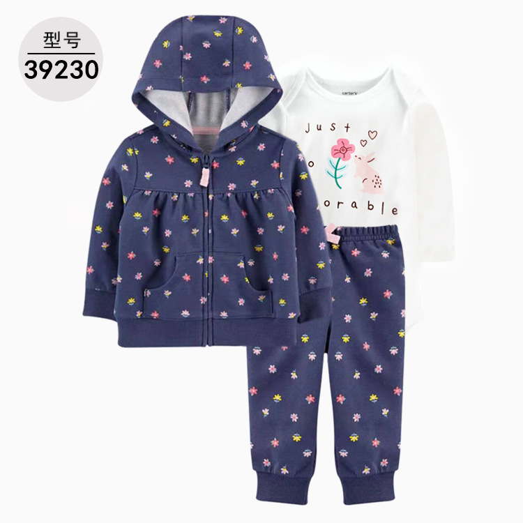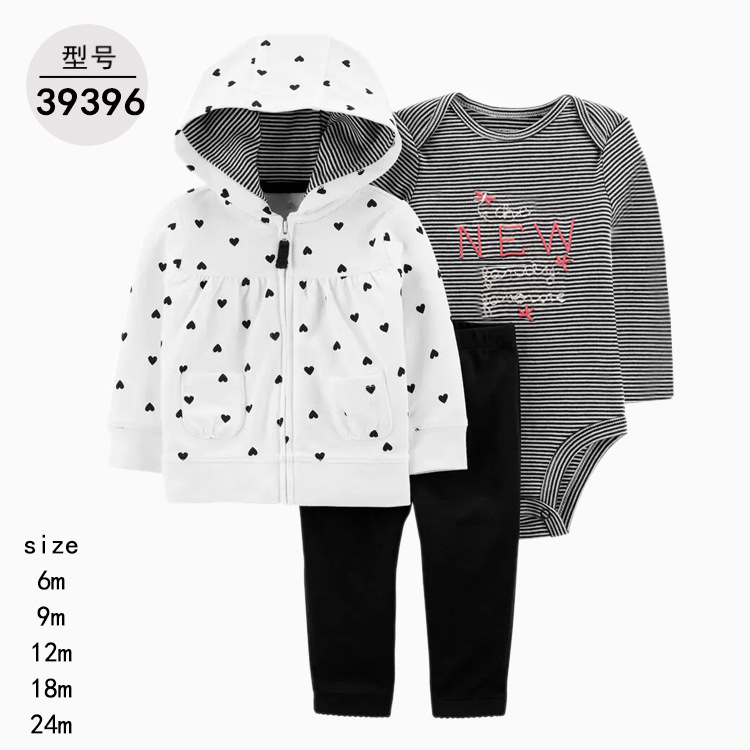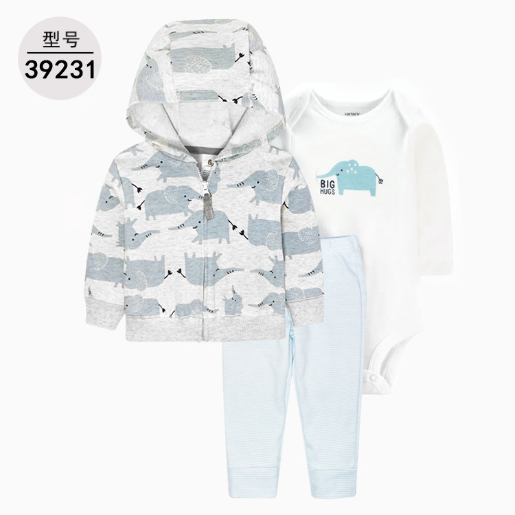 幼婴儿童装棉三件套。连帽外套+长袖(短袖)三角哈衣+棉长裤(不可开档)。卡通条纹动物字母,质地非常柔软亲肤。男女宝宝款都有,多色可选。衣服厚度为普通厚度,春秋天款,棉A类面料,对人体无,可以放心给宝宝哦。