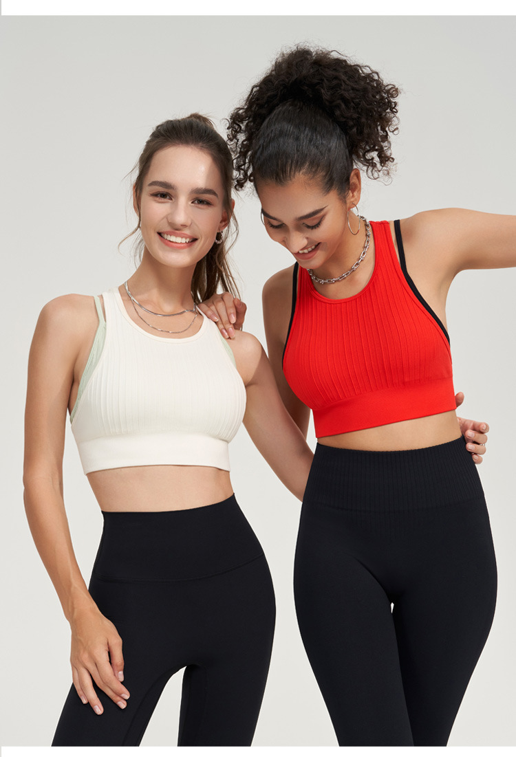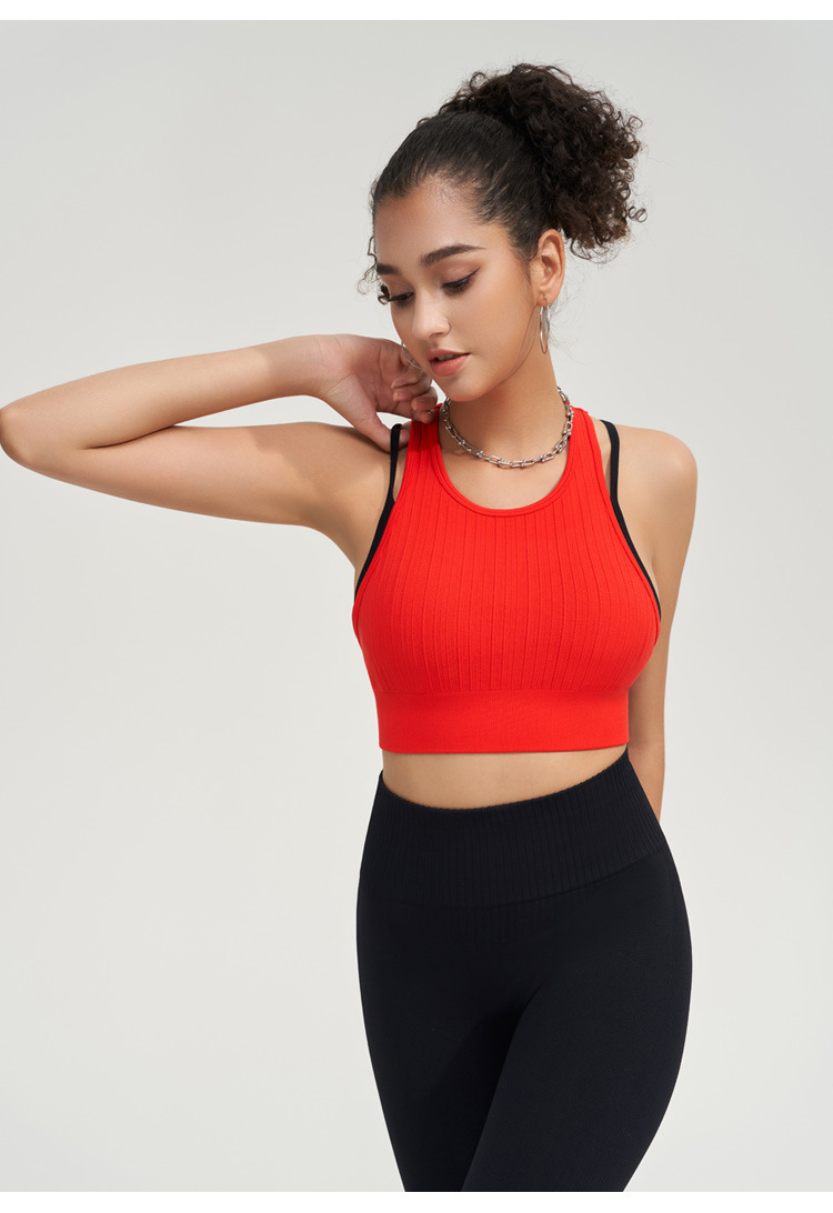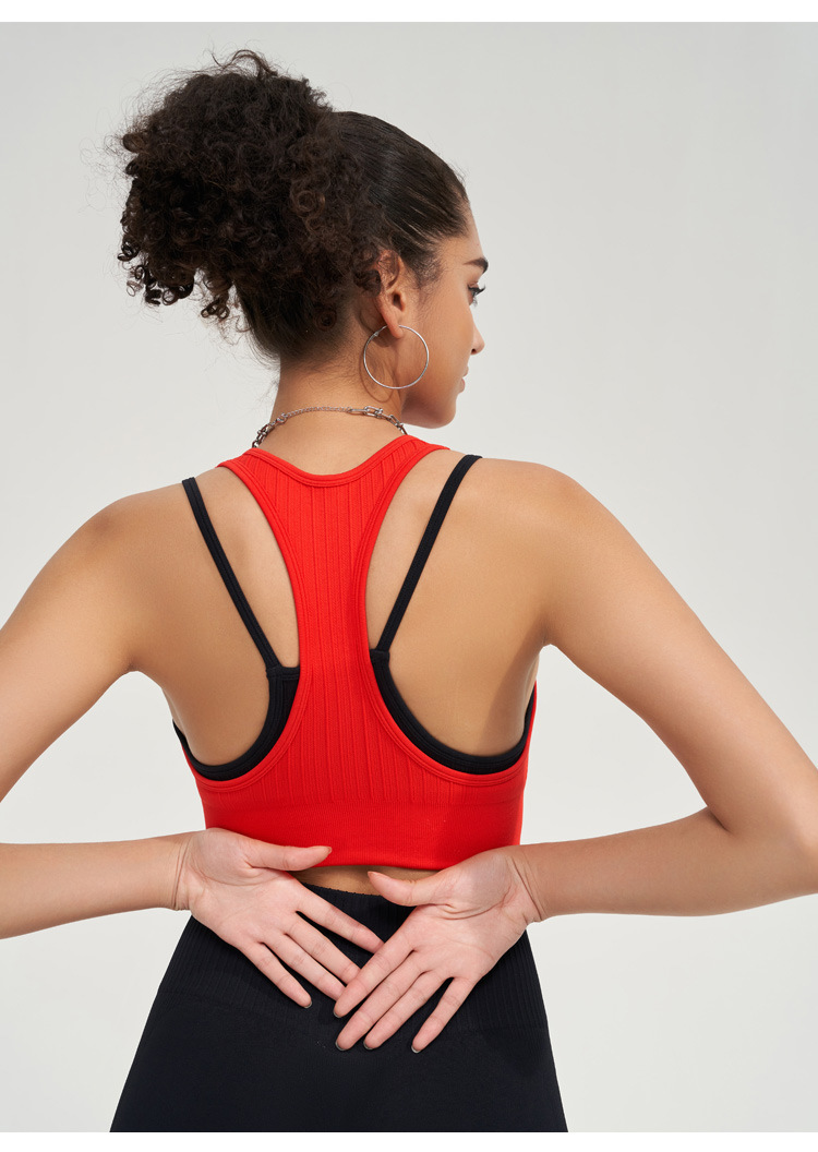 가짜 투피스 조끼 대조 색상 스포츠 속옷 여성용 고강도 충격 방지 땀 흡수 가슴 패드가있는 피트니스 요가 조끼스토어 가기