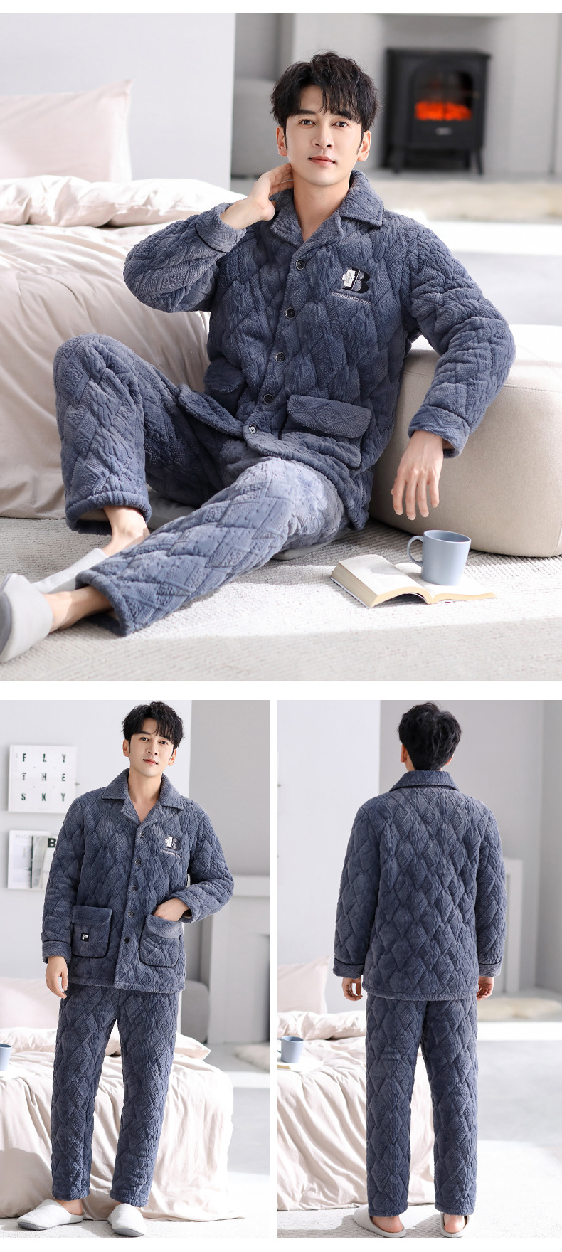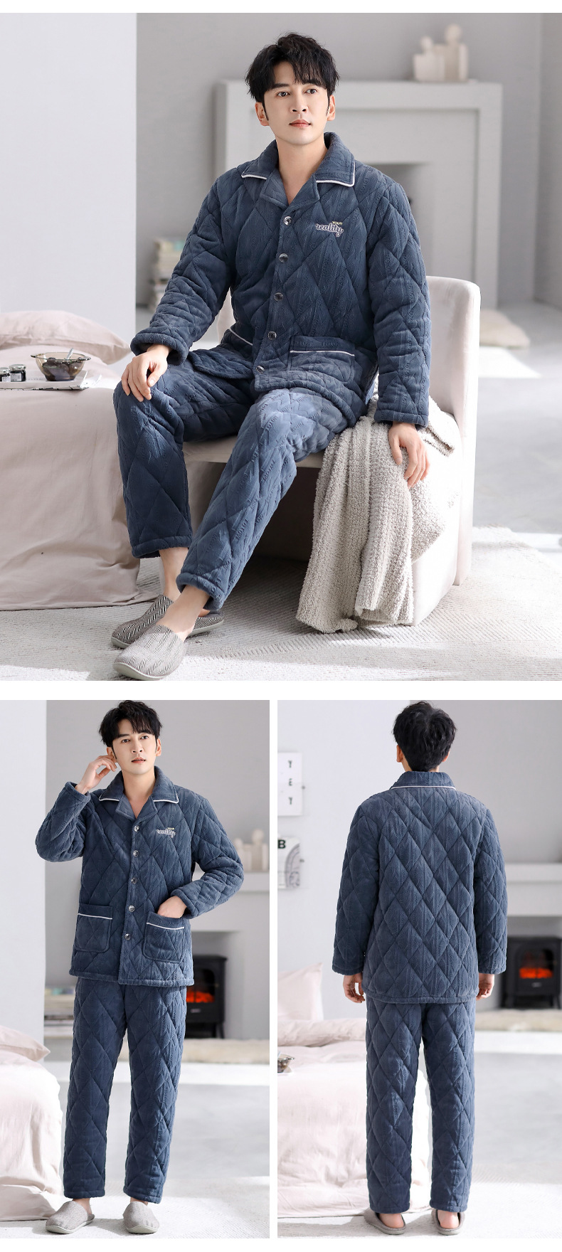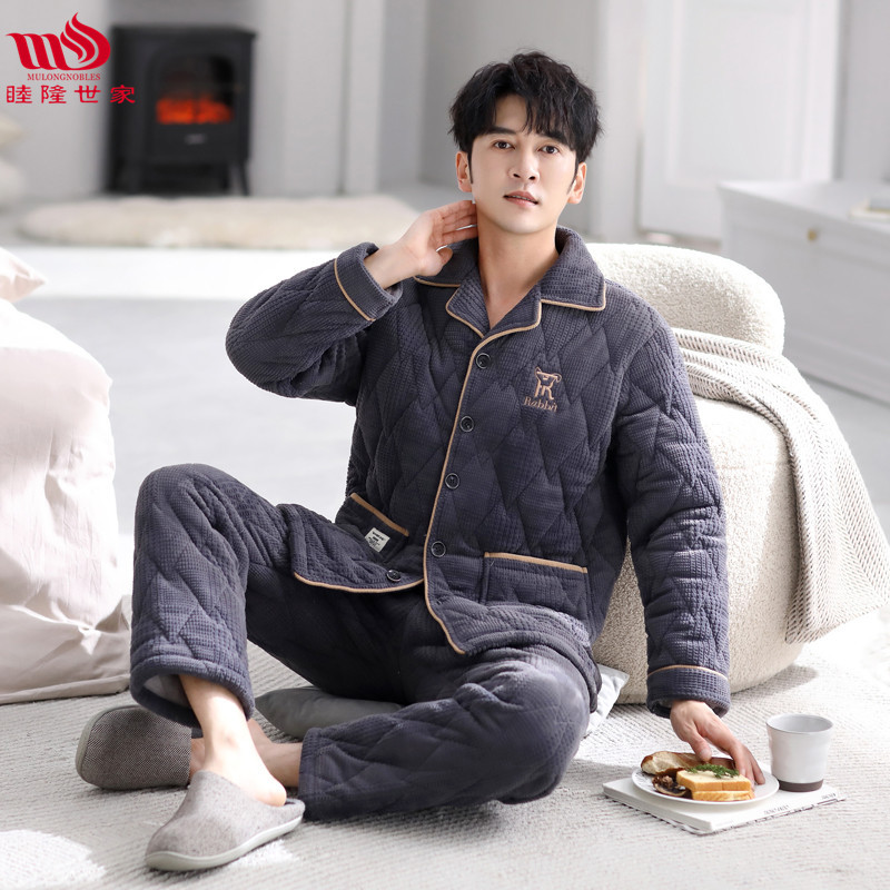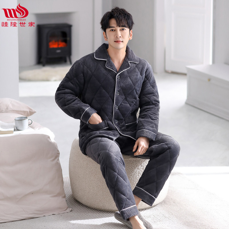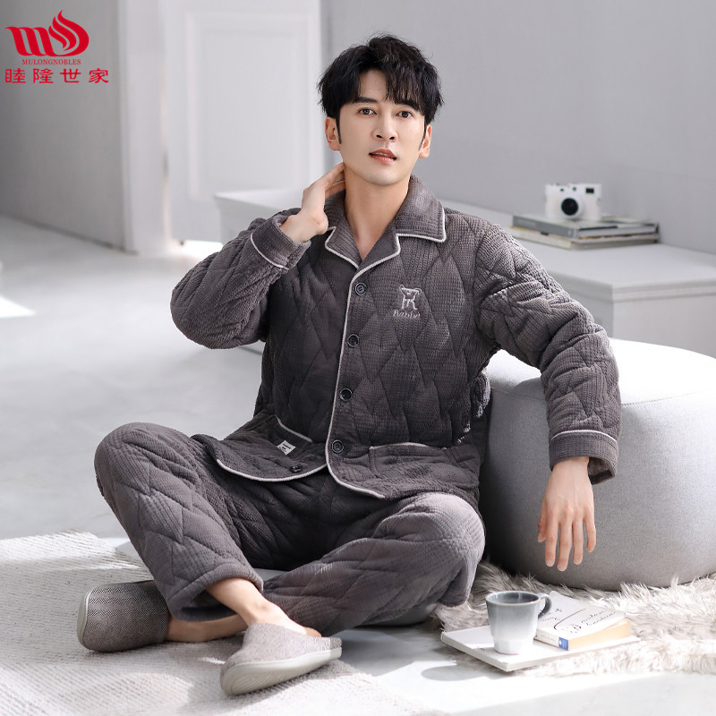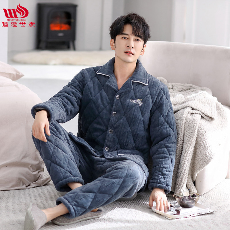 Mulong 귀족 가족 잠옷 남자의 겨울 산호 양털 3 층 두꺼운 기모 면 패딩 재킷 플란넬 가정 의류 가을과 겨울