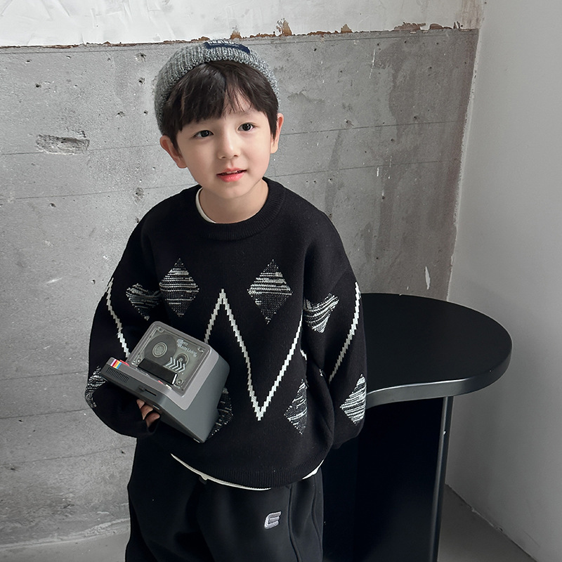 [클리어아웃 세일] 아동용 따뜻한 스웨터 한국어 버전 2024 겨울 스타일 소년 두꺼운 마름모 라운드 넥 스웨터 트렌디