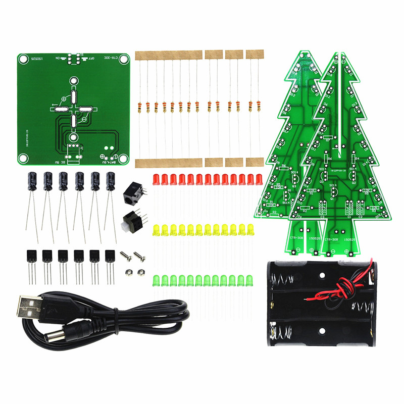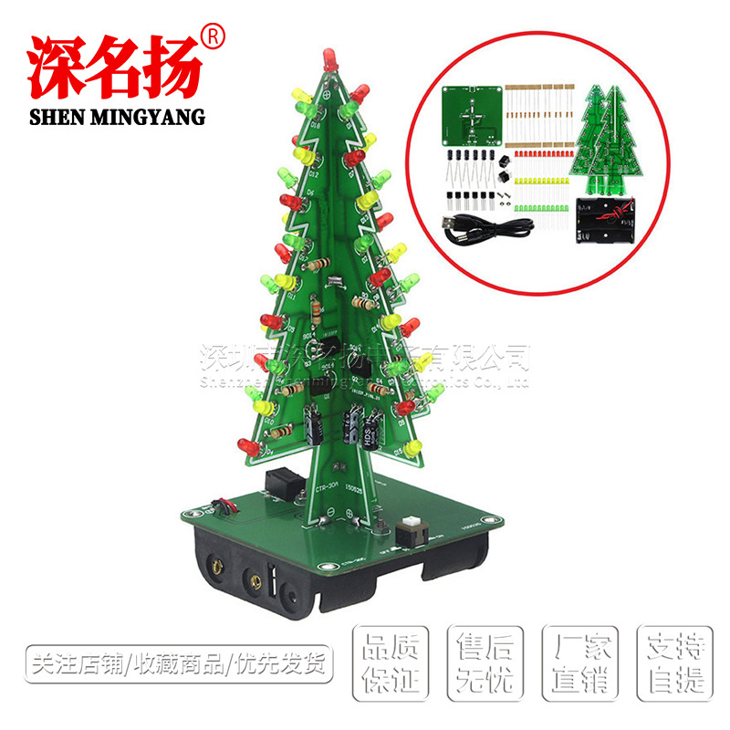 CTR-30闪光圣诞树套件由三块电路板组合而成,用户通过自己焊接组装,让37只LED交替闪烁,在空间里呈现出圣诞树立体的轮廓(夜晚环境下观看效果更佳)。