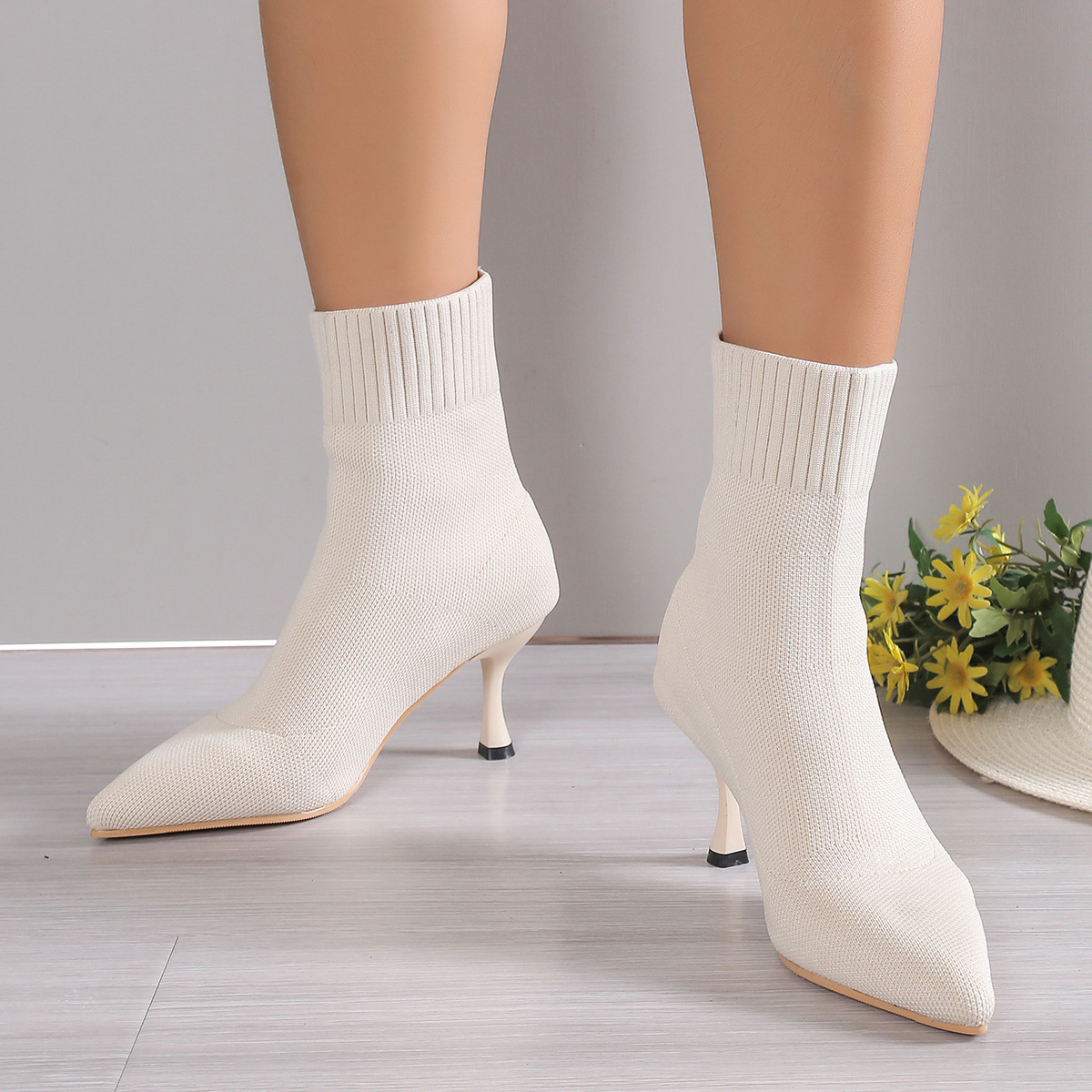 유럽 및 미국 대외 무역 플러스 사이즈 2024 얇은 부츠 여성용 하이힐 쇼트 부츠 니트 가을 및 겨울 싱글 부츠 포인팅 발가락 얇은 굽 신발 여성용 부츠