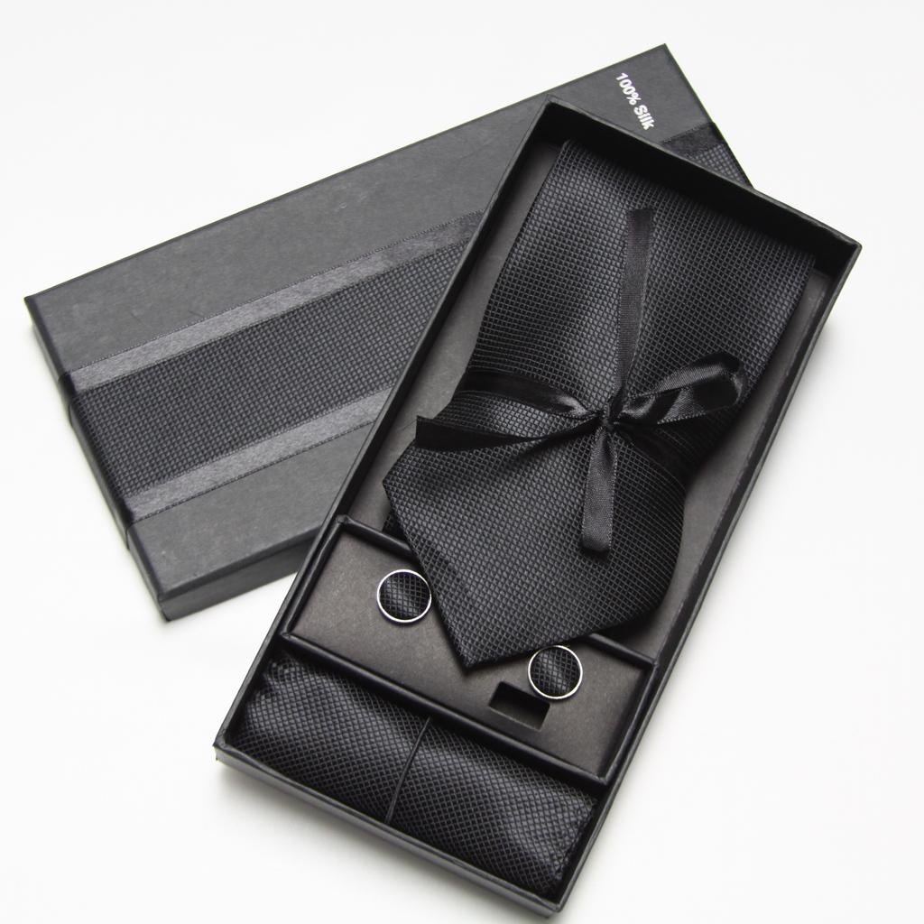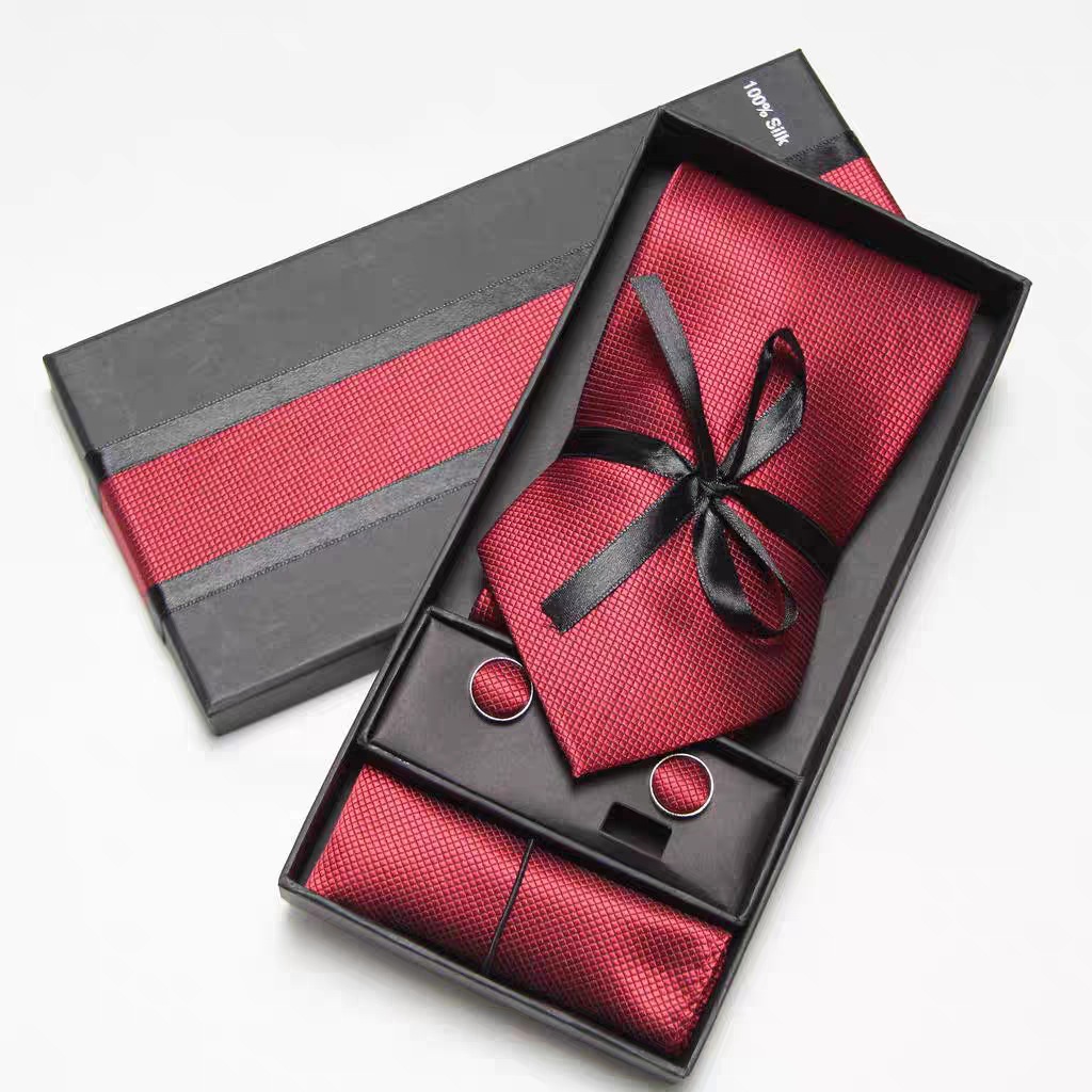 此款领带套装包含领带、袖扣、口袋巾、礼盒