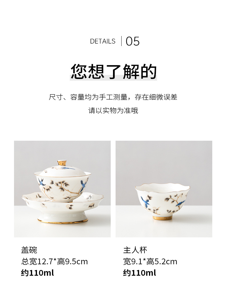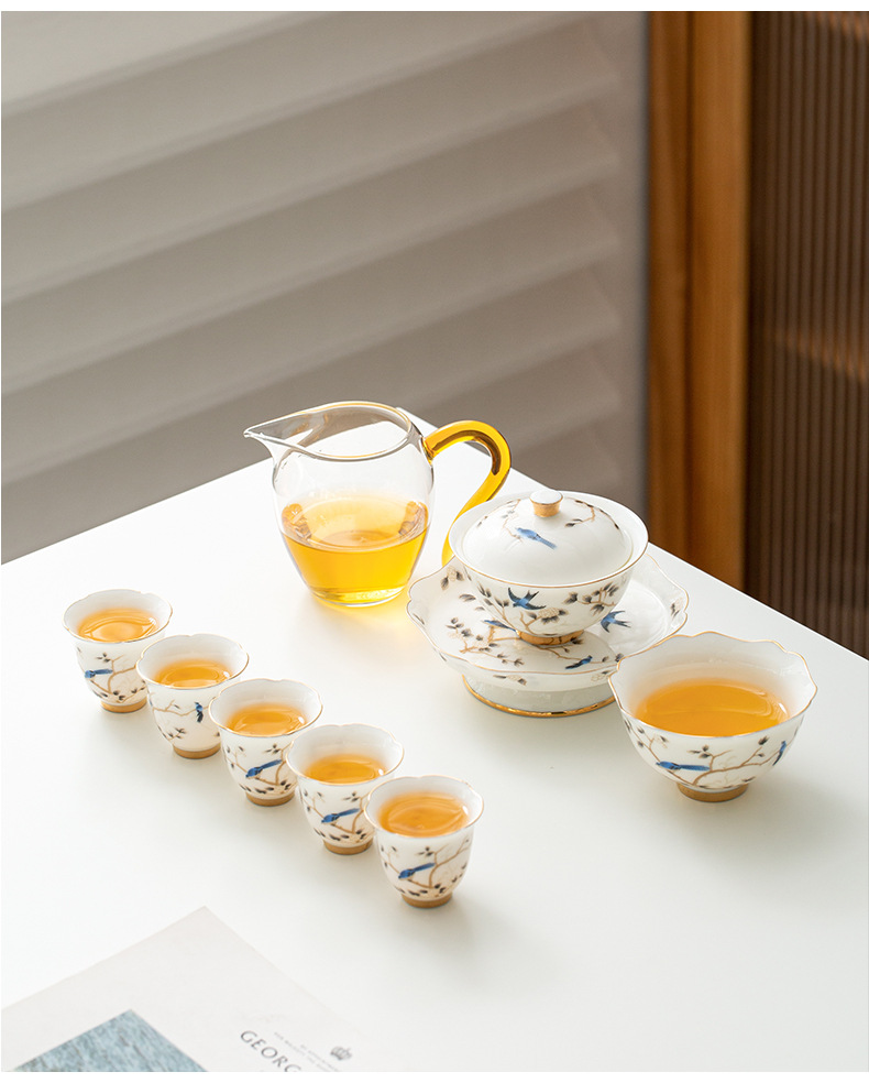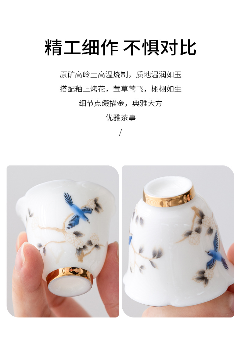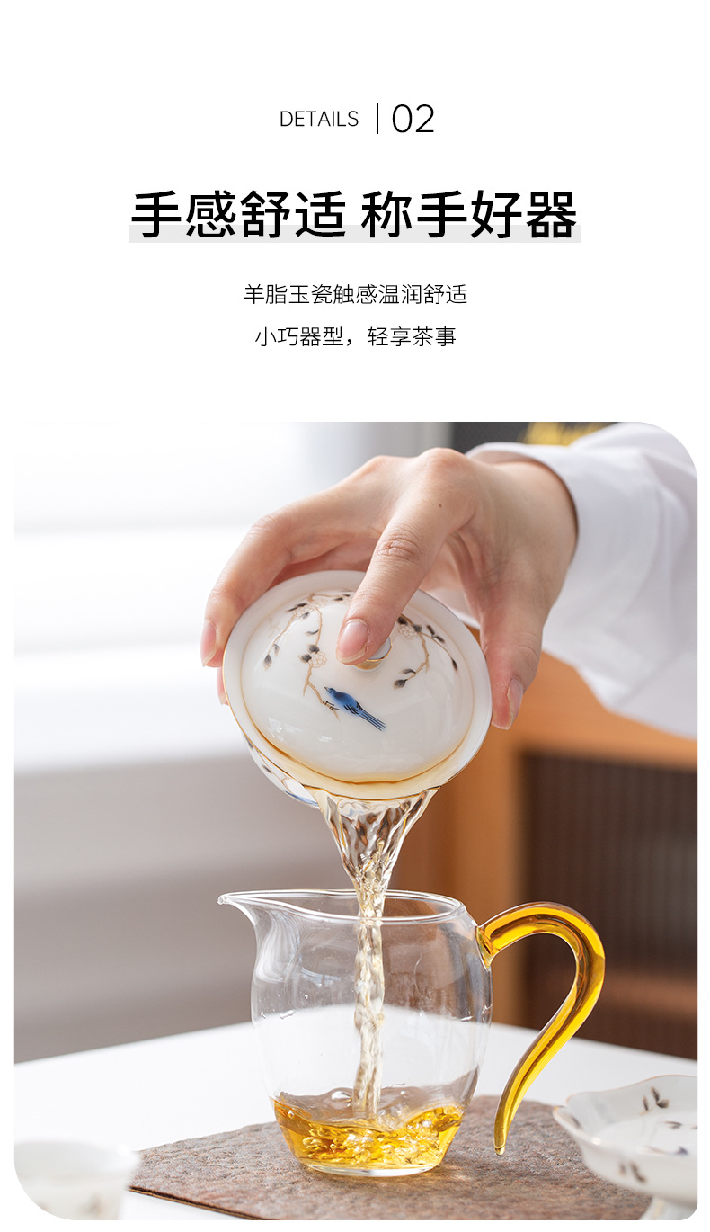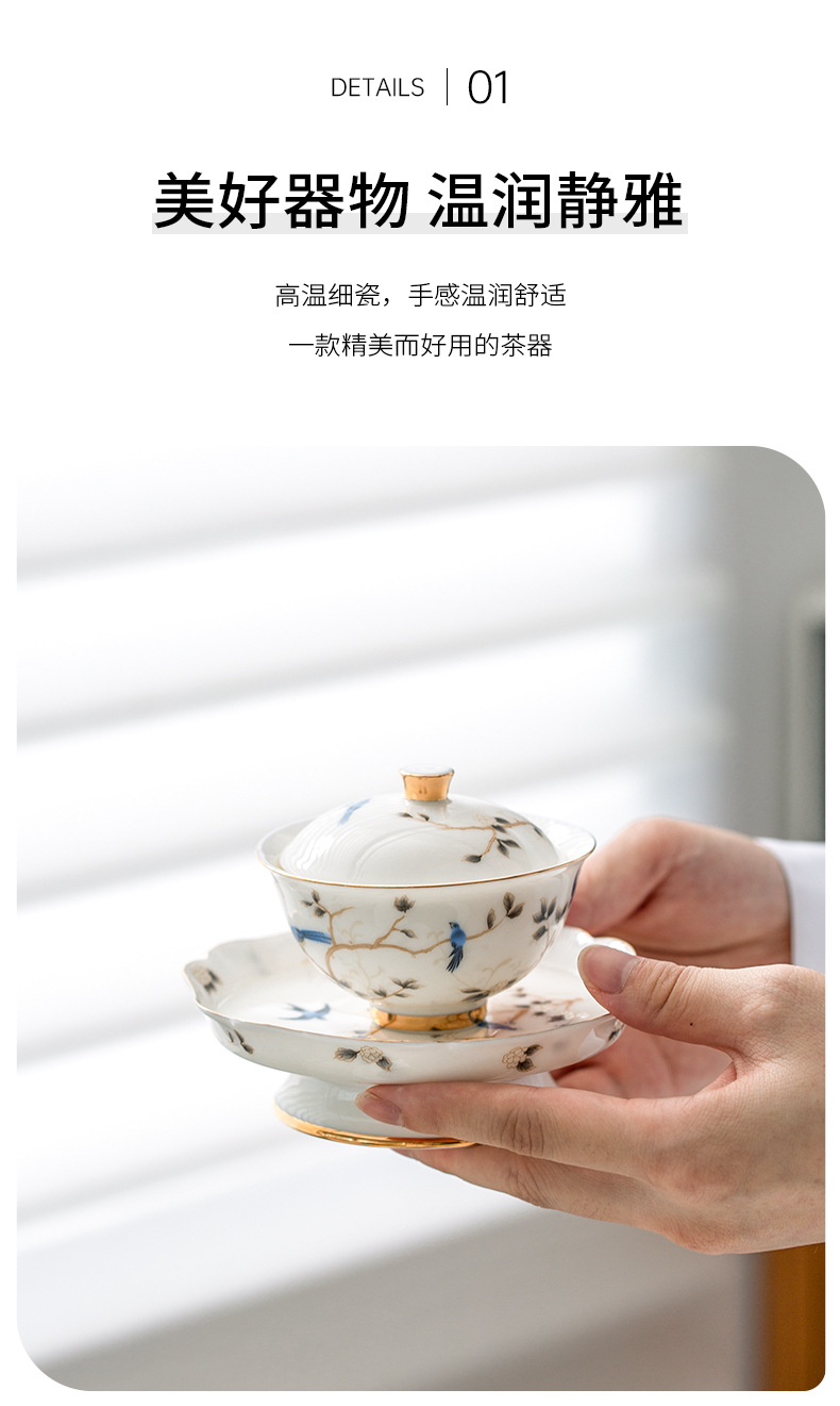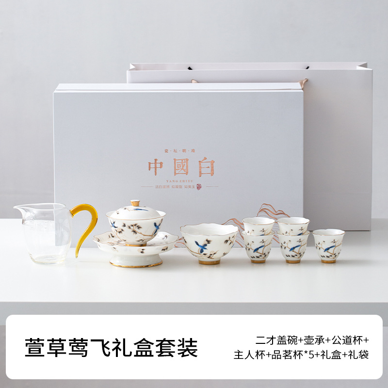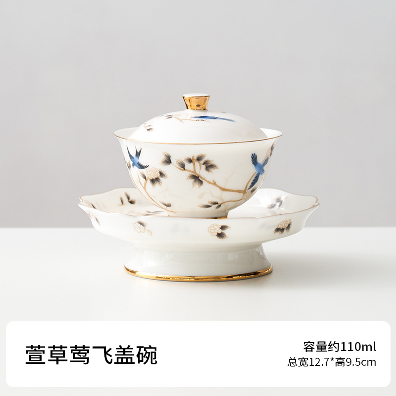 萱草莺飞高档羊脂玉白瓷三才盖碗家用精致功夫茶碗茶杯套装礼盒装