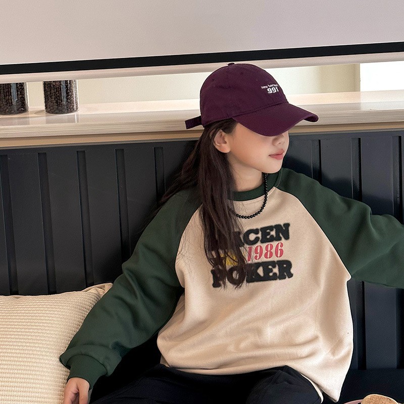 봄과 가을 여아 트렌디 한 편지 인쇄 컬러 블록 느슨한 캐주얼 스웨터 대형 어린이 라글란 소매 긴팔 탑 티셔츠